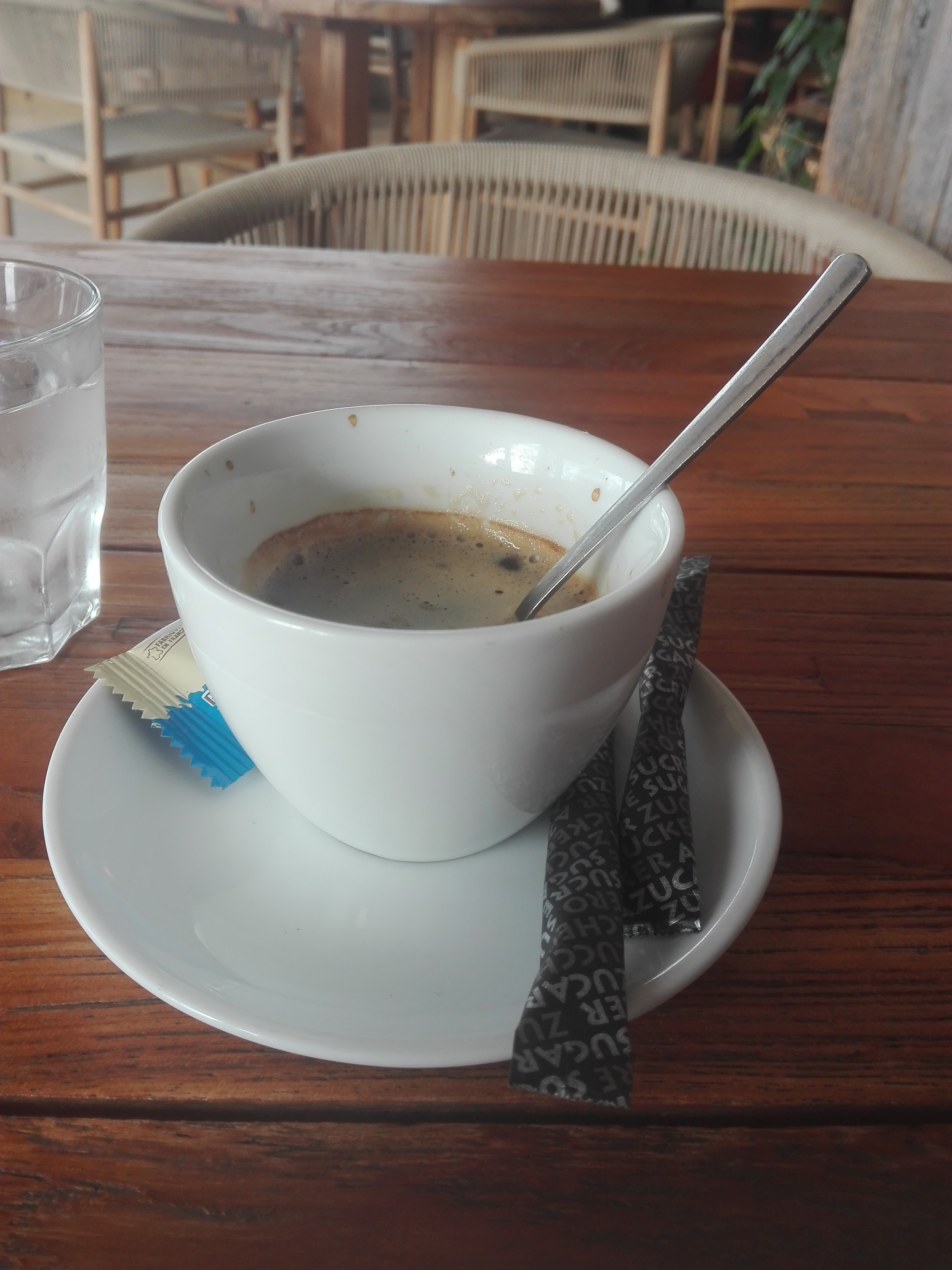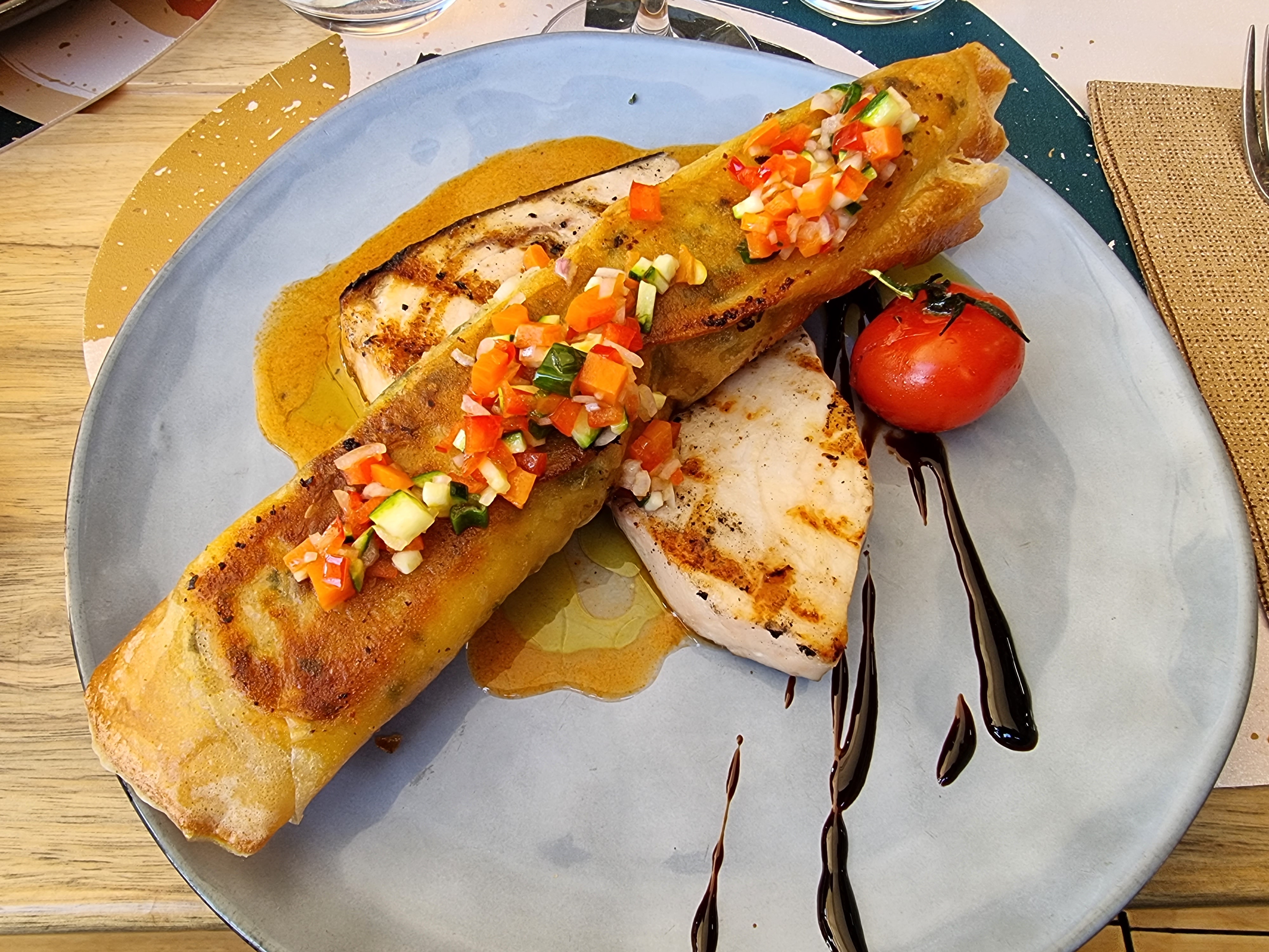 Une bonne surprise ! Une daurade grillée parfaitement cuite, riz et petits légumes goûteux, là aussi avec une cuisson maîtrisée. Le vin blanc au verre fut en très bon accord avec le plat. Le service était pas mal, si je peux me permettre un conseil, vu la qualité générale de l'établissement, apprenez à connaître les vins que vous proposez et ce sera pas loin d'être parfait 😉