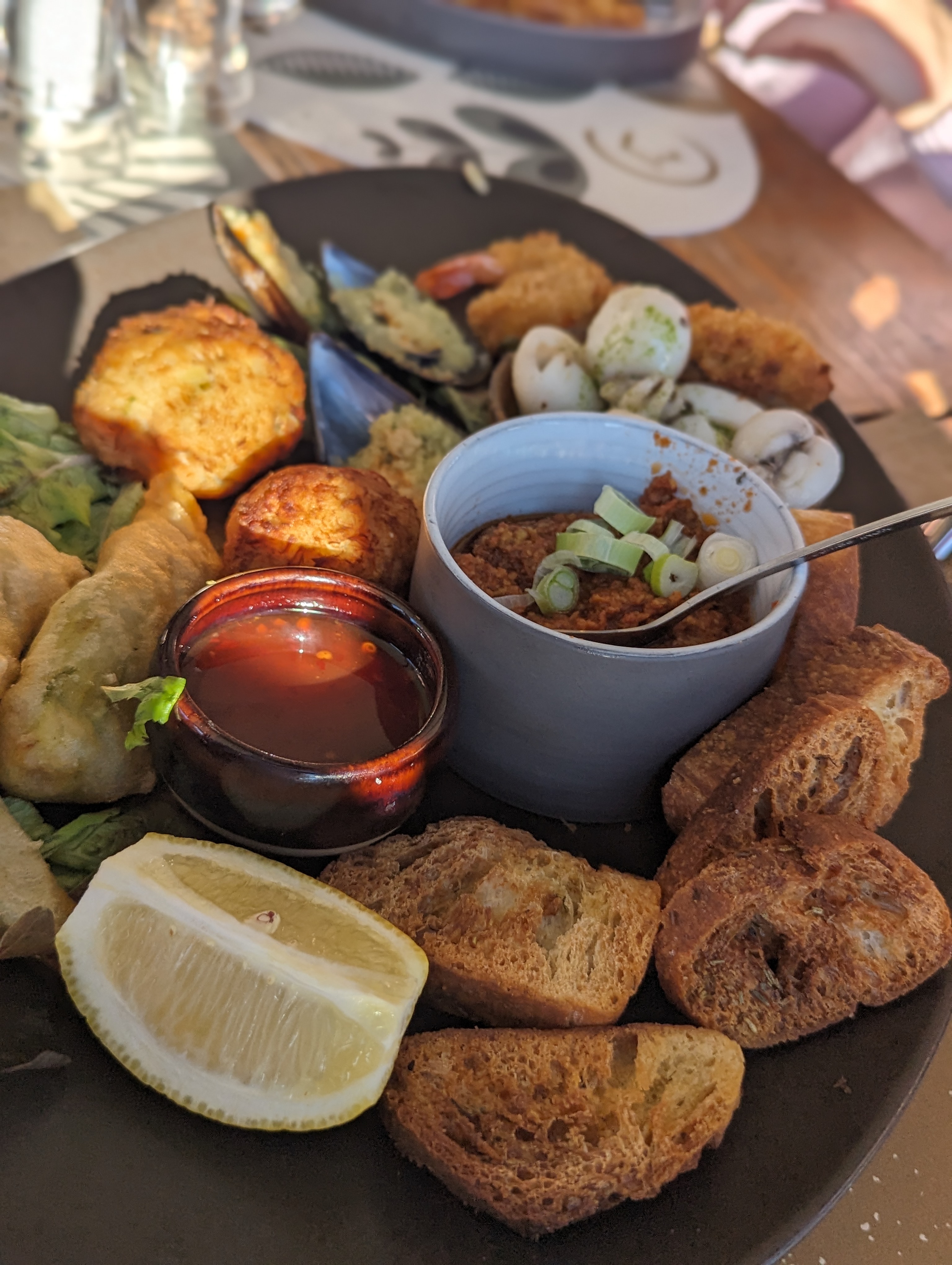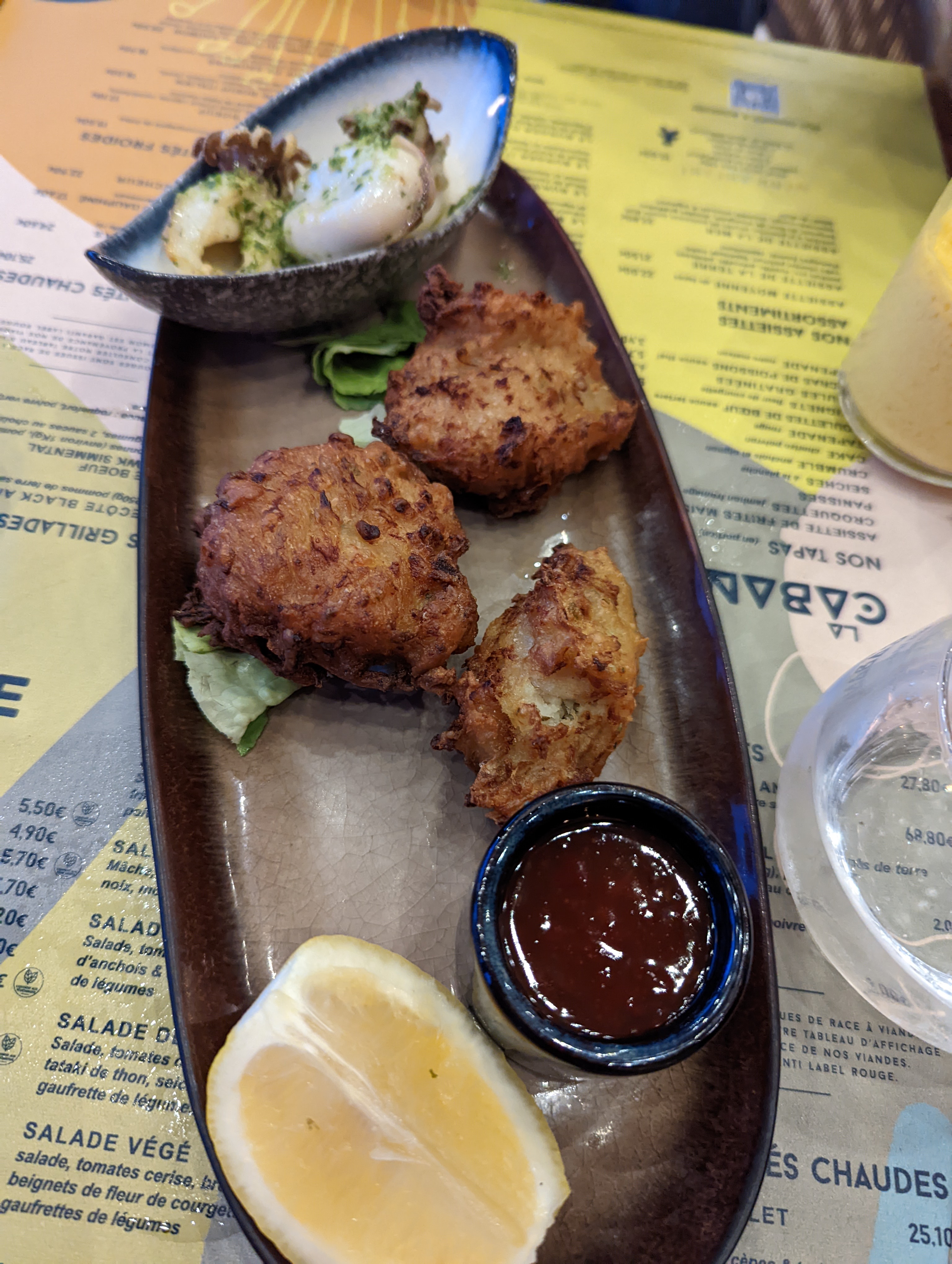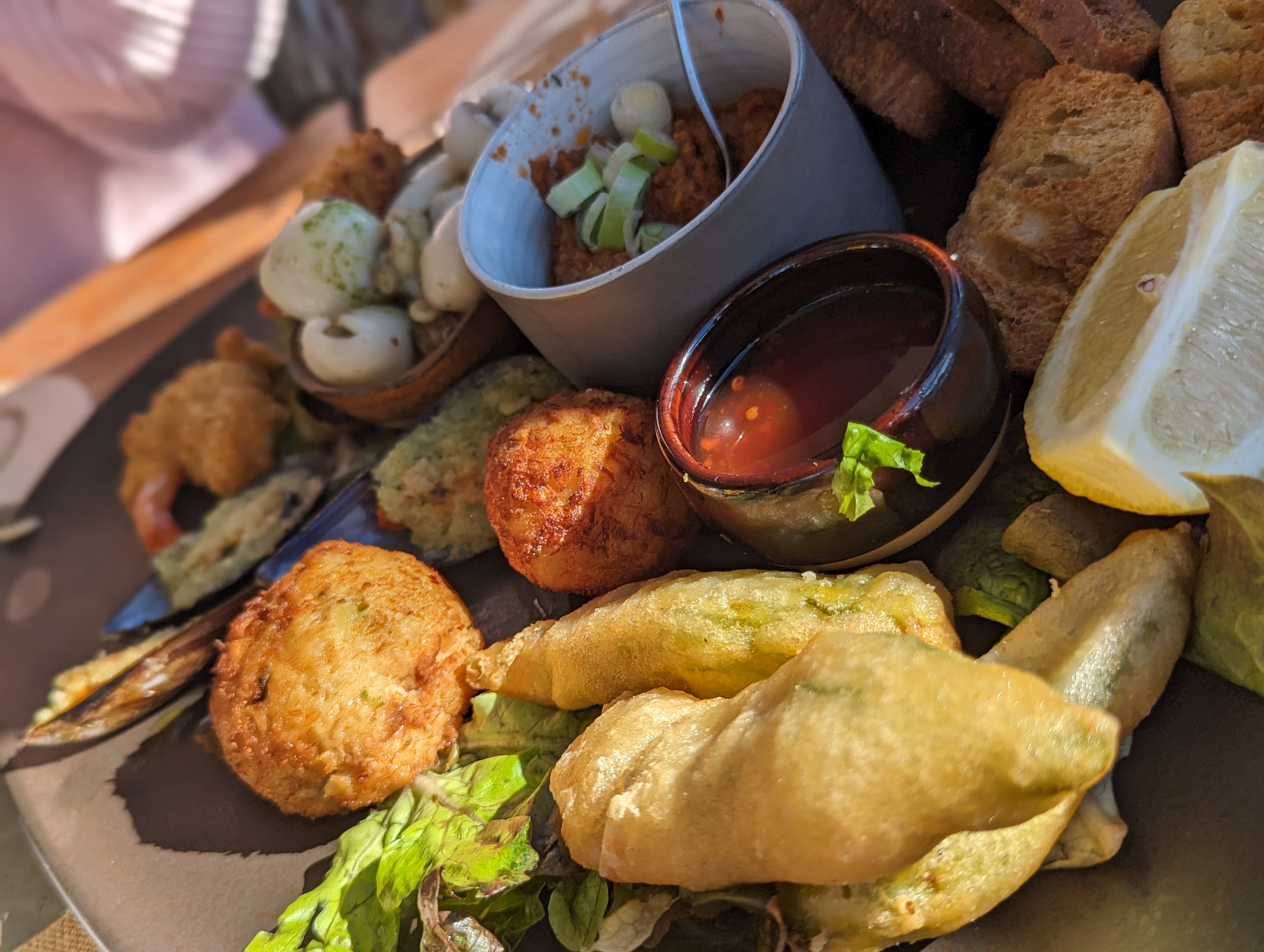 Tapas beignets de courgettes extras et plats de poisson super frais également. Qualité à prix raisonnable, accueil chaleureux et bonne ambiance semi-bar. Un grand plus: service continu alors que beaucoup d'autres restos des environ ferment à 14h. Bravo !