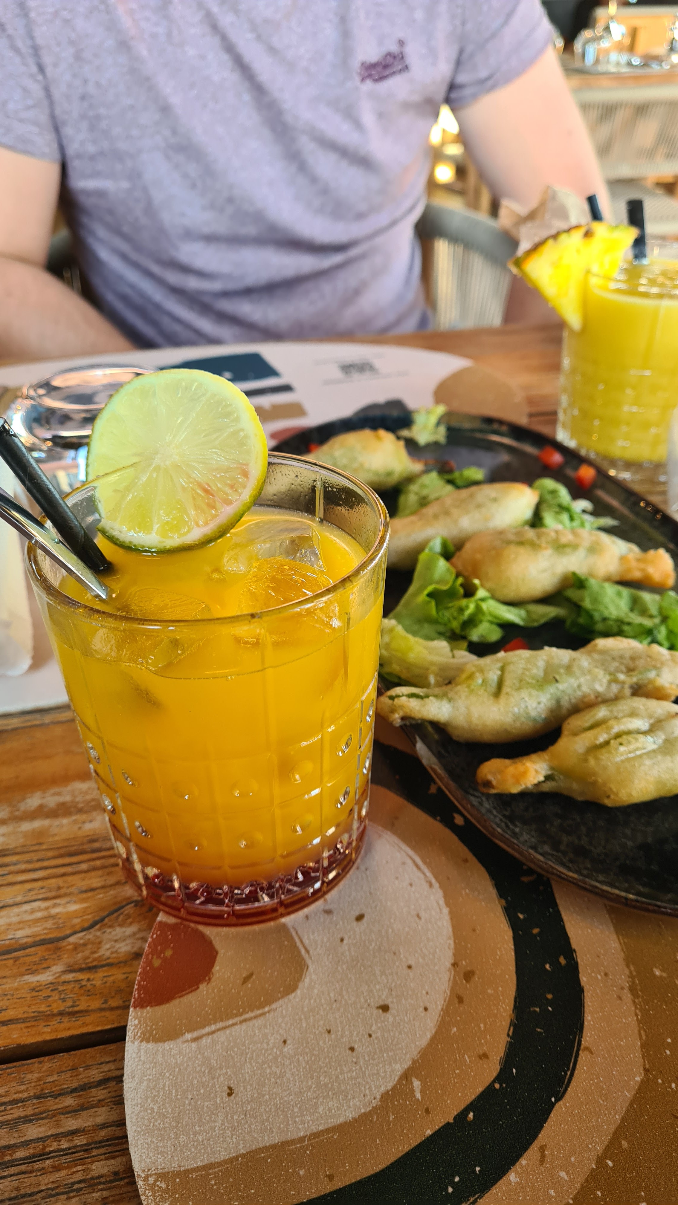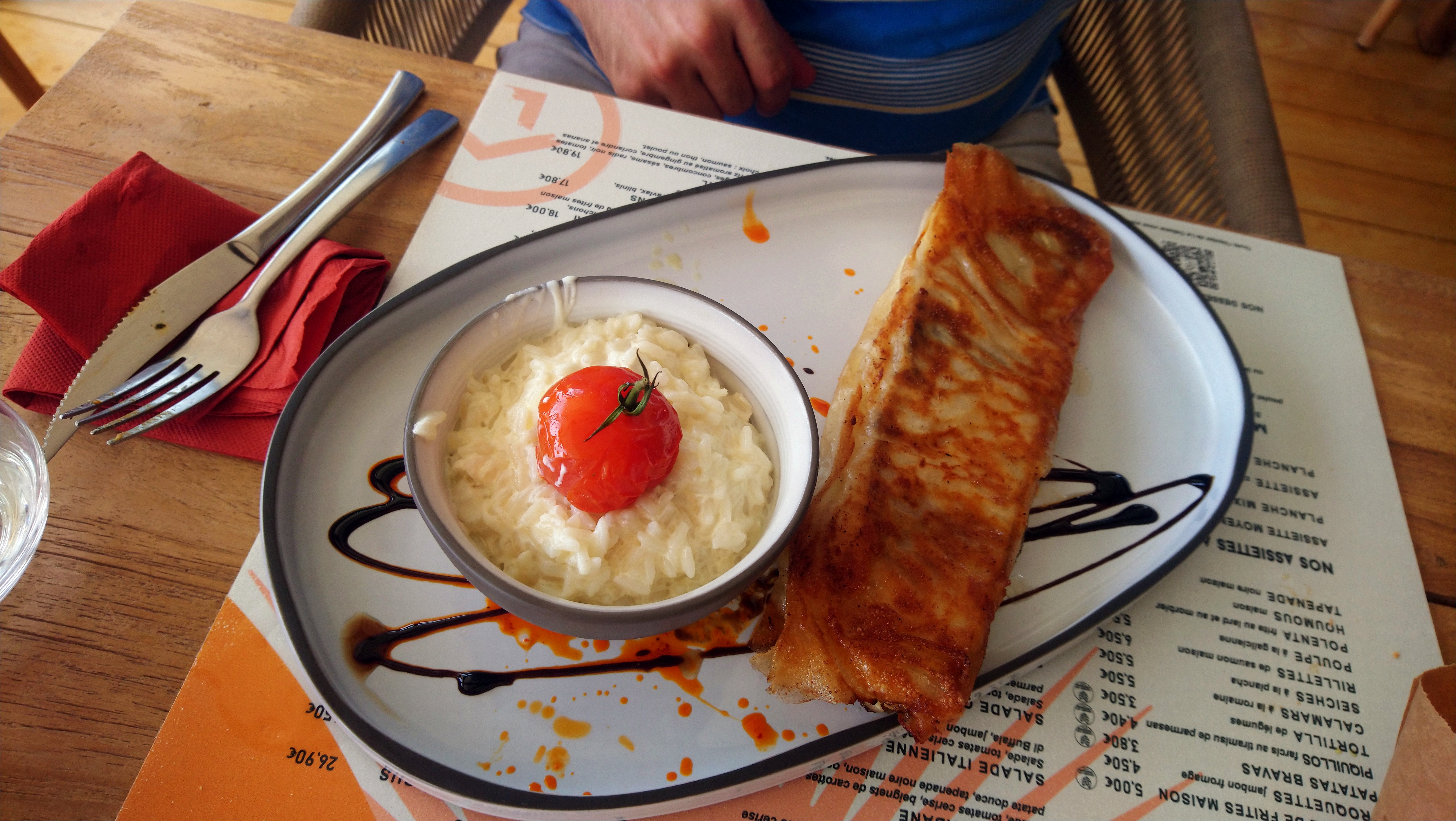 Aperitif:Sangria et Mojito.à éviter aucun goût à se demander si il y avait de l'alcool dans les deux.Insipide. Tapas bons Panisse,sepias (3) et tapenade ( copieuse et bonne) Plats tartare de thon et risotto de gambas.copieux mais manque d'assaisonnement.le riz du risotto n'est pas un riz spécial risotto, le tartare coupé beaucoup trop gros,pas de saveur. Dessert 2 boules de glace et un moelleux qui était excellent. Addition 92 e pas pris de vin. Service excellent des 2 jeunes filles et ambiance agréable. Plutôt déçu des plats et surtout des apéros .A croire que celui ou celle qui prépare les apéros n'a jamais été en Espagne.