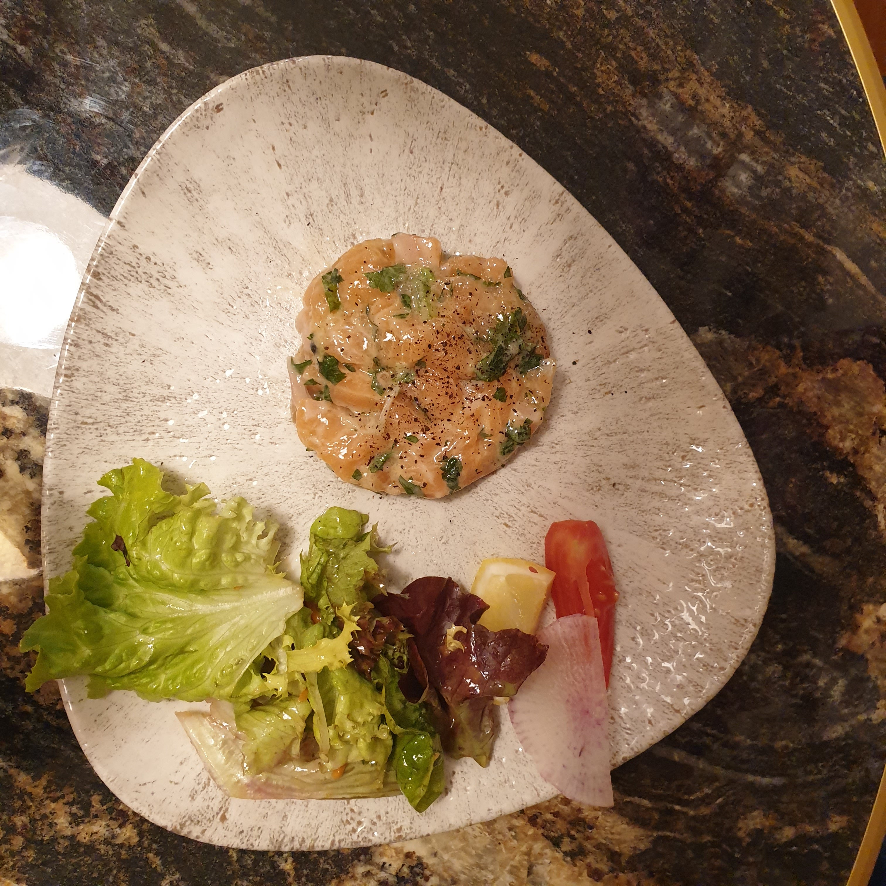 Repas en soirée, salade saumon gravlax, bcp de riz haricot, tomate pas de goût et très peu de saumon et crêpe en dessert décevante et servie froide. Déçue par rapport au prix global peut être moins cher le midi mais emplacement top