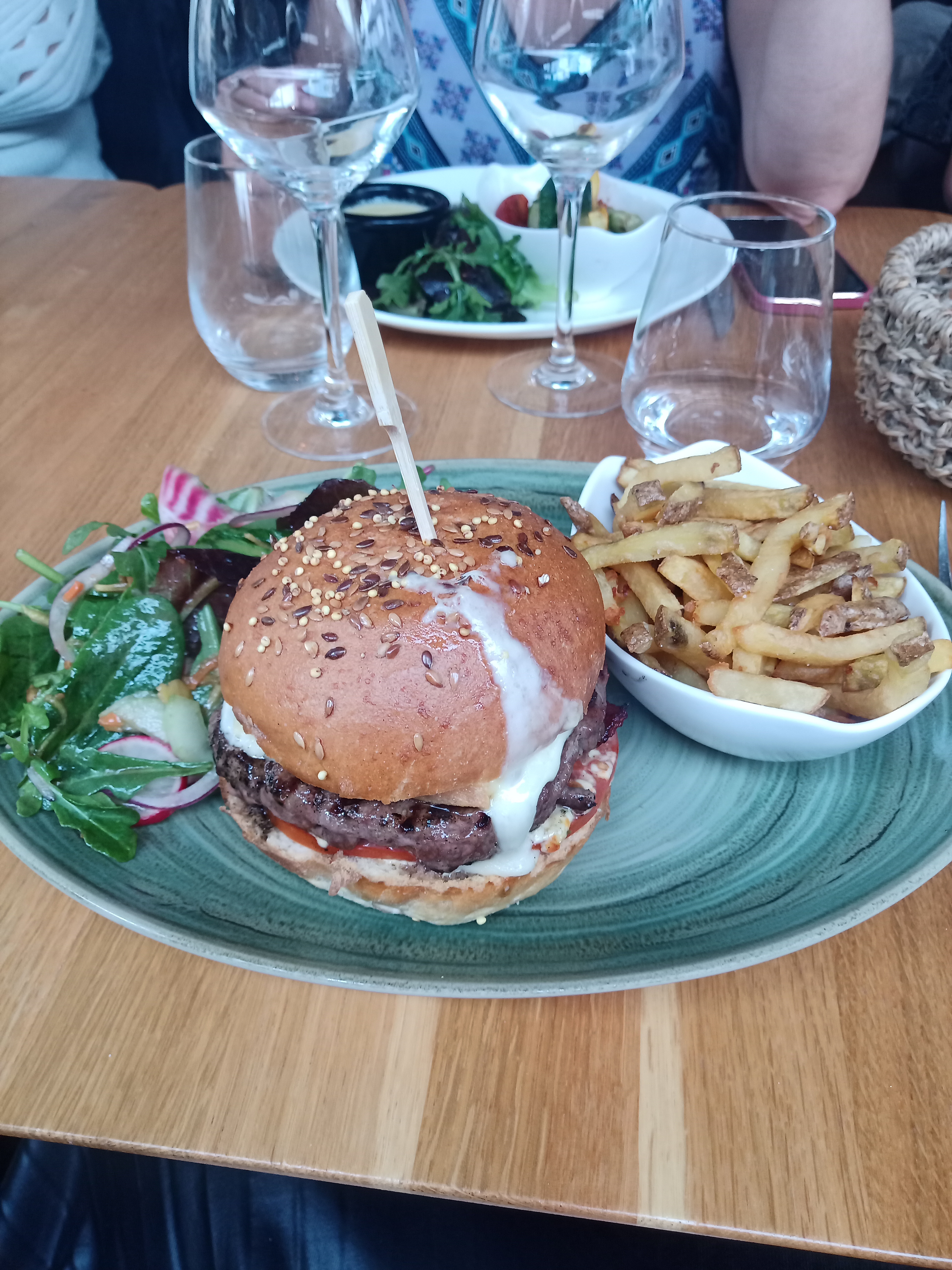 Cadre agréable cependant la terrasse est au bord de la route c'est très bruyant. Notre serveur fût sympathique, par contre le contenant de l'assiette est en inadéquation avec le tarif. La viande était dure, trop cuite bien sur le serveur m'a gentiment proposé de changer ma viande mais pour le prix 16.90 la viande doit être parfaite du 1et coût car ce ne sont pas les frites qui coûtent se prix. Le tartare de bœuf de mon mari également la viande était dure. Le hamburger végétarien lui était parfait !