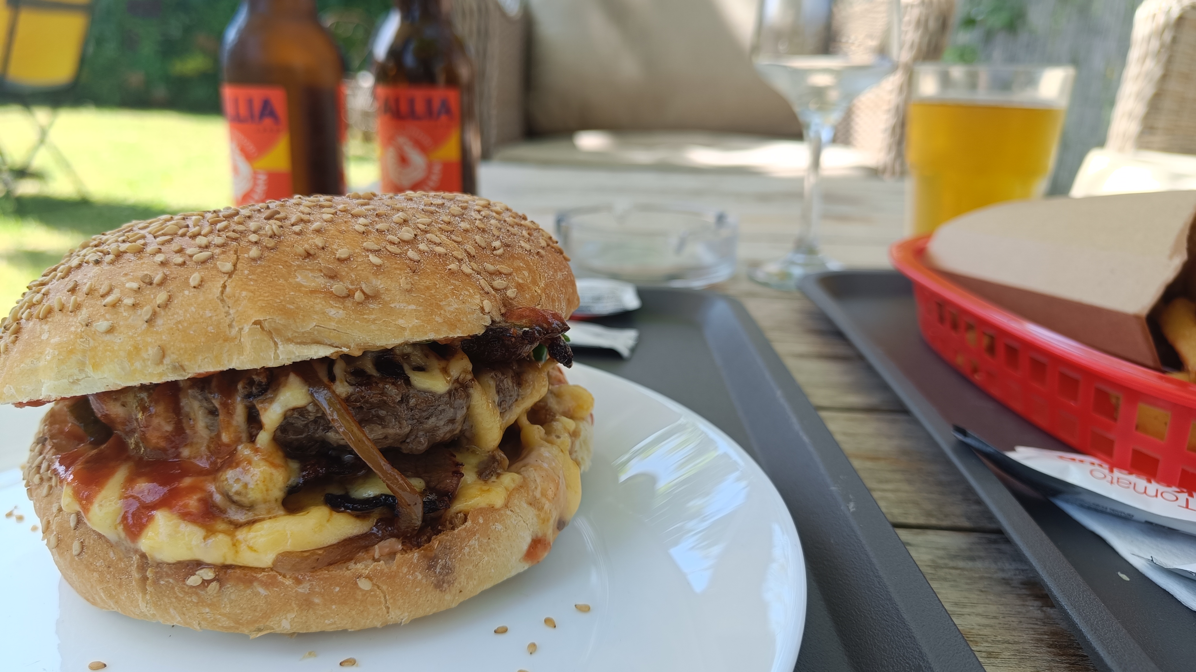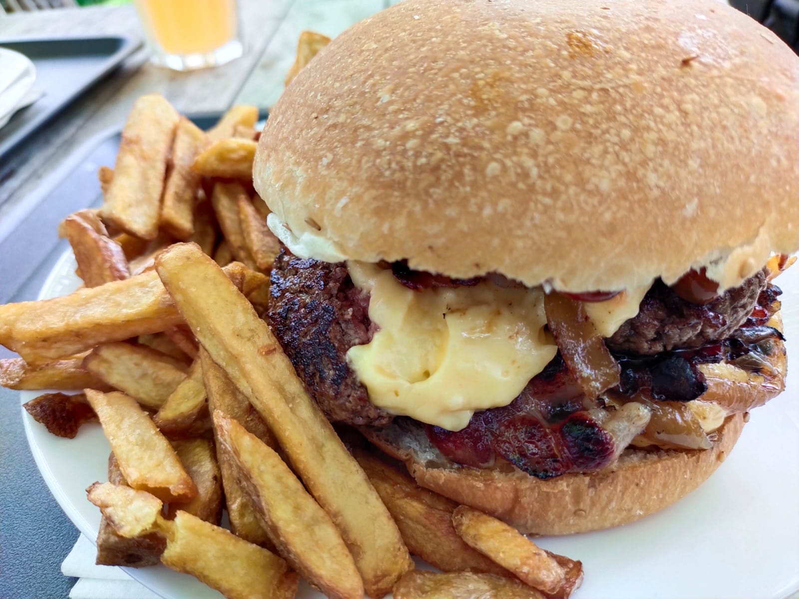 Cadre très agréable avec des burgers sous des arbres avec une excellente viande provenant d'un boucher à Bayeux et des frites maison, le burger Fat Boy est très généreux avec 2 steaks hachés bien épais, le JCB avec du Pont l'Evêque fondu a beaucoup plu à mon épouse, amatrice de bons fromages. Un bon choix de bonnes bières. Le Chardonnay au verre est plutôt bon pour seulement 5 ou 6 euros le verre. Notre fils qui habituellement se satisfait d'un cheese burger en à manger 2 par gourmandise.