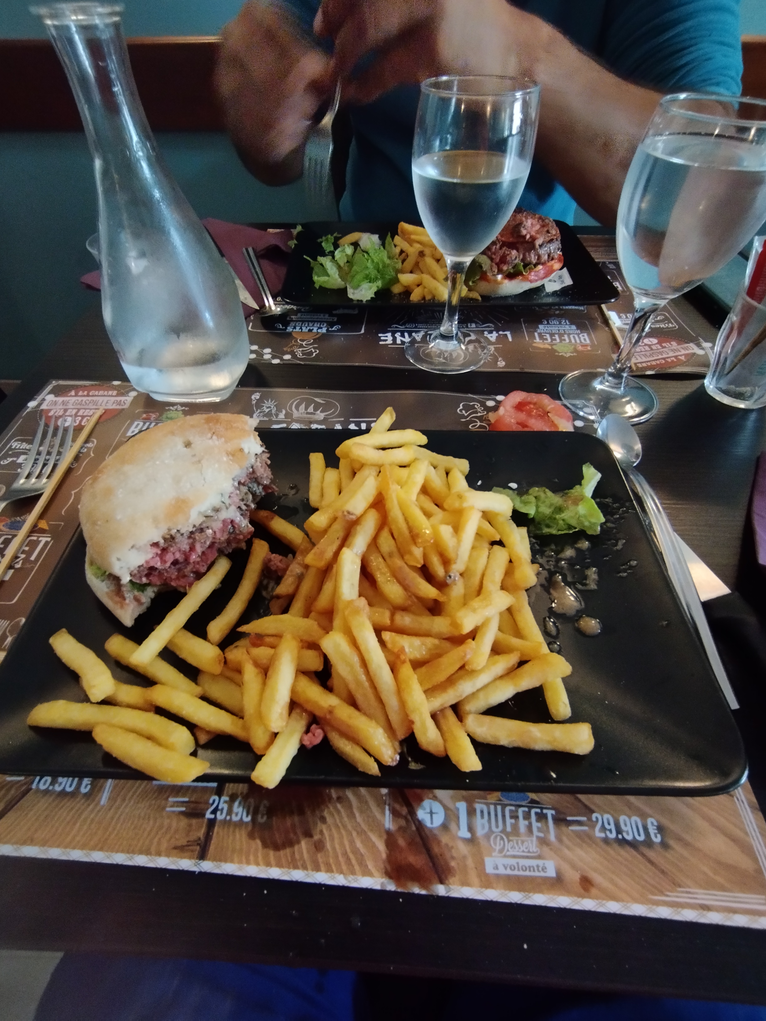 Quel régal. De passage, après avoir sélectionné cet endroit grâce à map's, nous sommes arrivés à 6 un peu tard (13:30). Pas de problème pour le patron, accueil super. Nous avons choisi l'hamburger Gargantua. 400G de boeuf limousin, on attendait le Chef au virage sur la cuisson qui nous avait pas été demandée, mais le résultat à été au delà de nos espérances, parfait.... Les Frites maison avec un grand F. Ne changez rien, c'est top. Nous conservons l'adresse, nous serons heureux de revenir si l'occasion se présente.
