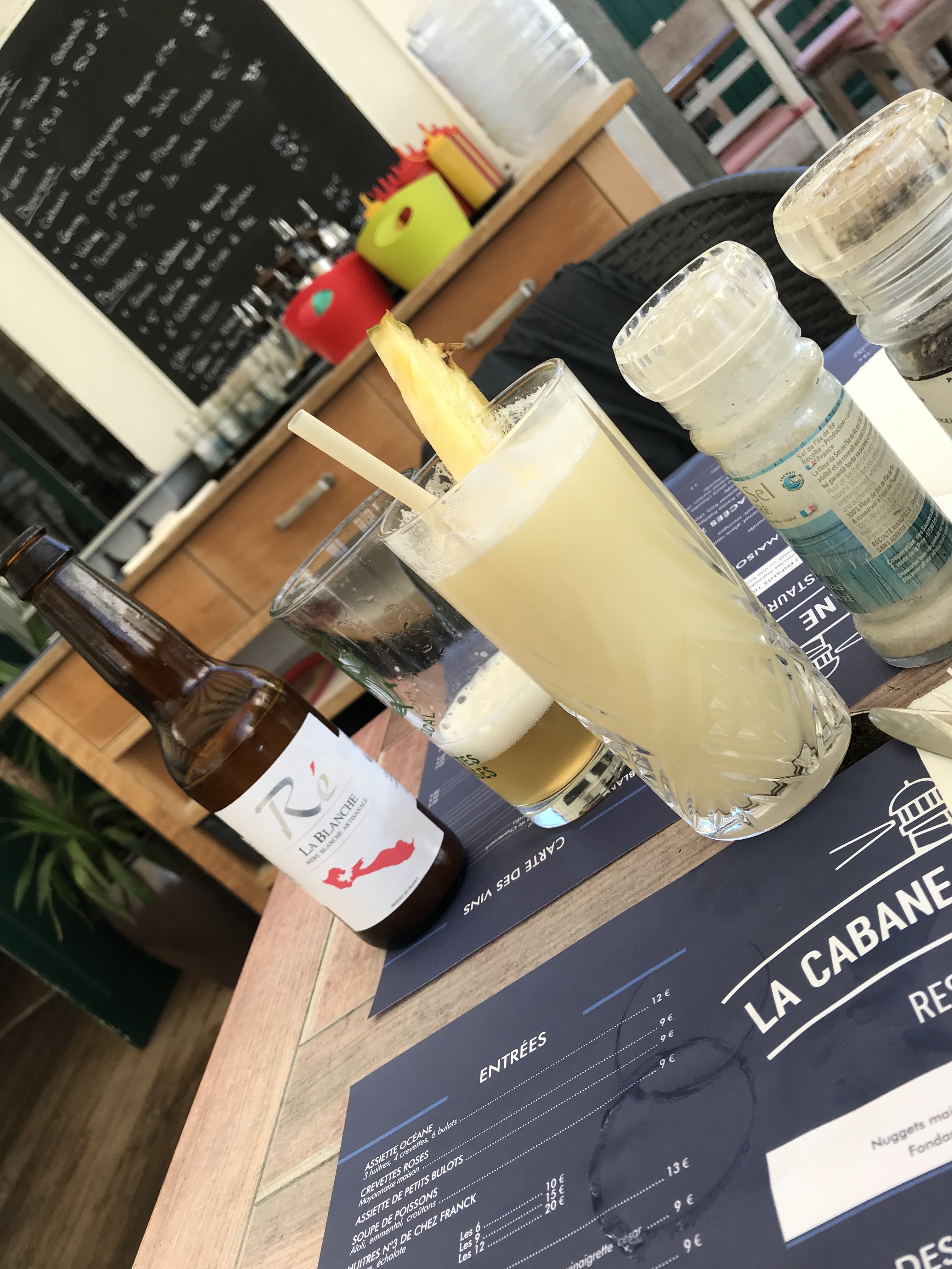 Un peu d attente pour dresser la table mais malgré la terrasse bondée, service rapide, approprié et toujours le sourire omniprésent, quant aux mets la parillade est exquise, délicieuse, et le bar enfin bref la cabane du phare des baleines, une table à apprécier, à déguster