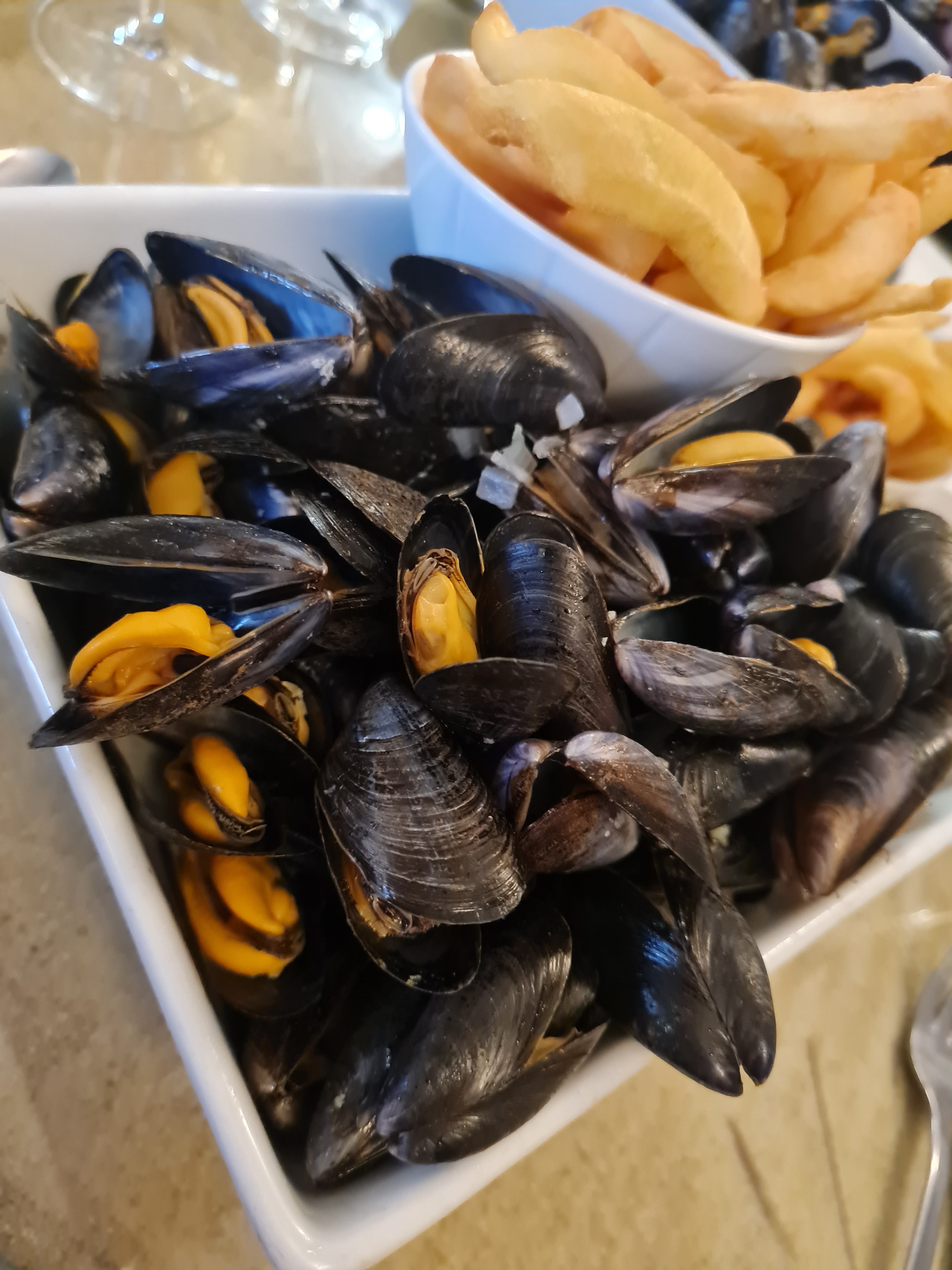 Bonne atmosphère! Les moules étaient très moelleuses et délicieuses, toutes ouvertes !