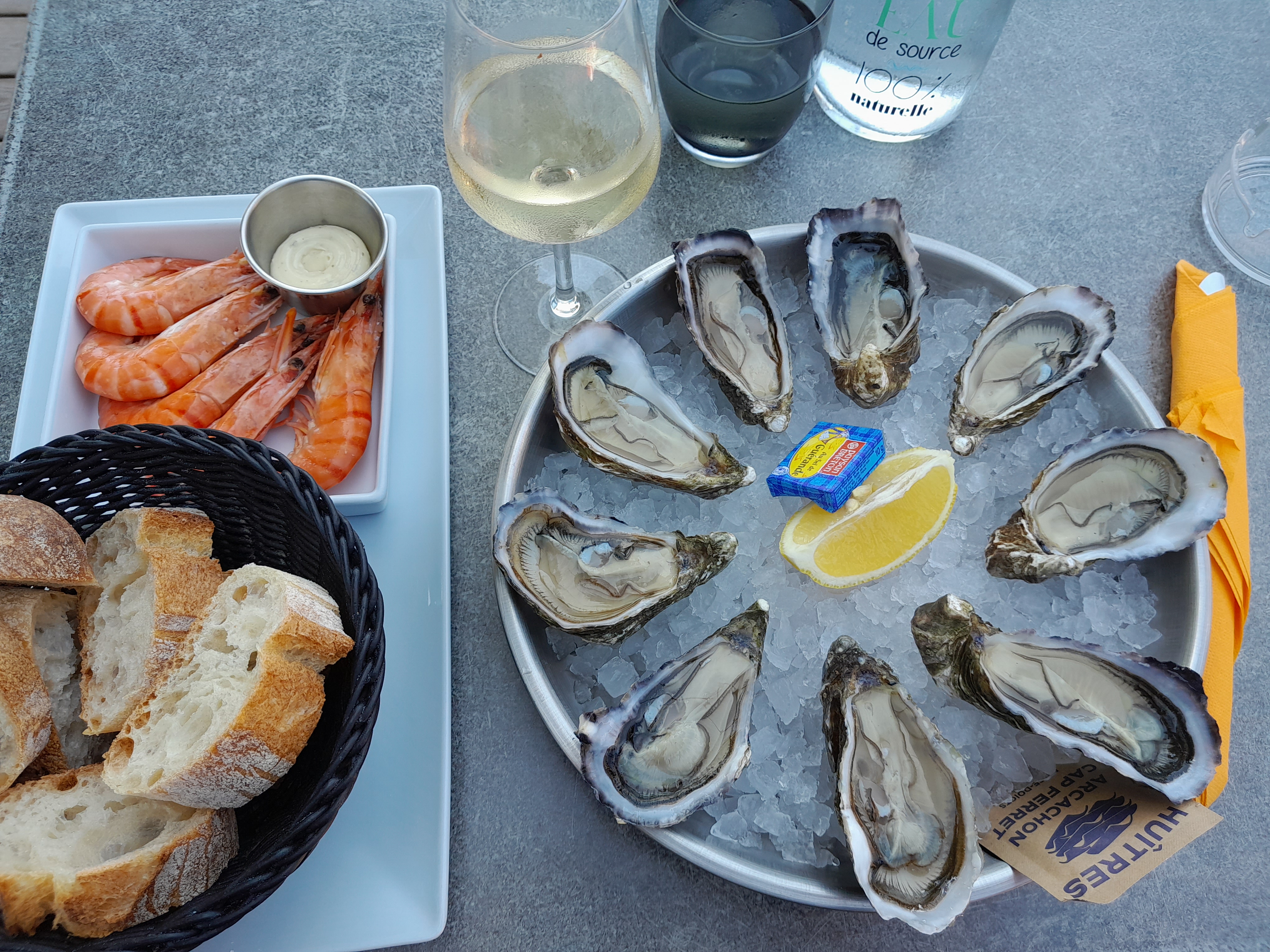 Huîtres du banc d'Arguin un peu salé à notre goût et crevettes bonnes mais chères pour la qualité.