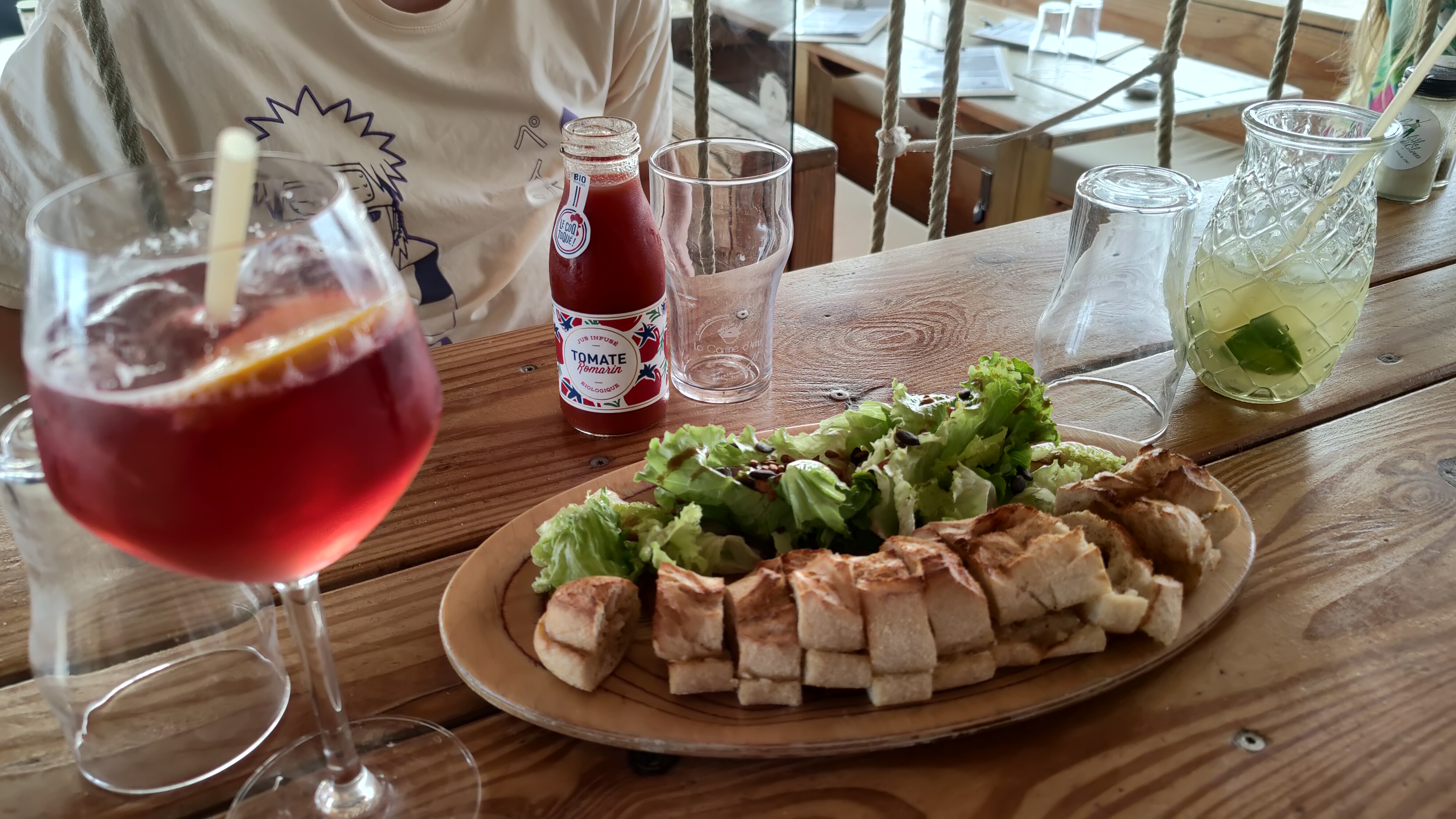 Nous y avons mangé un repas en famille, sur une table haute dont une partie des sièges sont des balançoires. On ne s'y attendait pas, c'était original ! Les repas étaient excellents, notamment l'entrée avec les différents poissons de la conserverie (divin, le maquereau !). La vue est imprenable pendant le repas : la plage, le grondement des vagues, les surfeurs... À recommander !