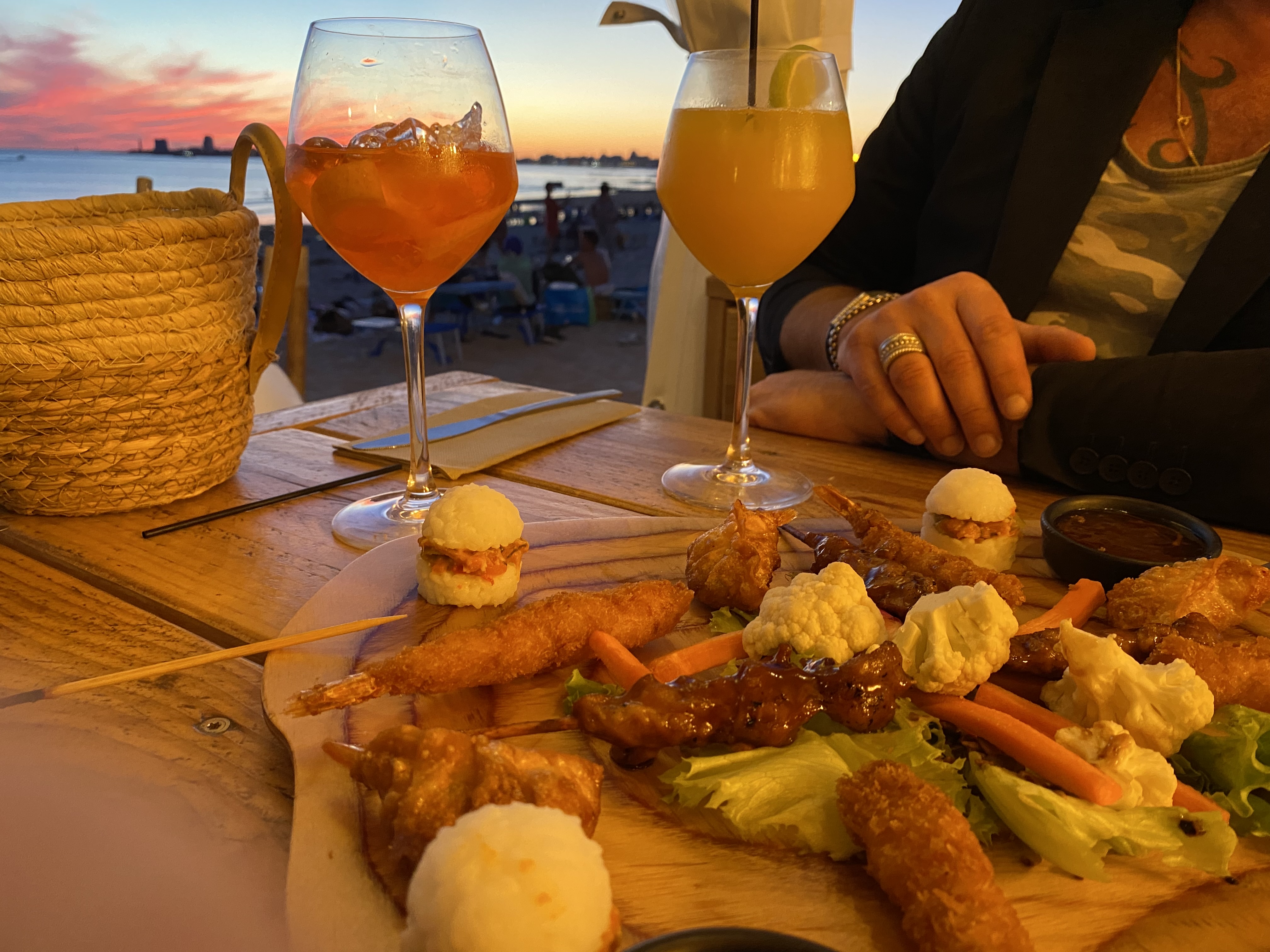 Nous sommes venus en famille et n'avons ABSOLUMENT pas été déçus ! Nous sommes venus grâce au bouche a oreille et nous recommanderons cet endroit qui mérite d'être connu. Restaurant face a la mer sur le sable, c'était la première fois et ce fut une superbe expérience ! Nous avons en plus profiter du coucher de soleil en mangeant notre plat! 🥰 De plus si tu es dos a la plage, tu as un miroir qui te permet de l'admirer ! Malin! 😁 Nous avions fait une réservation vers 19h30. Et avons été directement acceptés et menés a notre table. Tout d'abord, la réservation par internet avec le choix des horaires est une excellente idée pas assez répandue. Bien joué ! Nous avons été agréablement accueillis avec une équipe souriante ( enfin on imagine car avec les masques... 😂😂). La serveuse a été efficace, agréable et rapide malgré les enfants qui trainait un peu autour d'elle! Ça peut être agaçant, mais non elle a gardé le sourire et son amabilité ! Cocktails et apéritifs délicieux, petit bémol sur les mojitos (avec et sans alcool) qui sont un peu trop sucrés et la planche de fromage et charcuterie était très bonne et passait bien pour l'apéro ! Les plats sont copieux et délicieux ! Que ce soit les burgers, les pâtes ou encore les woks, personne n'a laissé de restes! Les assiettes vides, ça veut tout dire! 😁 Nous avons optes pour des cages et thés gourmands en desserts, parfait pour terminer le repas avec une boisson chaudes et d'excellentes petites mignardises ! La carte est suffisamment complète et le rapport qualité-prix est plus qu'excellent!! Nous avons d'ailleurs été étonné du montant de la note car on pensait en avoir pour plus ! 😂 Nous avons même pu laisser jouer les enfants dans le sable en pouvant les surveiller de prêt et éviter de les obliger a rester a table tout le long du repas. Nous recommandons fortement ce restaurant ! Merci beaucoup pour ce très bon moment passer avec vous!