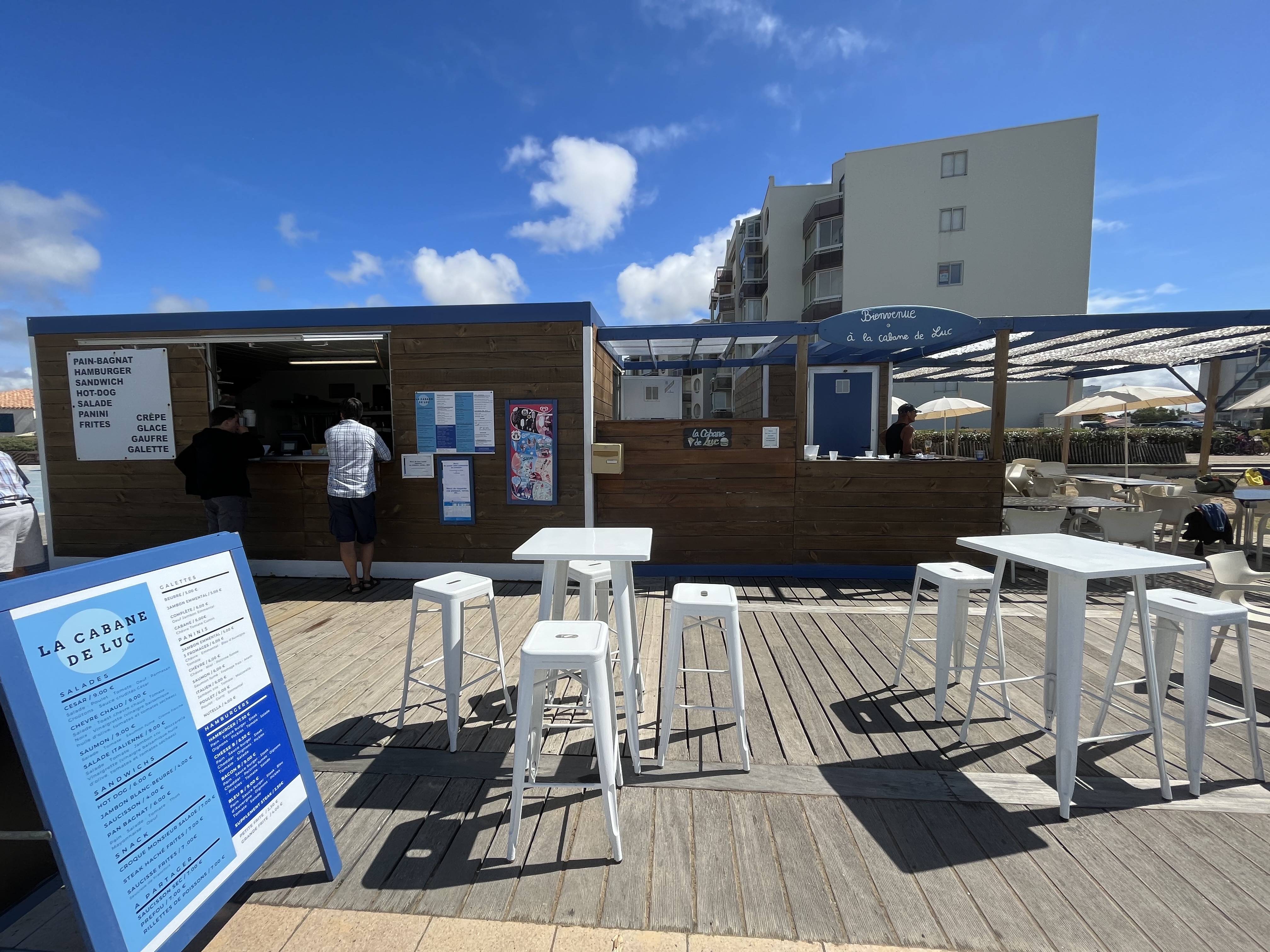 Cabane de restauration rapide au bord de mer, offrant la possibilité de manger sur place en extérieur avec vue mer. Le personnel est très aimable. Service rapide malgré la forte affluence du pont de l'ascension 2024. Les hamburgers sont très bon et je recommande les gaufres qui sont excellentes.