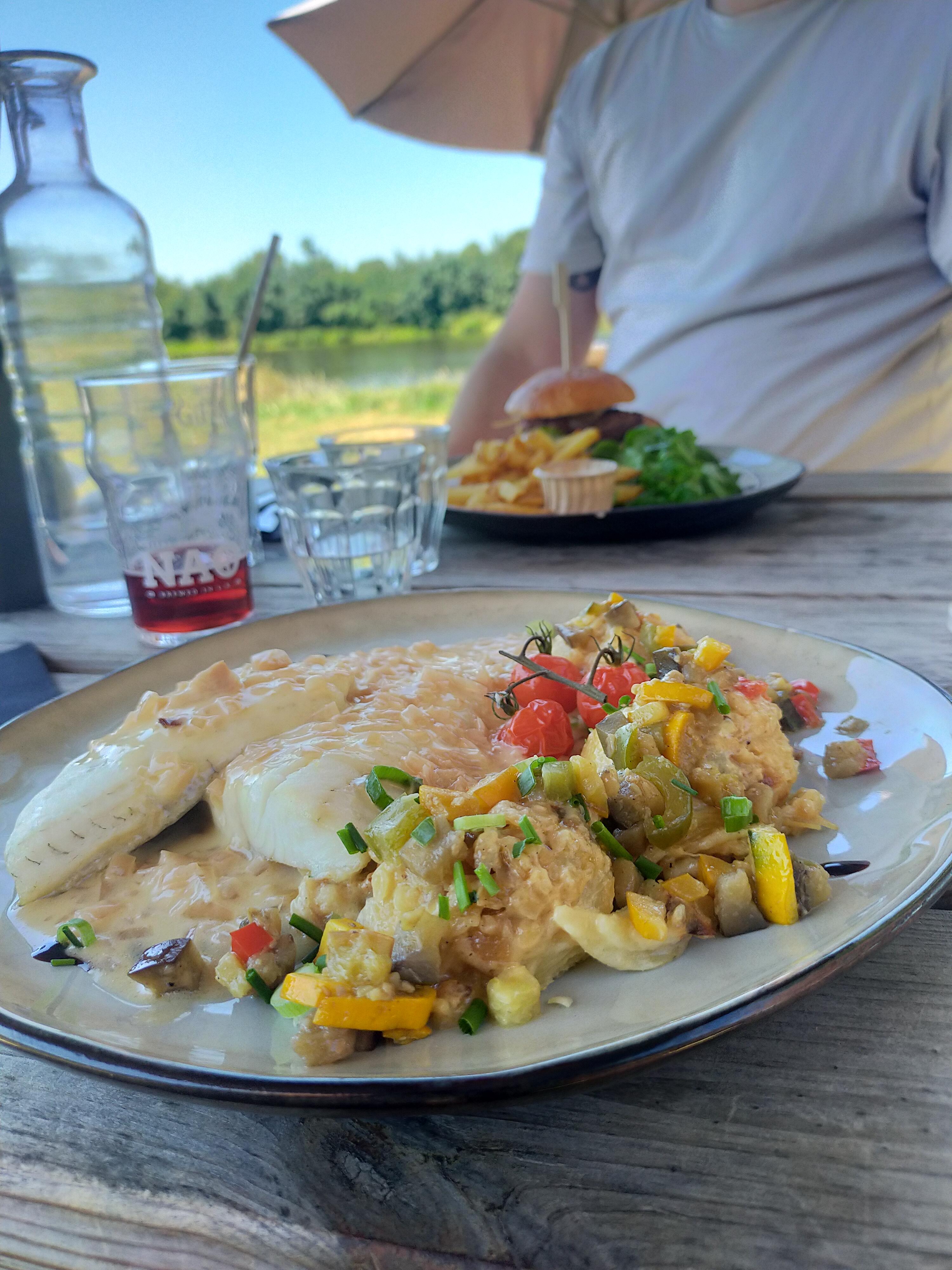 Superbe lieu tranquille face à l’eau. Bonne cuisine. Service agréable. De la place pour les enfants qui peuvent jouer sans déranger. Possibilité de louer des canoës à proximité ou de faire une boucle à vélo.
