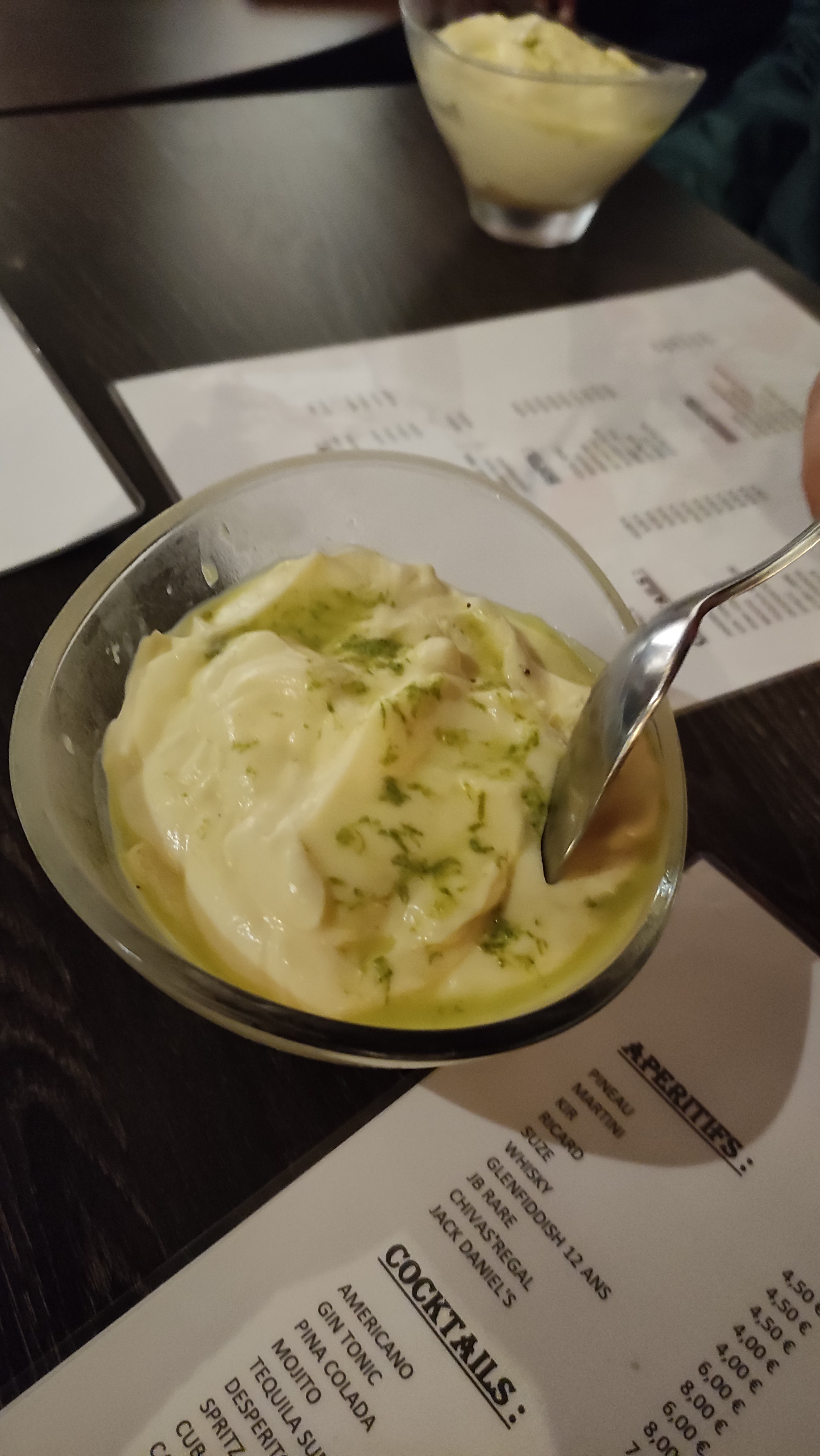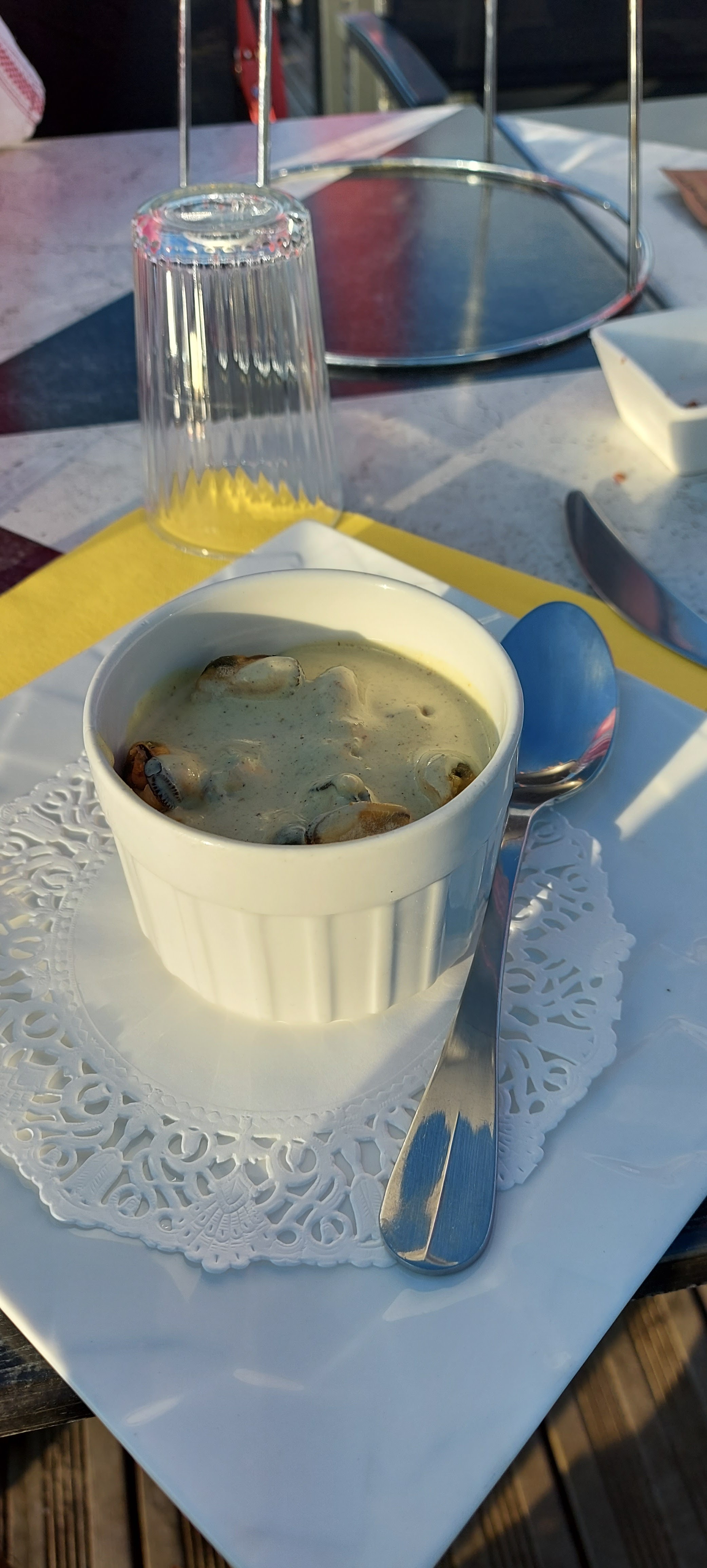 Lieu agréable en terrasse. Personnel très gentil. Verres et couverts avec beaucoup de traces de calcaire ( il faudrait les essuyer après lavage). Les moules à la crème étaient tièdes (on m'a proposé de les réchauffer !!!) Le crumble à l'abricot très mou. Déçue par la qualité avec un prix élevé.