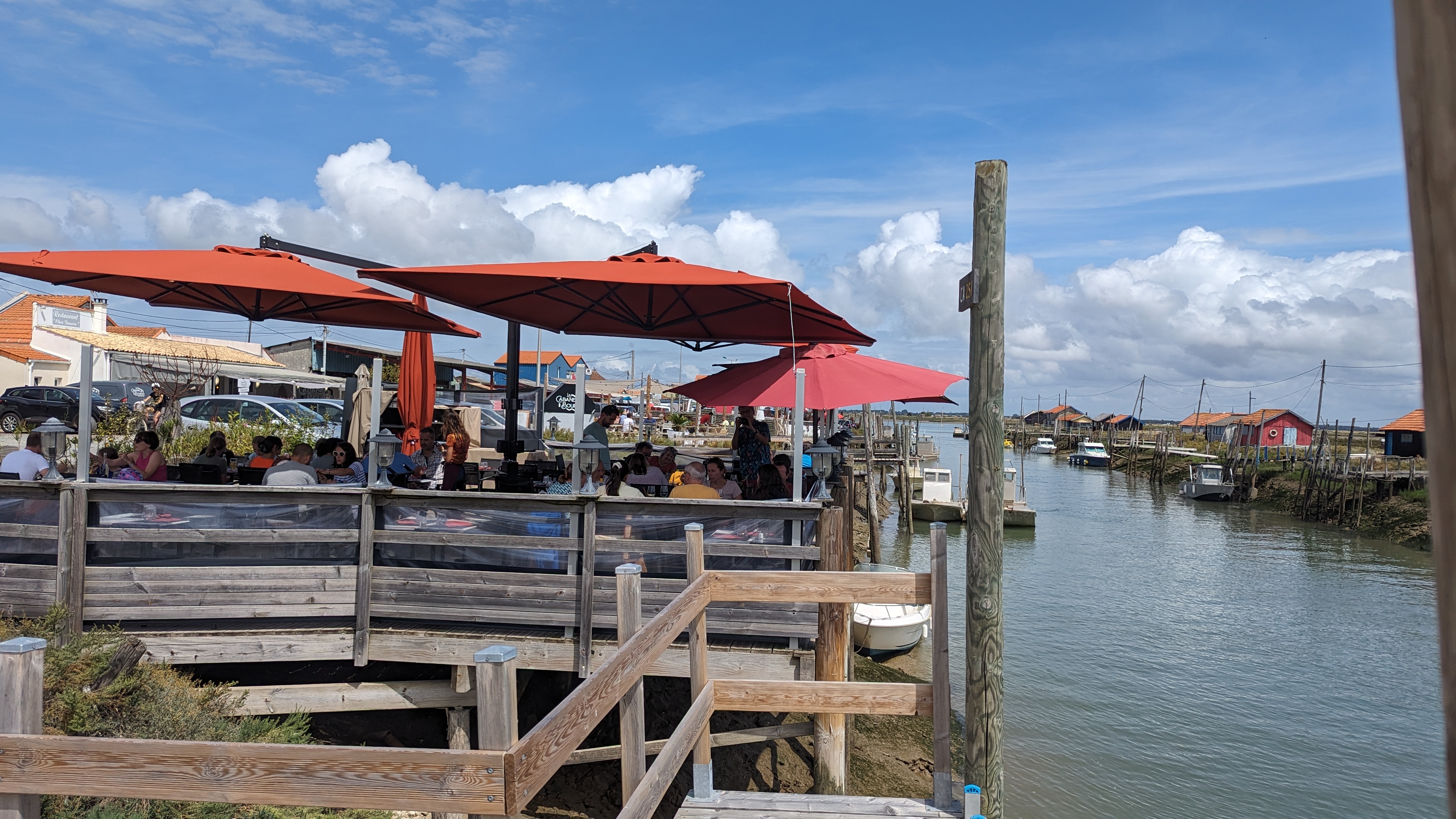 Très bel emplacement dans le quartier des chenaux et cabanes à huîtres de la Tremblade. Intéressant le soir car site bien illuminé, et authentique quartier de cabanes. Carte variée mer avec des produits du jour. Accueil sympa mais on se rend vite compte que le Monsieur le directeur, bienvenue est adressé à tous le monde... Un patron qui sort des phrases toutes faites, direct mais qui connaît son métier et propose. L'entrée de palourdes gratinées ne m'a pas convaincu (partagée à 2) car peu de goût de coquillages et persillade industrielle qu'on trouve dans les escargots... Le froid chaud de Thon était excellent. L’entrecôte et sa sauce façon cabane est à éviter: comme souvent une tranche trop fine, d'un boeuf tellement jeune qu'elle n'a pas le persillé escompté, accompagné de poireaux immangeables (trop secs et acides... servis également avec le froid chaud de thon)... accompagnement de bonnes demi pommes de terres grenaille présentées dans le déjà vu et revu petit panier inox... Je conseille l'apéritif maison qui était une très bonne sangria. C'est cher... trop pour ce que c'est, car tout n'est pas à la hauteur. Plat poisson jusqu'à 16€ et entrecôte à 24€... choisissez plutôt dans les produits de la mer... vous serez moins déçus.