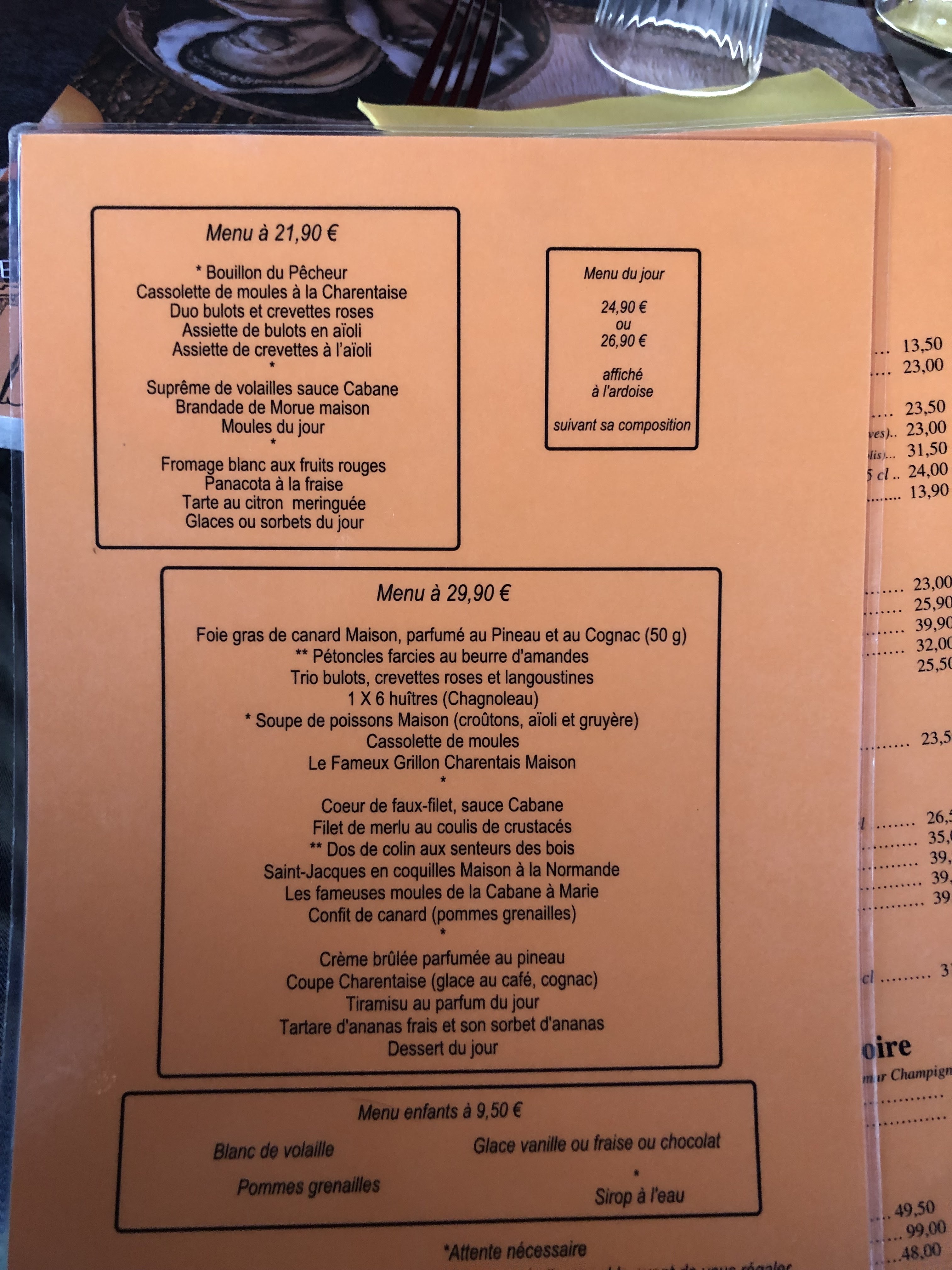 Un excellent restaurant ! Venus en couple, nous nous sommes régalés de 2 menus à 23,90 € avec - en entrées - gratin de pétoncles - duo de bulots et crevettes - en plats - moules de la cabane - saint Jacques à la normande - en desserts - tarte au citron revisitée - crème brûlée au pineau Tout était délicieux, et fut arrosé d'une demi-bouteille d'un fort correct muscadet sur lie. J'ajoute que le patron est très accueillant, le service attentionné et rapide et la terrasse idéalement située face aux cabanes de pêcheurs et relativement isolée du vent qui peut parfois se lever quand le soir tombe... Bref, une excellente adresse pour un très agréable dîner : encore merci à toute l'équipe !
