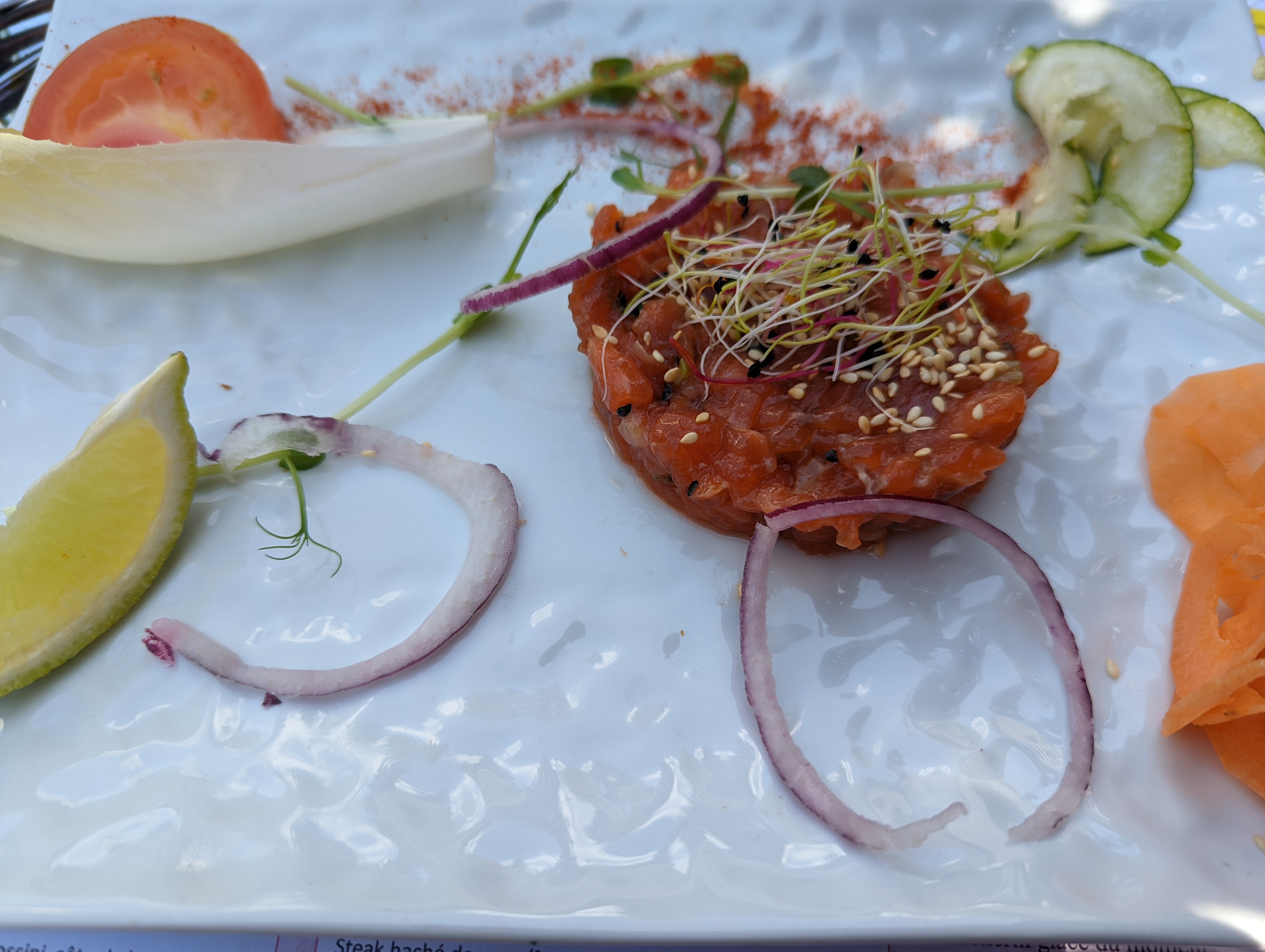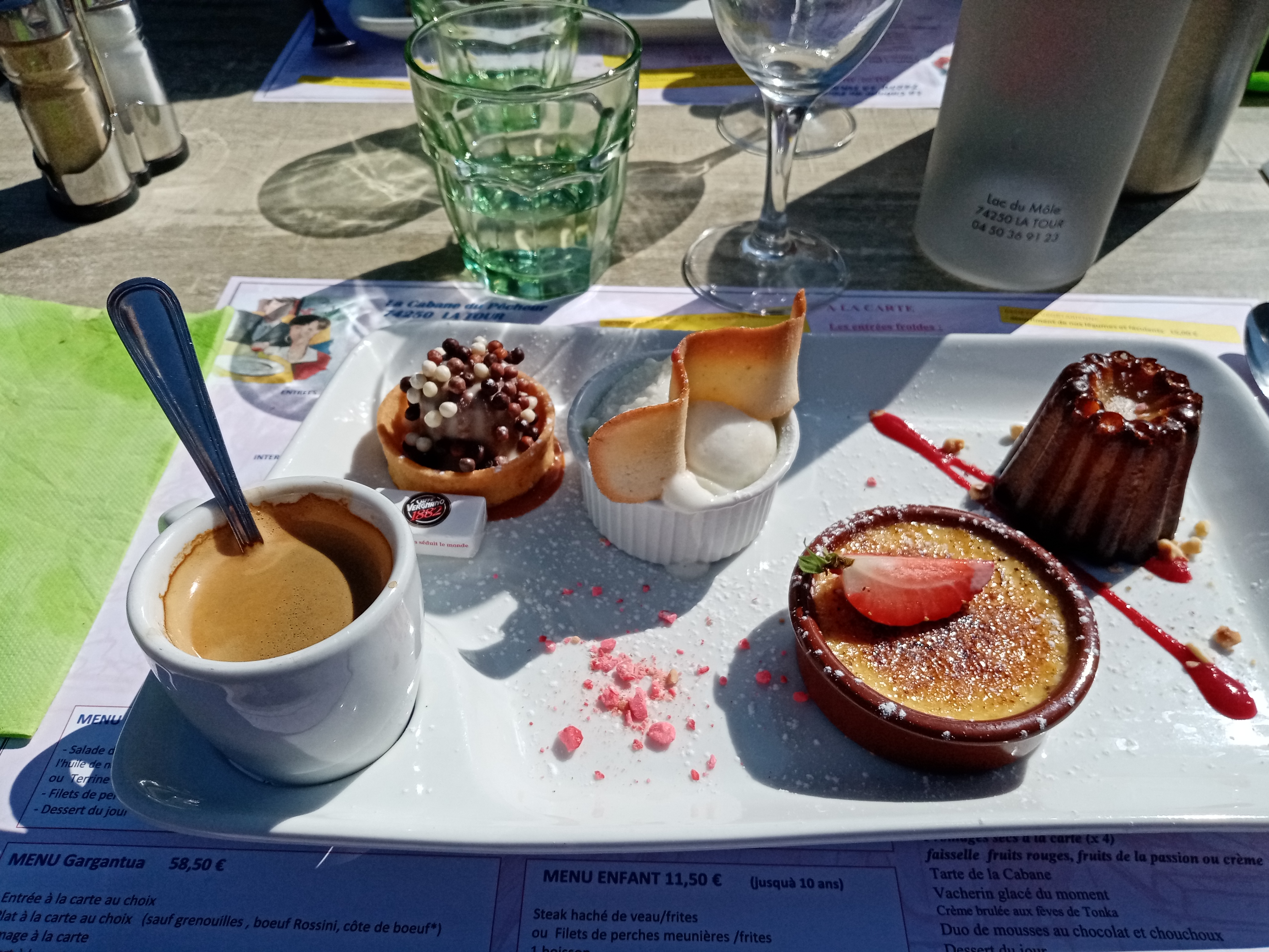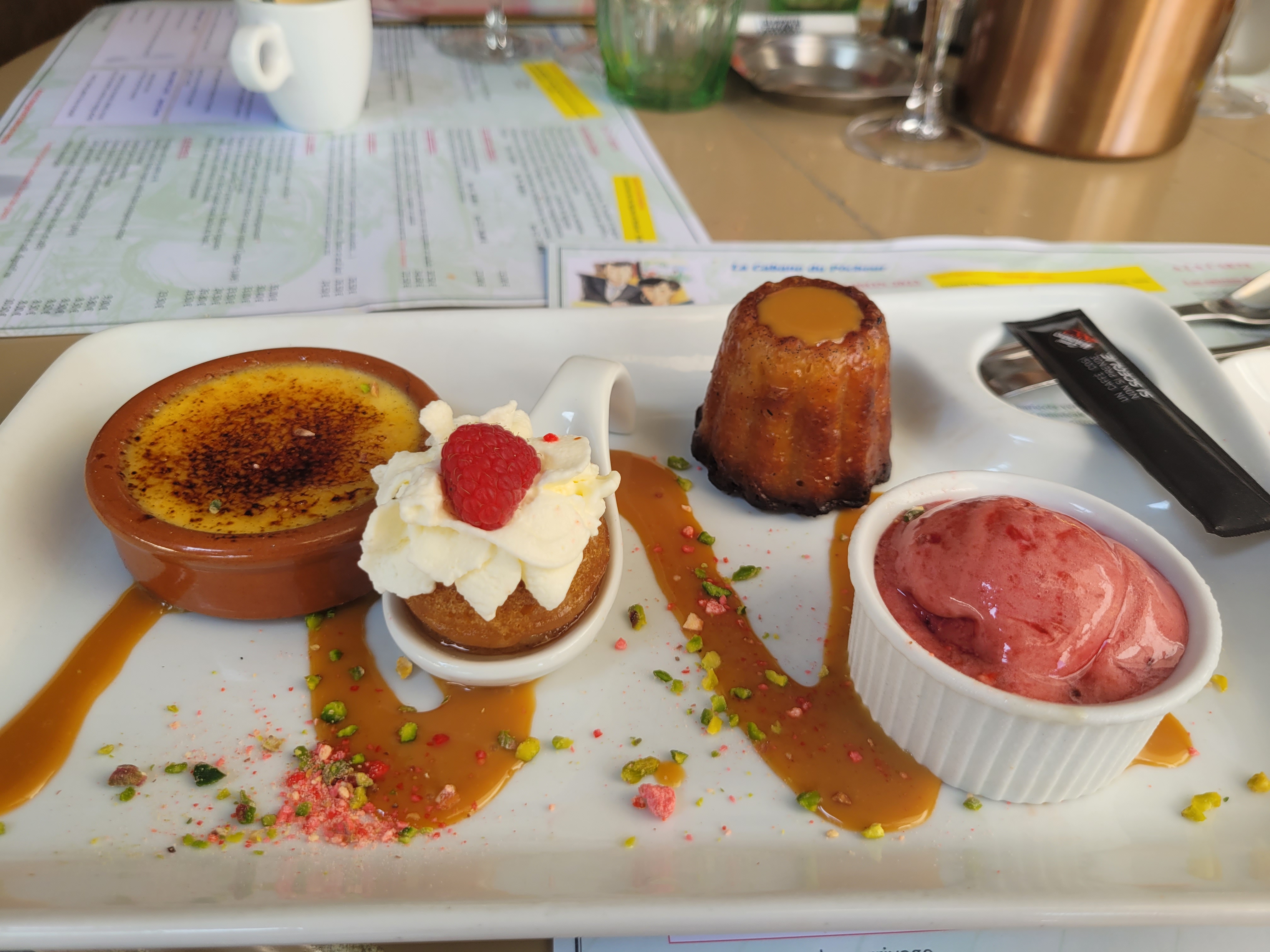 Quelle déception : à cause d'un éventuel orage, personne n'avait le droit de manger en terrasse. L'orage n'est pas arrivé. Seulement L'apéro en terrasse, pas de dessert car personne ne voulait prendre notre commande.