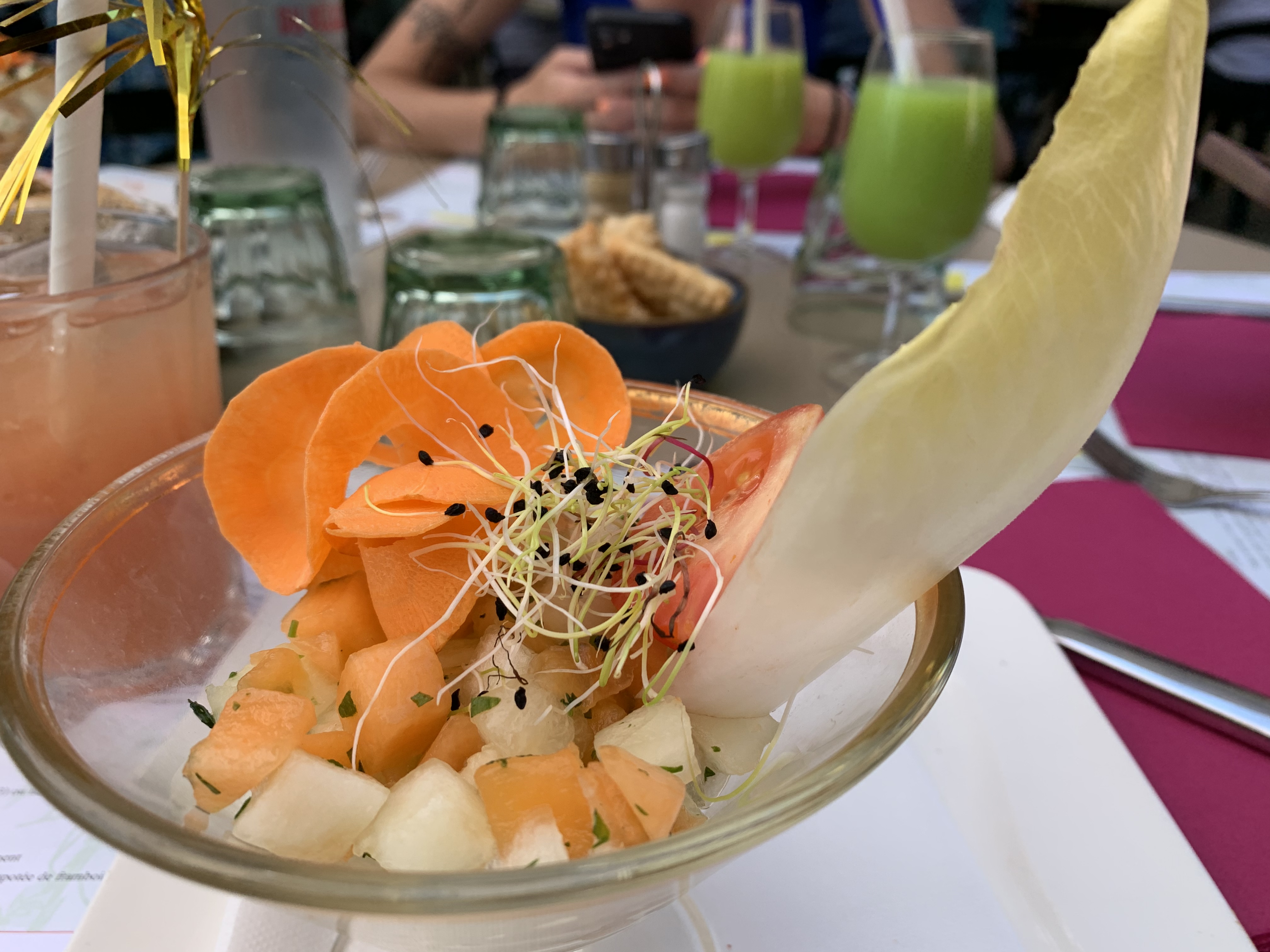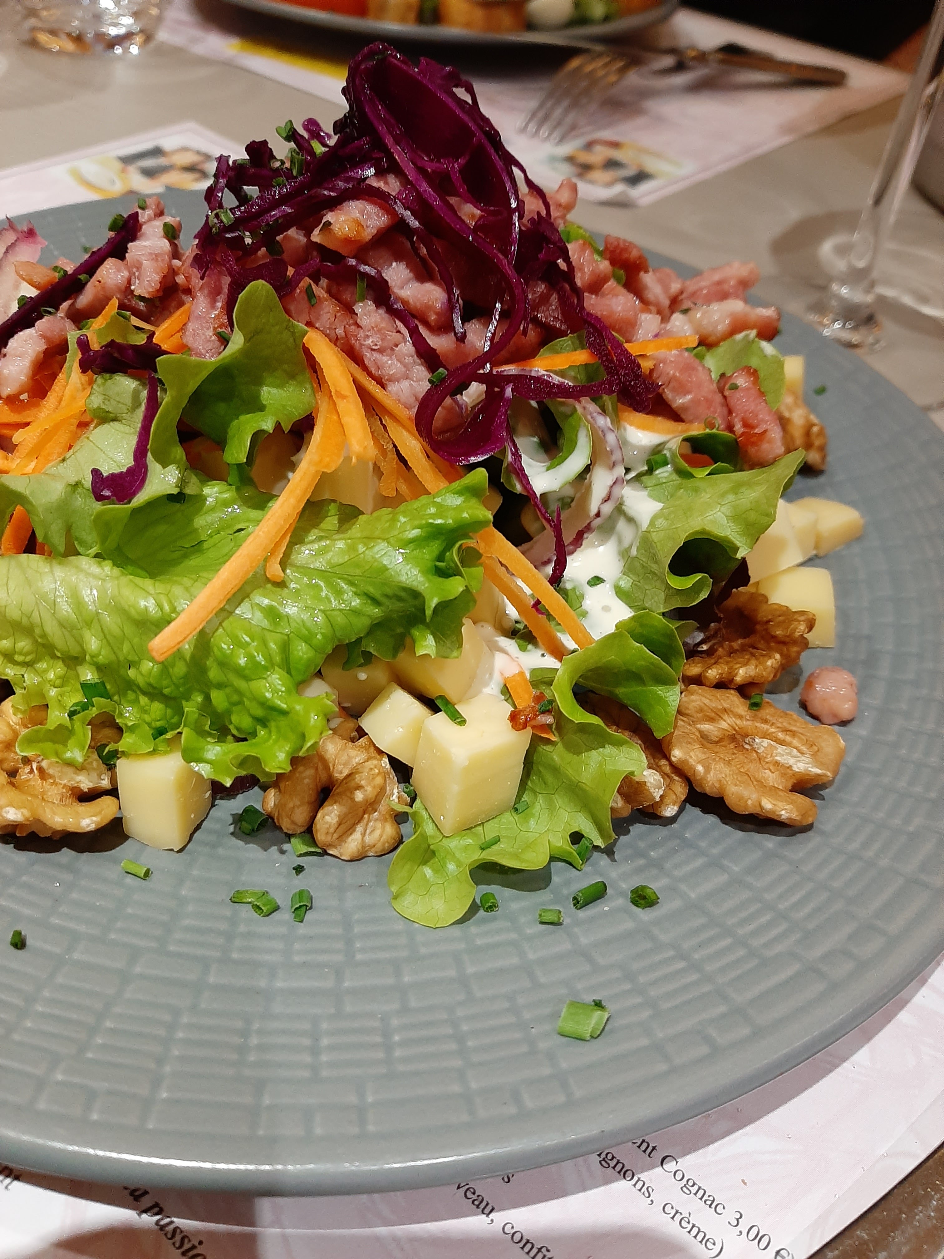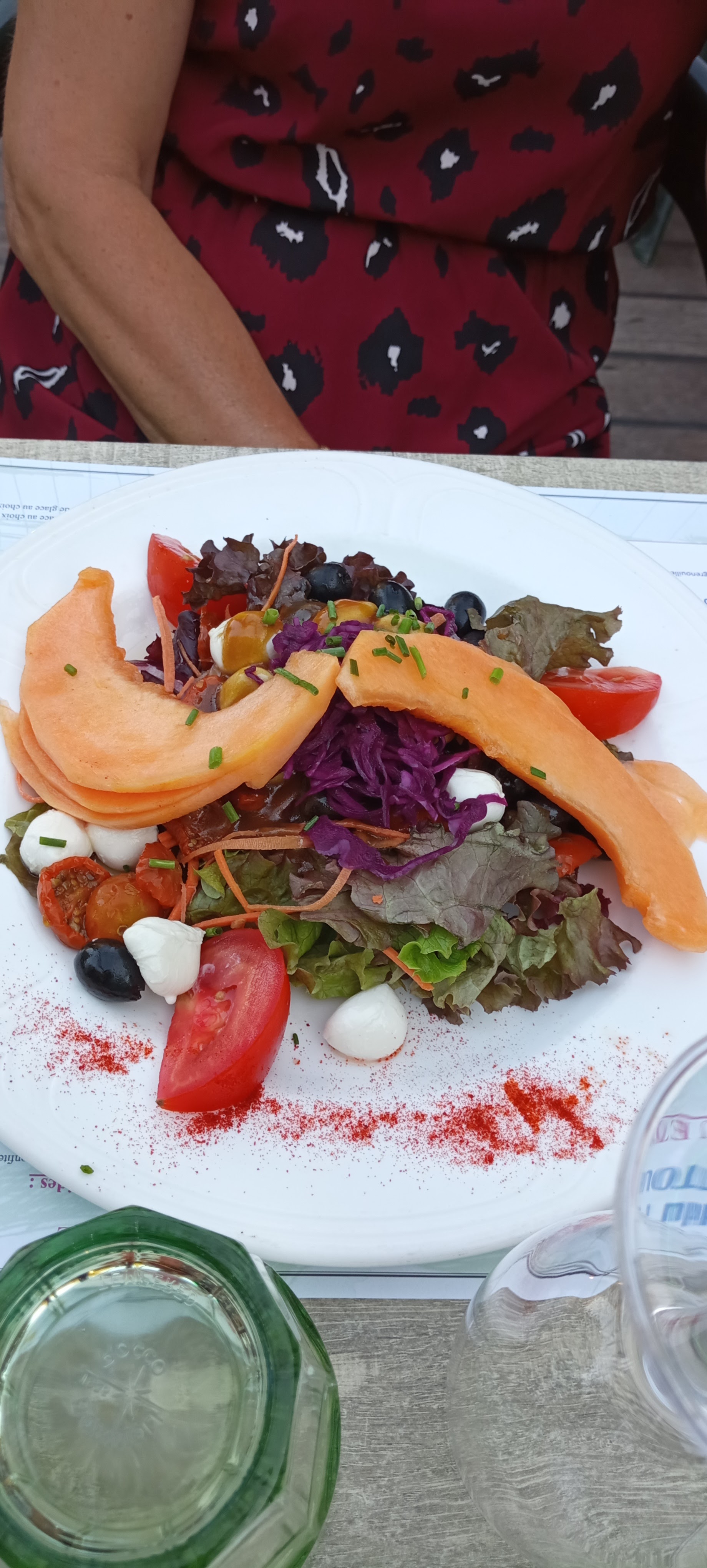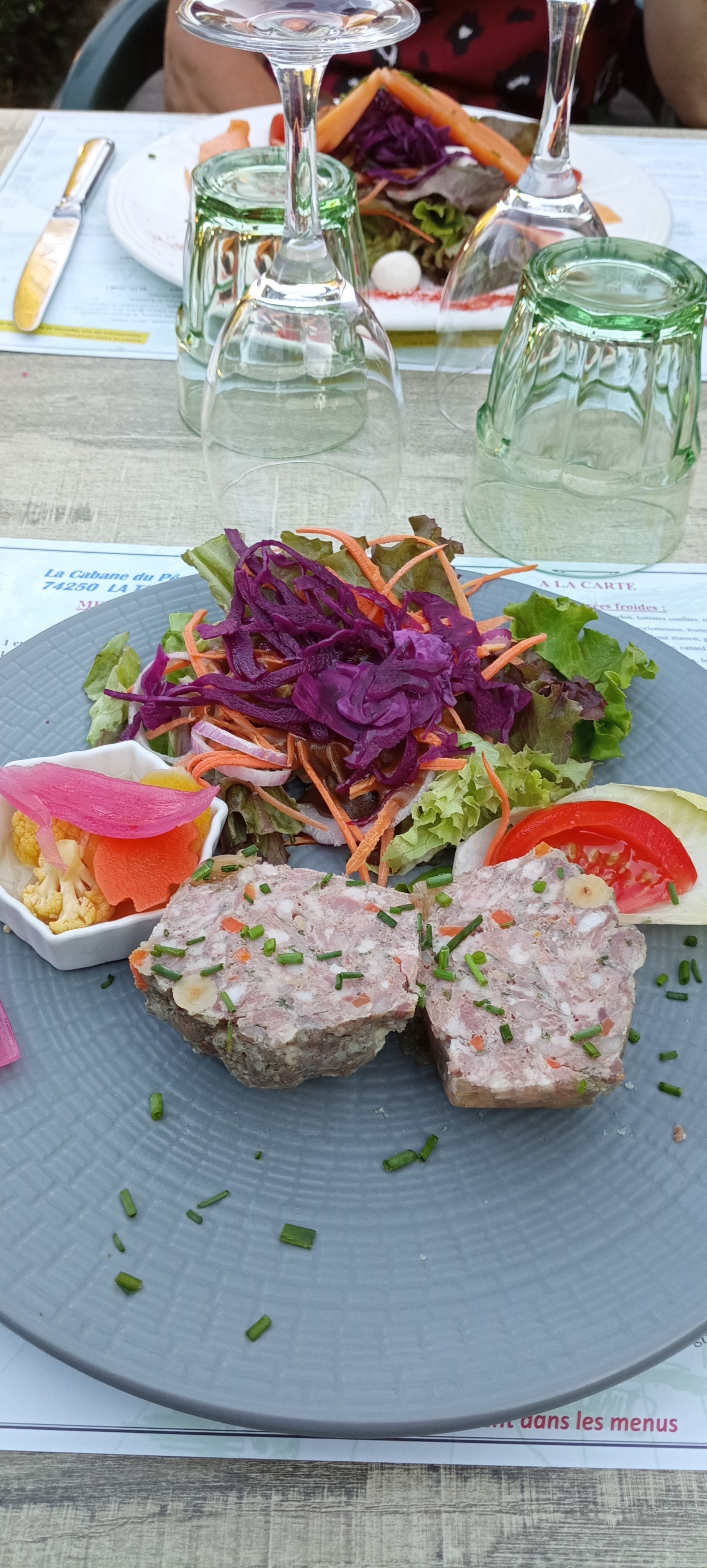Quelle déception : à cause d'un éventuel orage, personne n'avait le droit de manger en terrasse. L'orage n'est pas arrivé. Seulement L'apéro en terrasse, pas de dessert car personne ne voulait prendre notre commande.