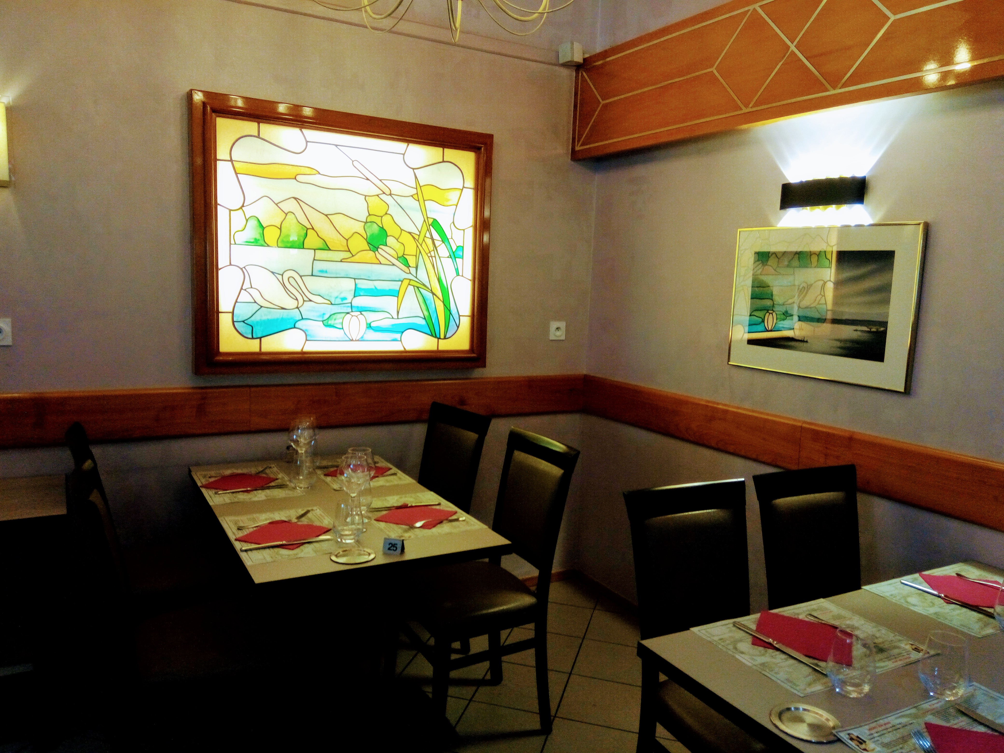Dommage , une table de 6 pour 7 personnes, un peu serré . Beaucoup de monde et de bruit , un peu à l'étroit . Je recommande quand même, serveuses et serveurs simpa. Les cuisses de grenouille sont un peux cher mais excellentes . Attendons l'ouverture de la terrasse , vu sur le lac , très joli.