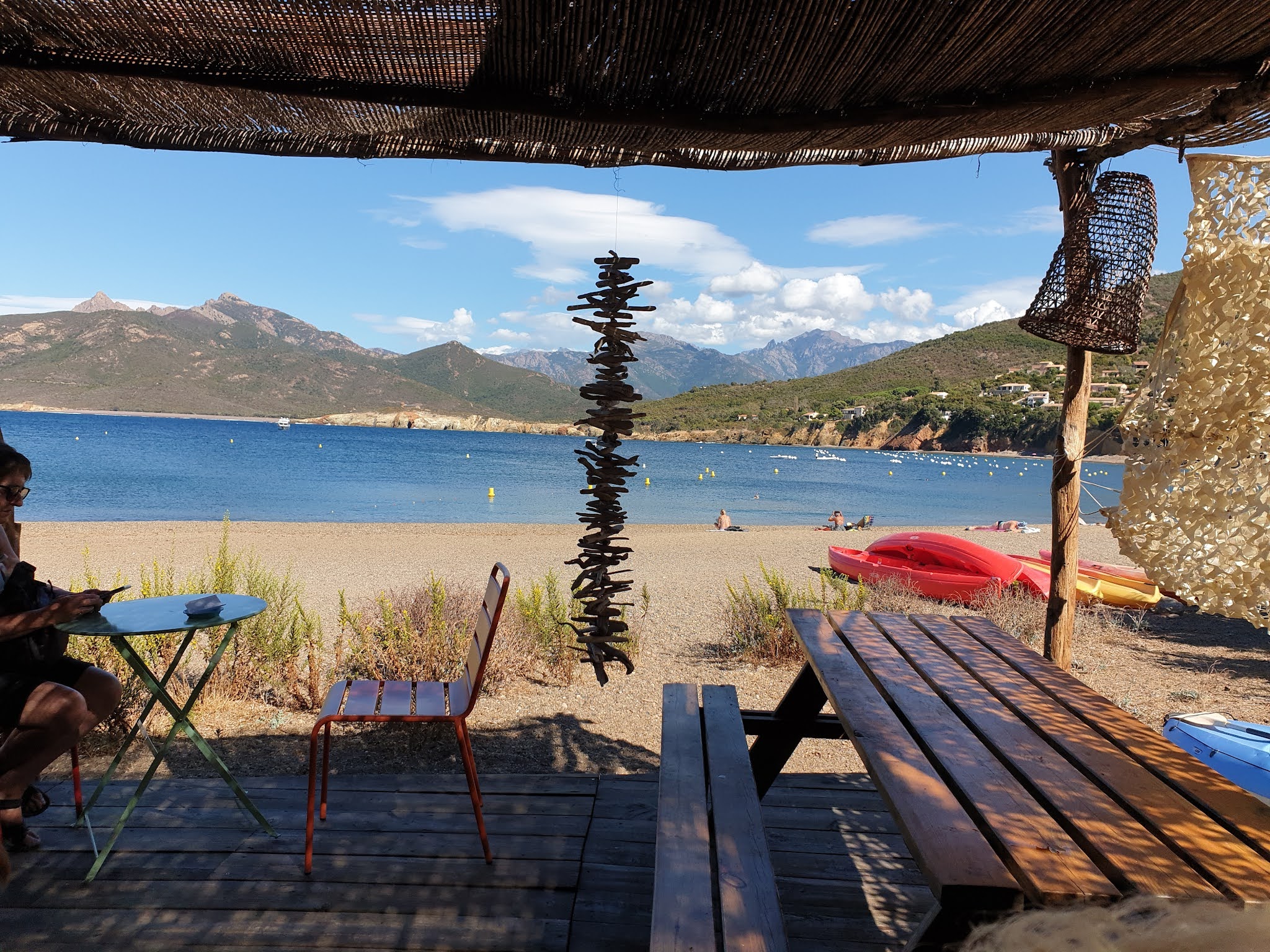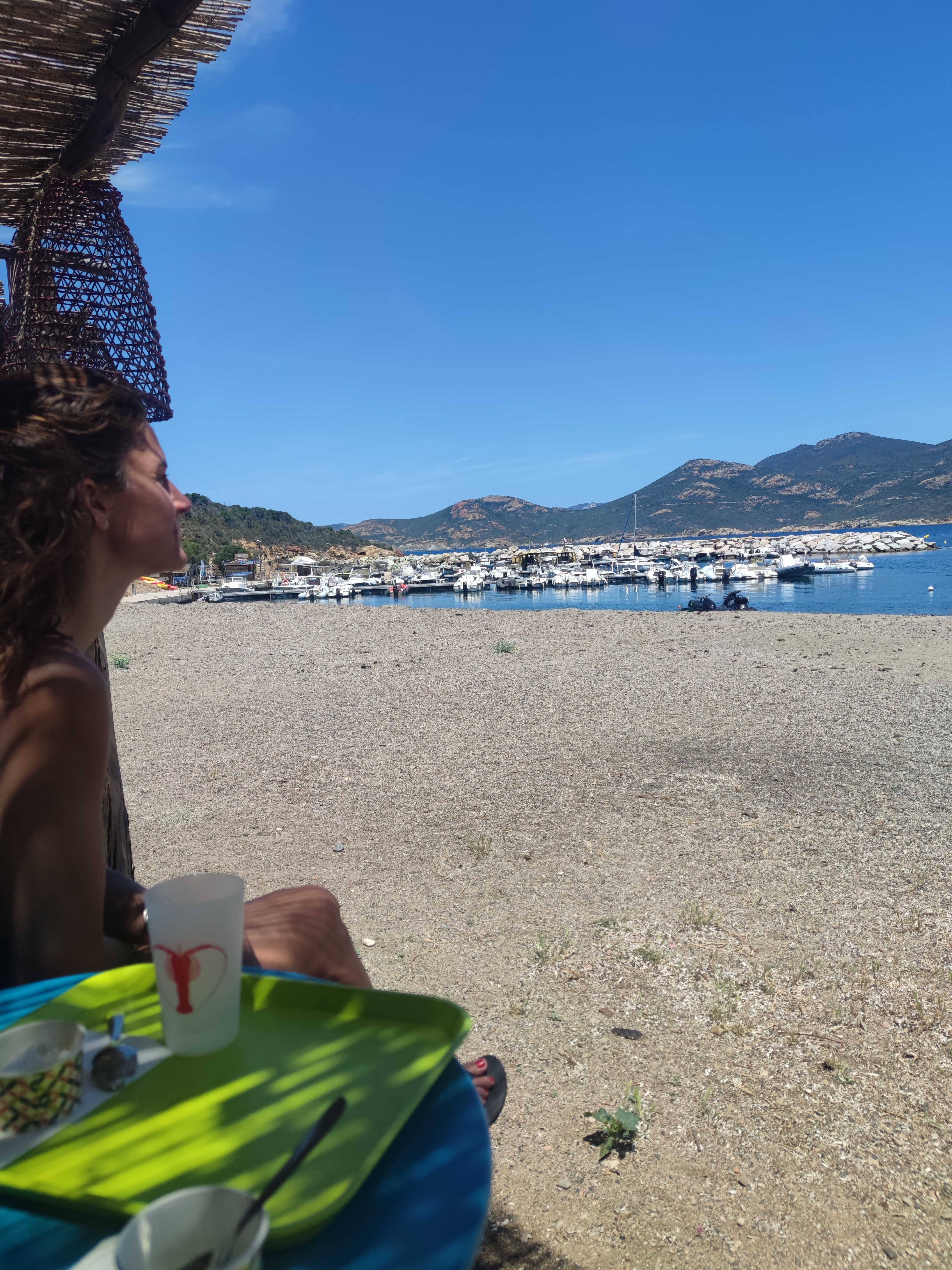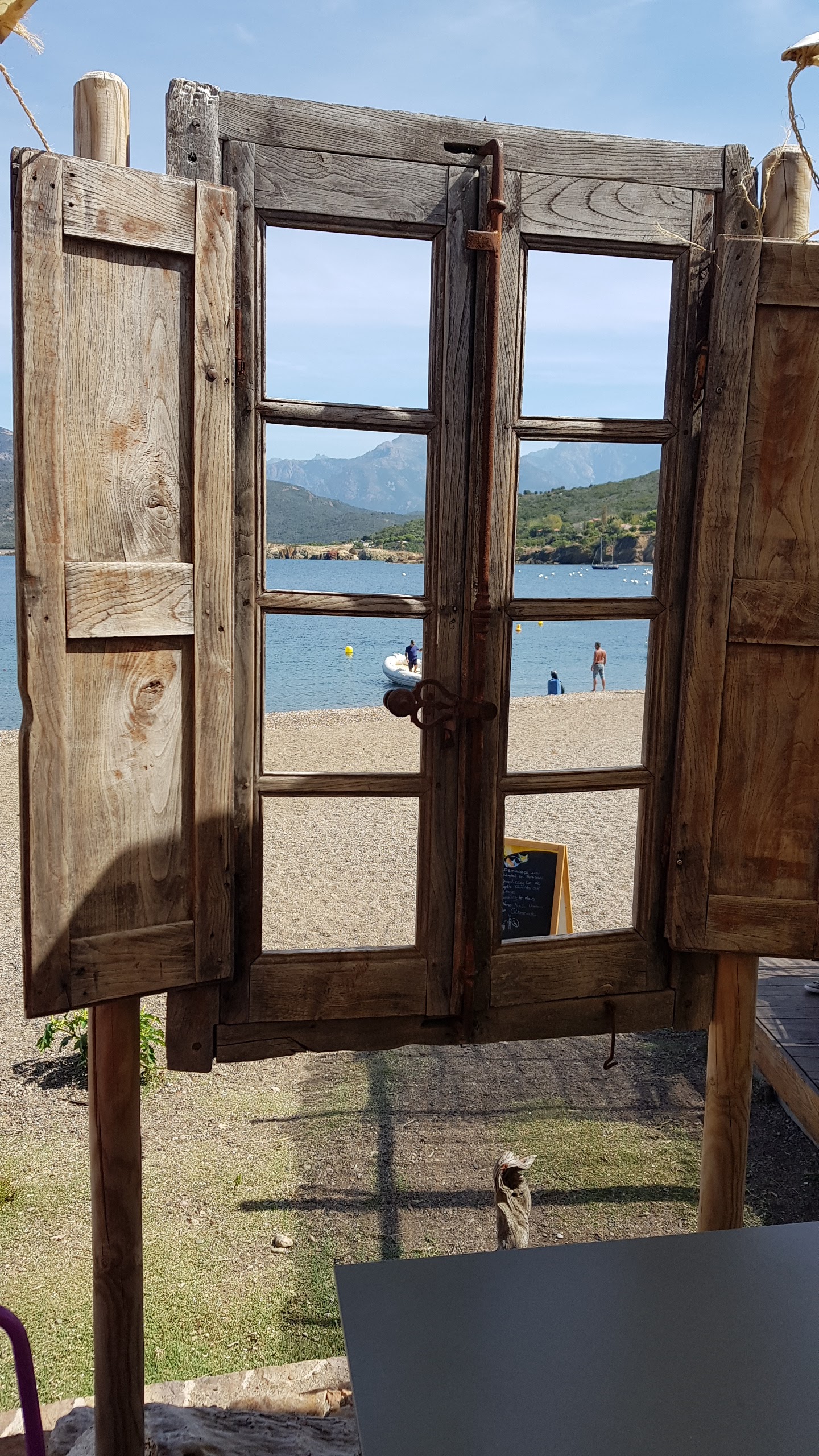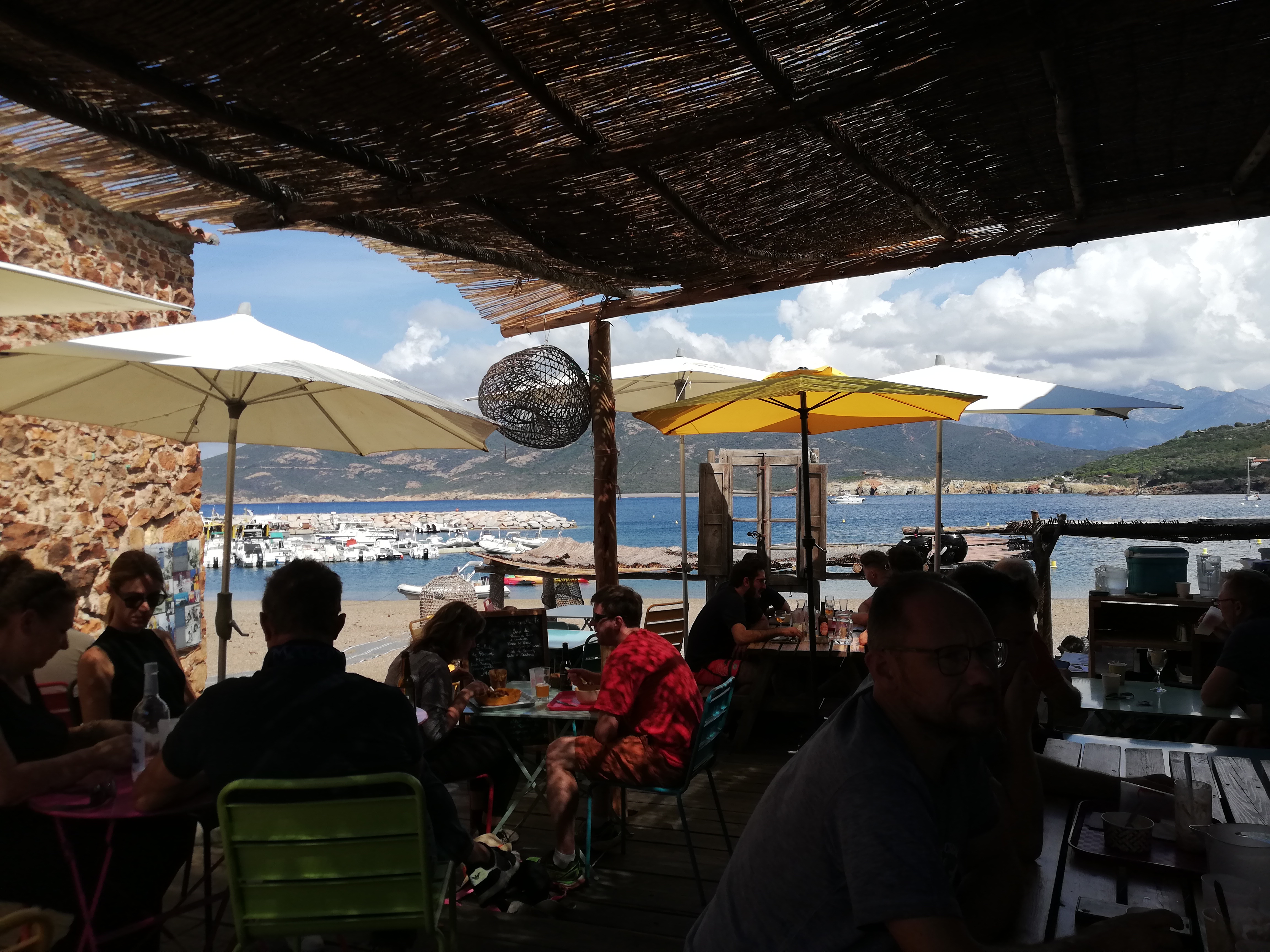Nous y sommes arrêté par hasard lors de notre road trip en moto car nous cherchions un endroit où nous rafraîchir autour d'une boisson désaltérante en bord d'eau. Le cadre est idyllique en bord de plage avec les bateaux amarrés près de là, sur deux terrasses distinctes, décorées avec simplicité par des fabrications maison tel l'abri de Robinson Crusoé. Les serveuses y sont très agréables et ont fait de leur mieux afin que nous goûtions à un maximum de chose avant la fermeture des cuisines. Les propositions sont originales et tellement bonnes qu'on a fini par prendre des frites fraîches avec l'excellent ketchup maison, crêpe, sunday et milkshake aussi maison passant par un granité melon incroyable. Tout est fait sur place. Chapeau bas au chef cuisinier qui se surpasse avec talent. Ils proposent du salé avec des produits pêchés par le propriétaire des lieux, un plus incroyable gage de fraîcheur et de qualité. Ce fut réellement une belle découverte et une adresse à noter absolument. Le chemin sinueux qui nous y a amené de Calvi vaut vraiment le détour mais préparez vous à avoir mal aux fessiers pour y arriver si vous êtes en moto...
