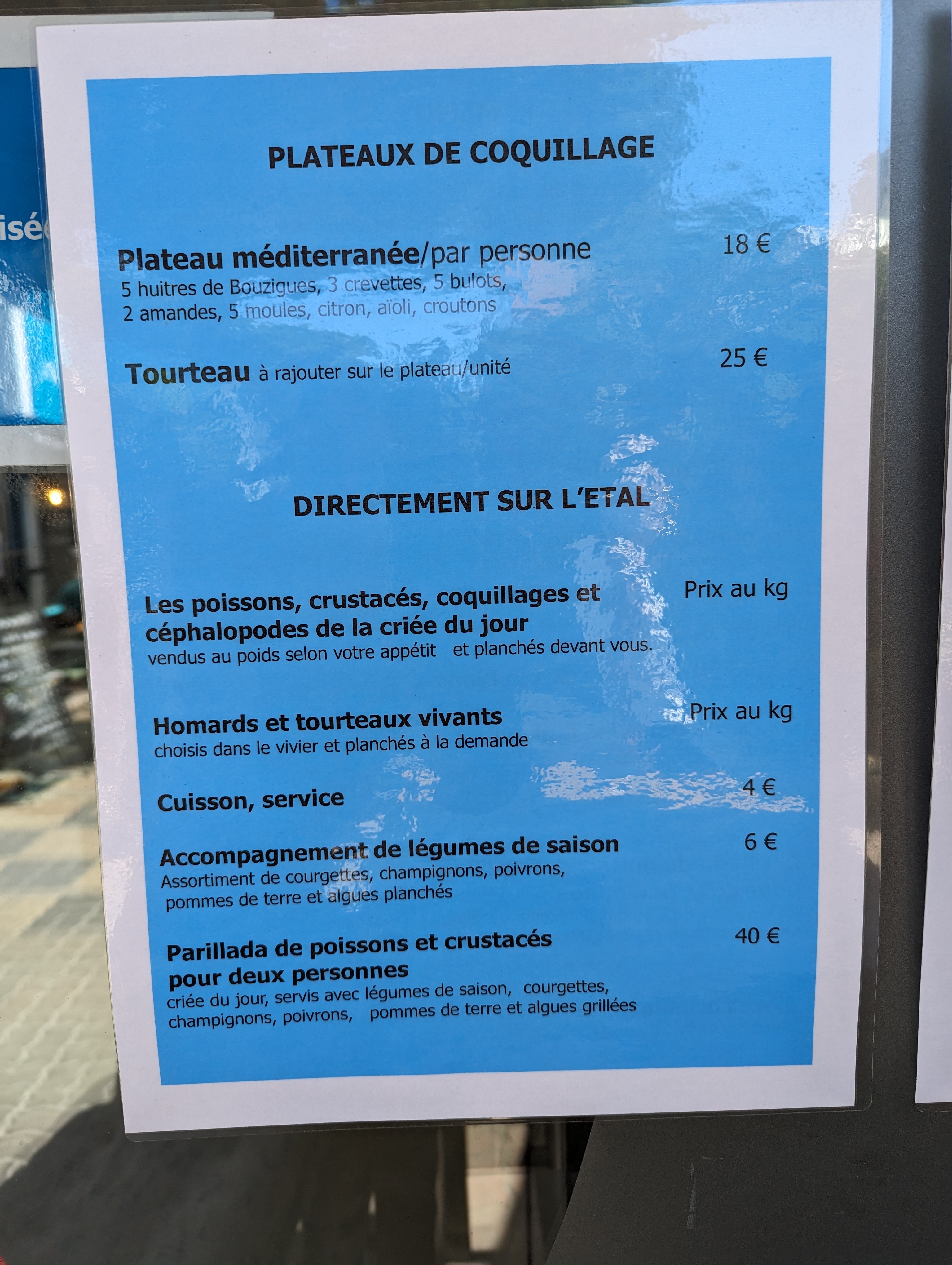 Aucune visibilité sur les prix de l'assiette. Prix du kg affichés avec en surprise des suppléments (cuisson, ouverture coquillages, aïoli, vinaigre échalotes) ... Produits de qualités. Dommage de la surprise à l'addition.