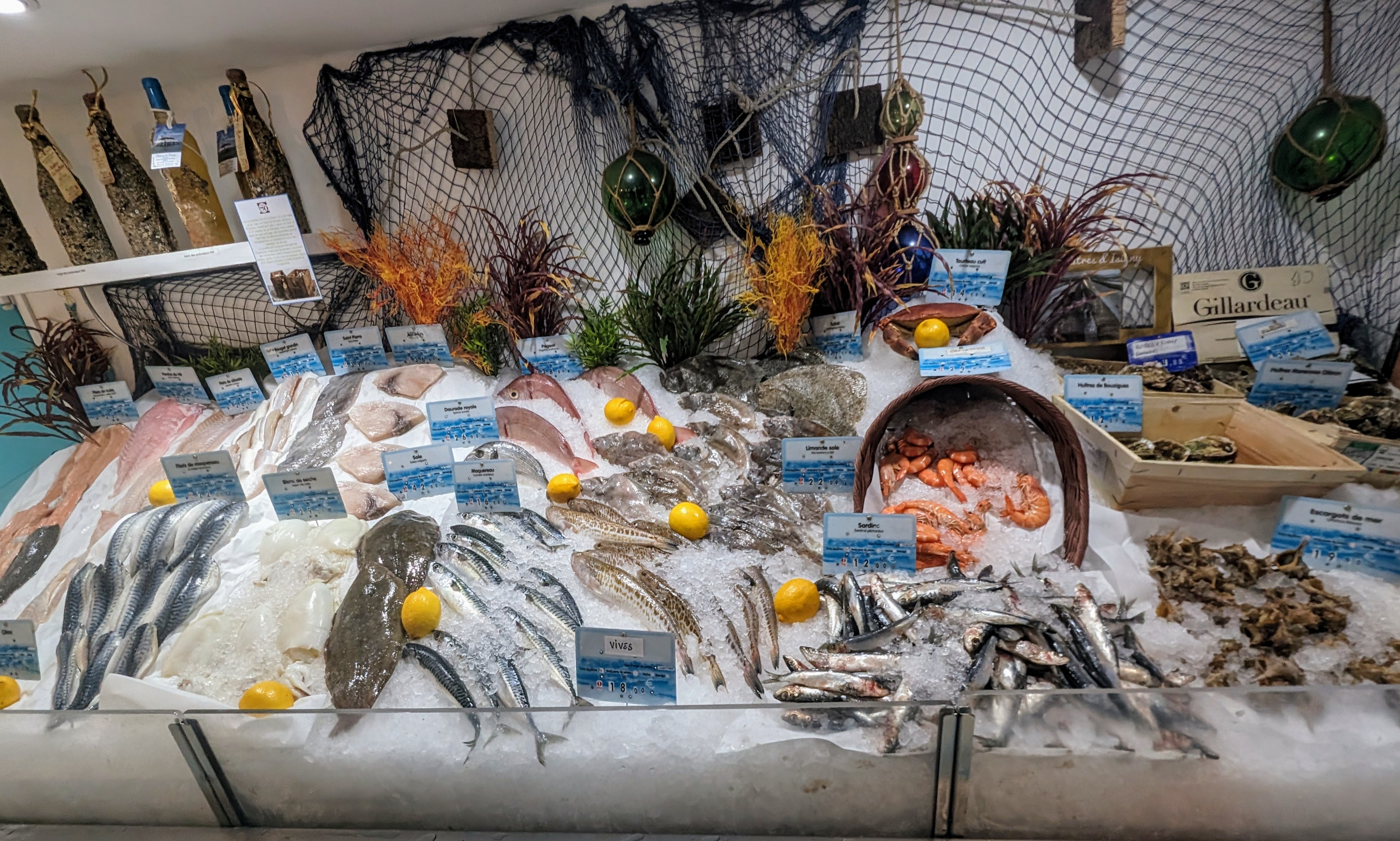Tout était délicieux ! Vous choisissez votre poisson frais et il vous est servi cuit à la perfection. Beaucoup de choix également pour les vins. Ils ont également une boutique de produits à emporter( vins, sel de Camargue, conserverie de Bretagne. Le personnel est sympa et le chef vient a votre table pour discuter! C’est également un excellent chanteur. Un coin non fumeur est à disposition de la clientèle ! Parfait pour un dîner en amoureux. Vous pouvez y aller les yeux fermés.