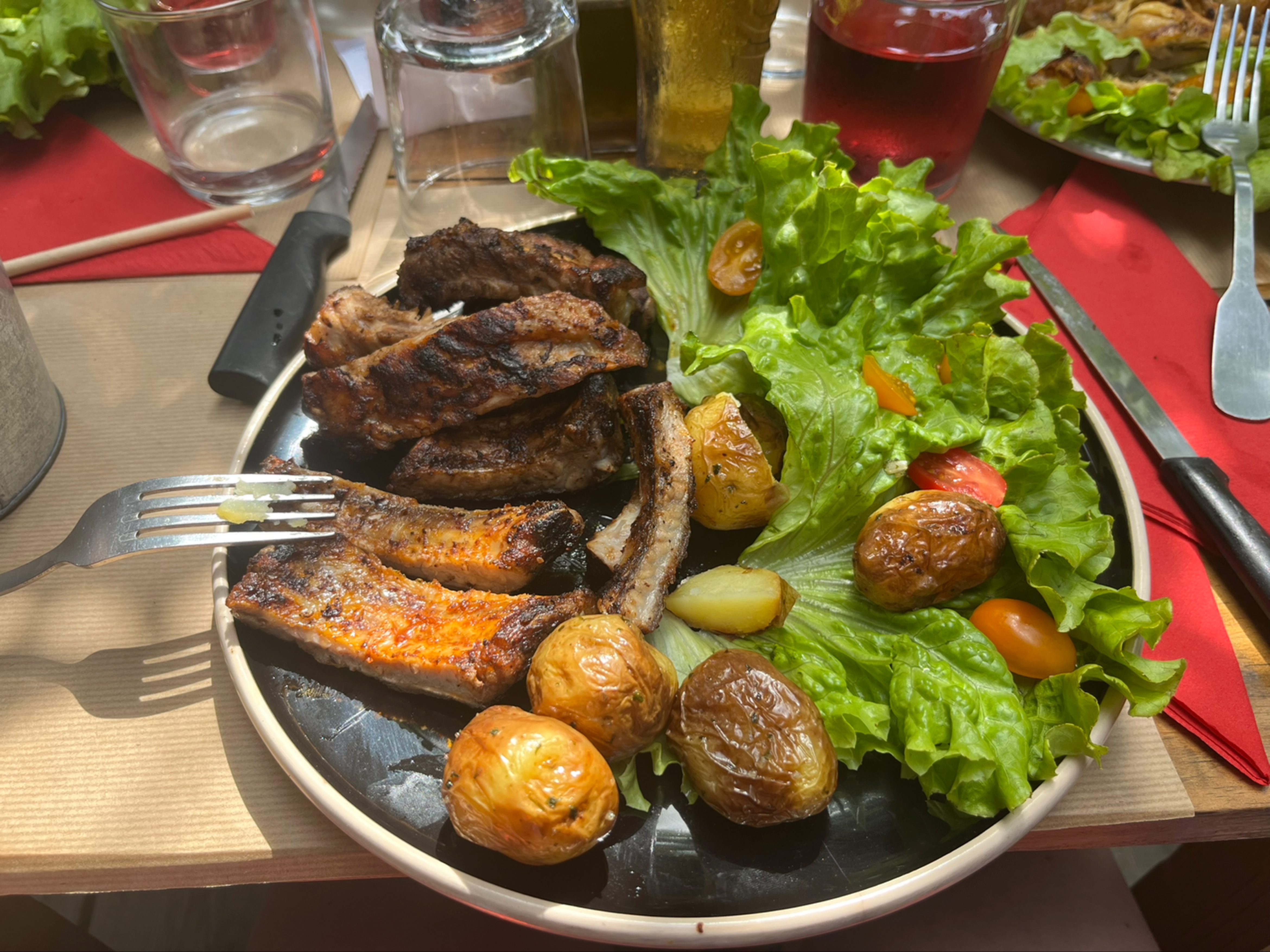 Les ribs: cuisson parfaite, sauce qui pique comme il se doit; un délice! Nous avons aussi apprécié les brochettes, le poulet et les pommes de terre, mais le top c'était vraiment les Ribs.