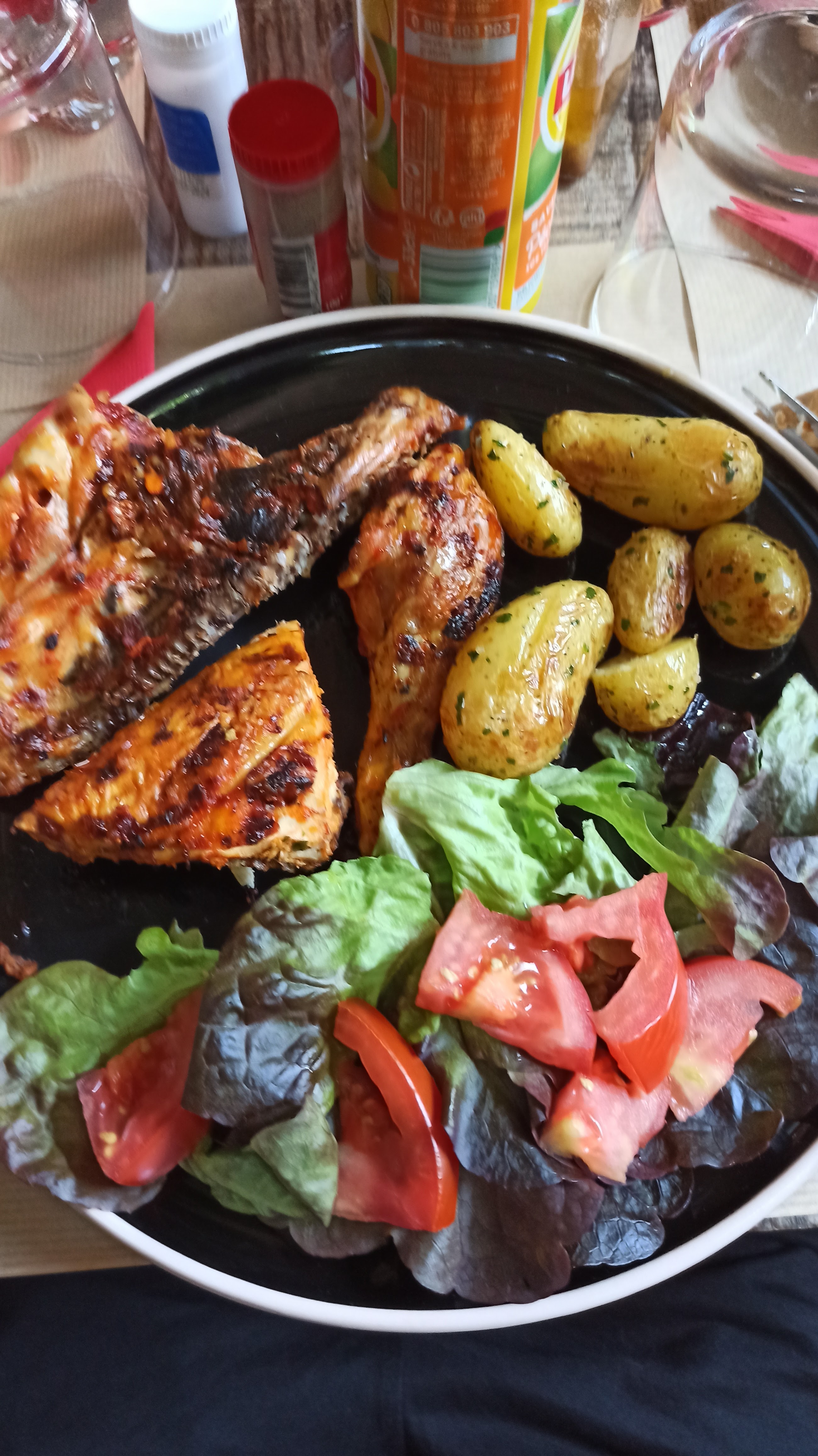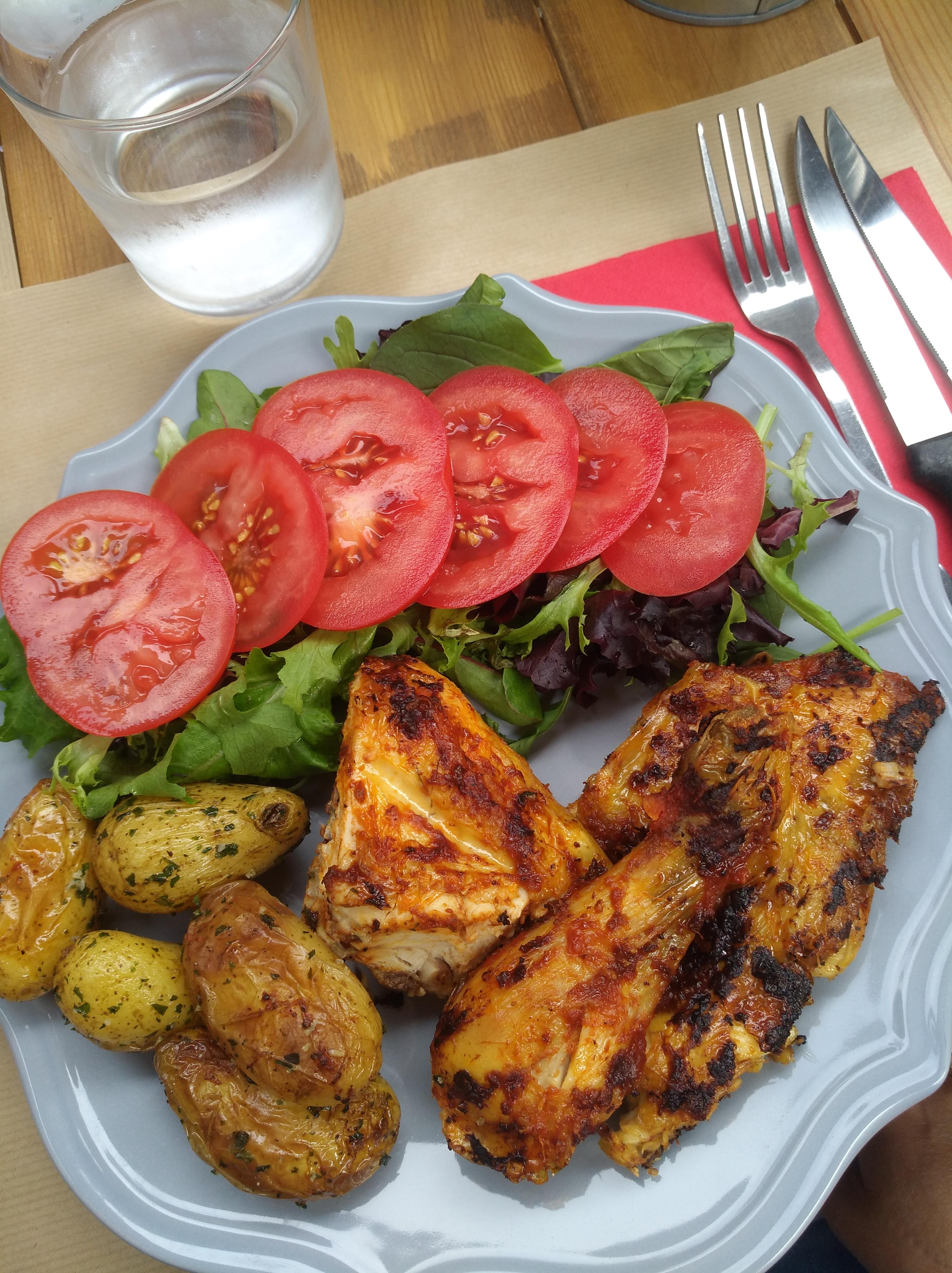 Tres bon accueil, très bien servi. Poulet cuit au bbq très bon.
