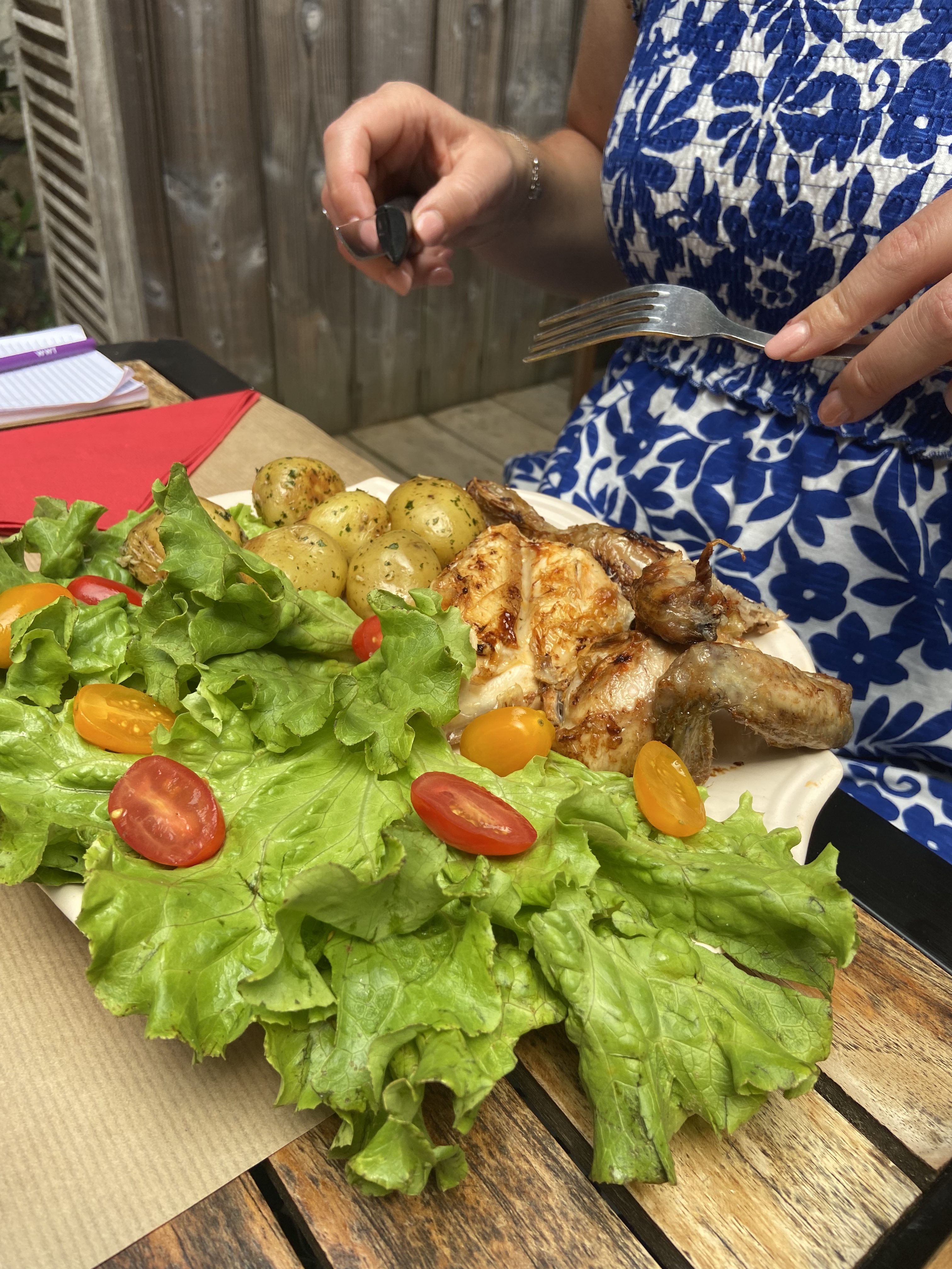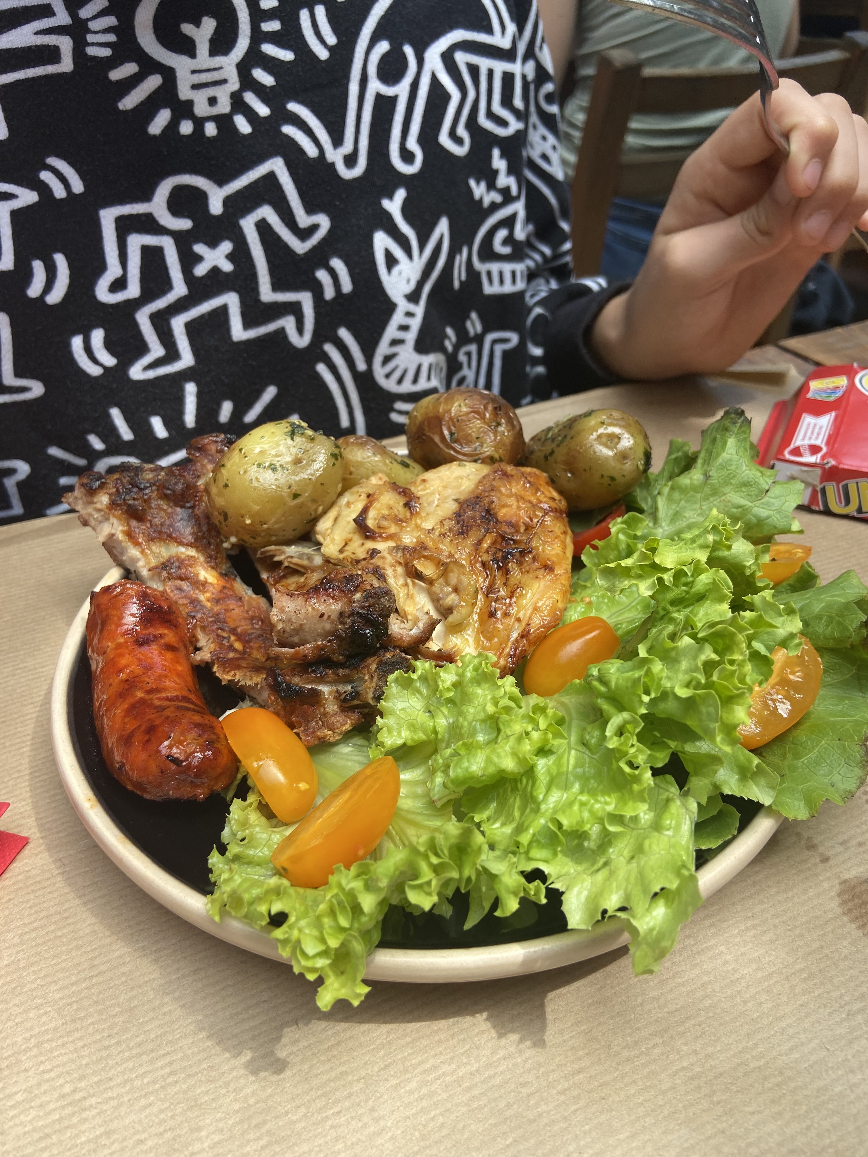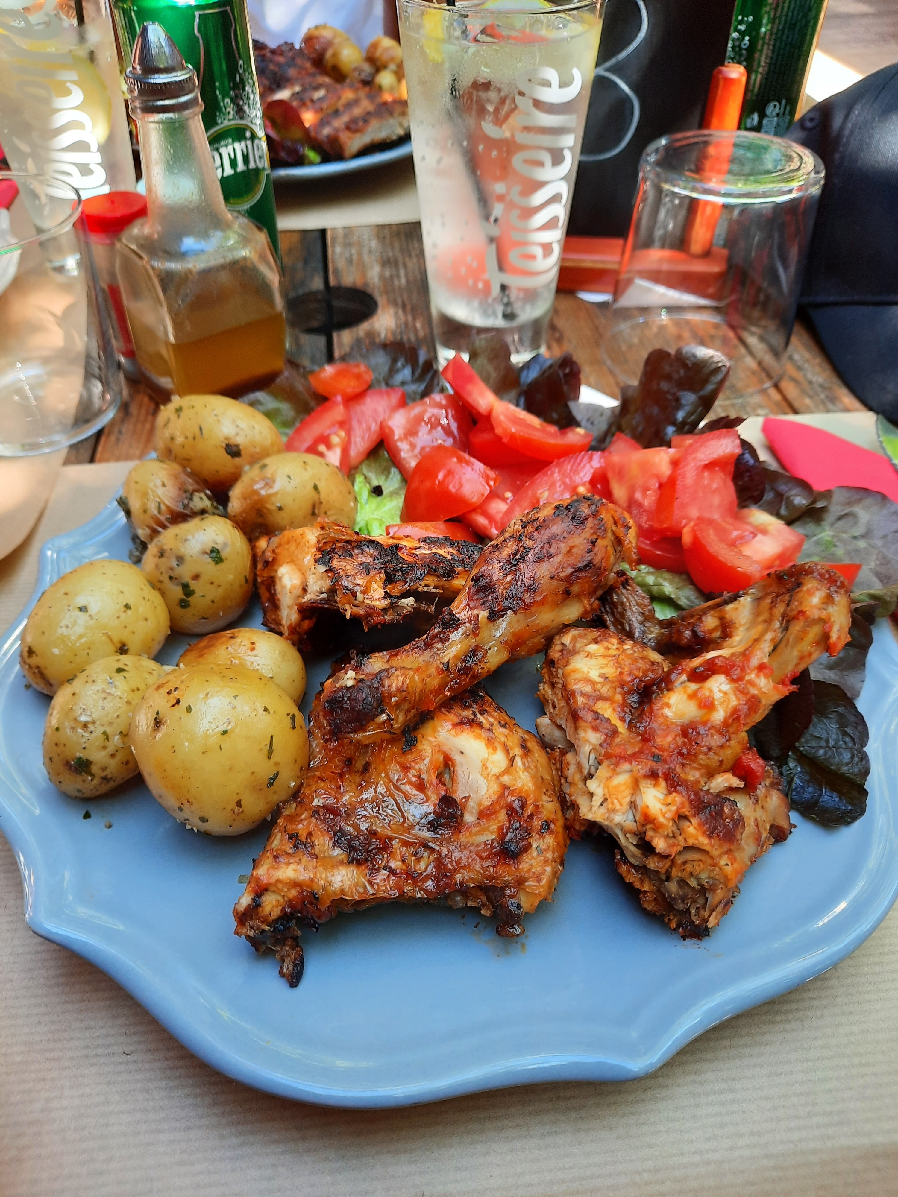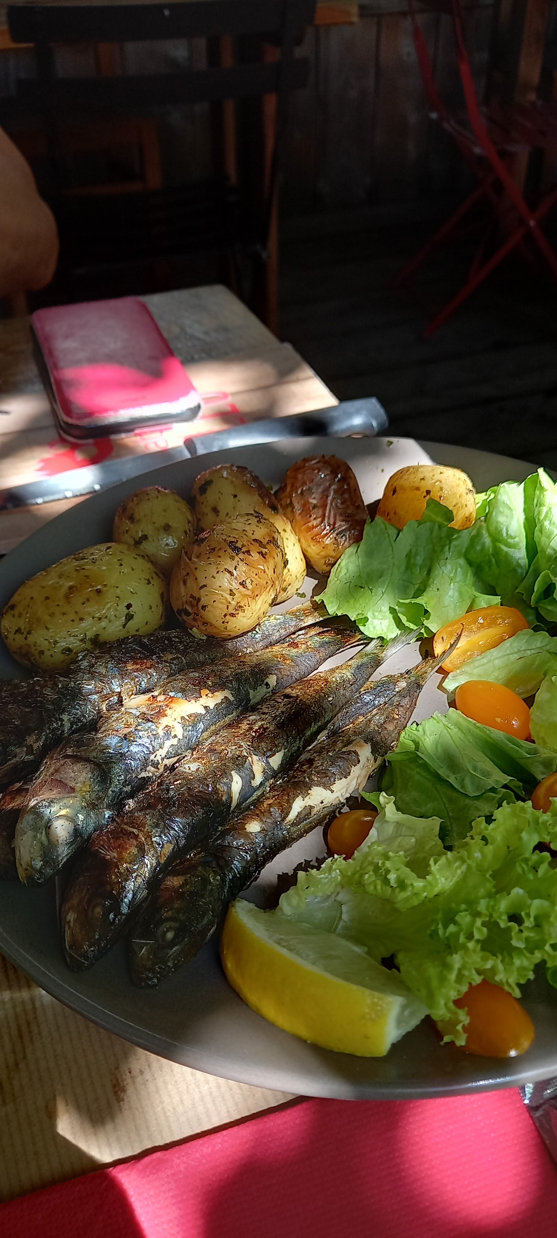 poulet et sardine délicieux de qualité, mais servis avec 5/6 pommes de terre grenailles 3 tomate cerise et 2 feuilles de salade ça faire cher pour 20 euros .. nous avons eu vite faim. sinon endroit sympathique.