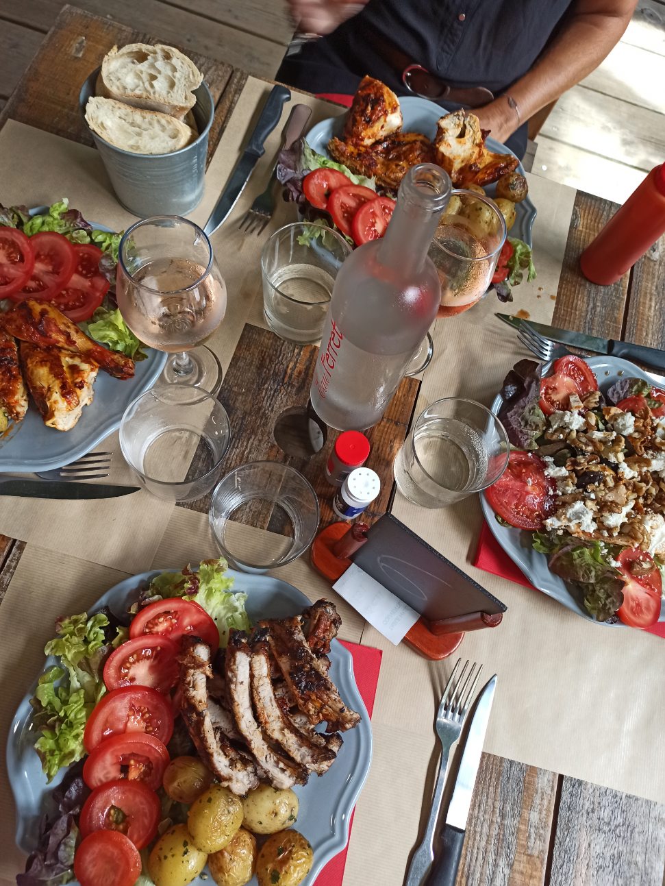 Petite halte très sympa : cadre ombragé qui reste frais malgré les grosses chaleurs, repas bon même si c'est simple, et le petit plus: les enfants ont le même choix que les adultes avec une assiette plus petite (et moins garnie bien sûr). Equipe au top, souriante et très sympathique, pas besoin d'attendre une carafe d'eau, dès qu'elle est vide on vous la remplace ! Bref nous étions ravis.