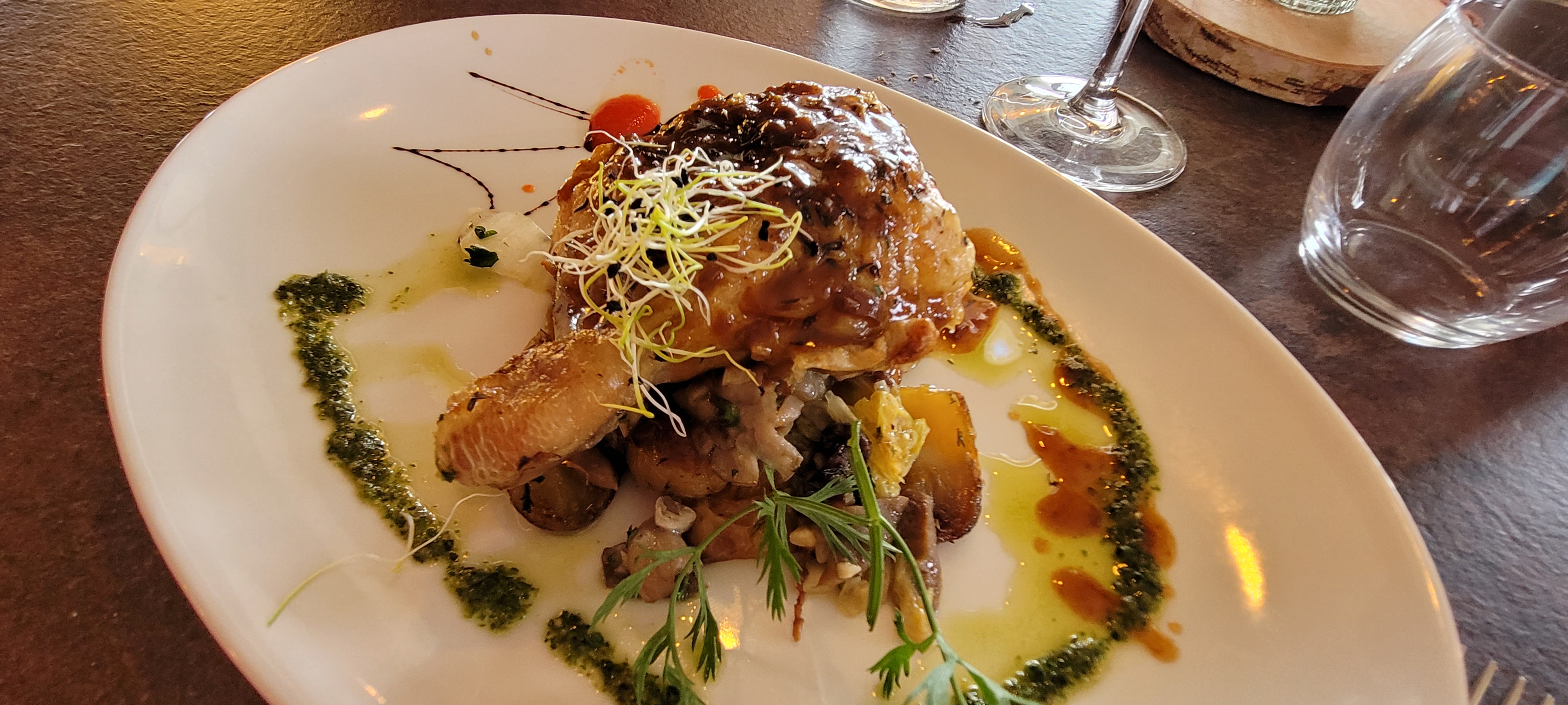 Personnel très accueillant et à l'écoute, cartes avec beaucoup de choix, accepte les chiens en laisse courte. Les plats étaient savoureux, surprenants. Attention ce n'est pas un restaurant pour manger vite mais pour déguster et prendre le temps de savourer.