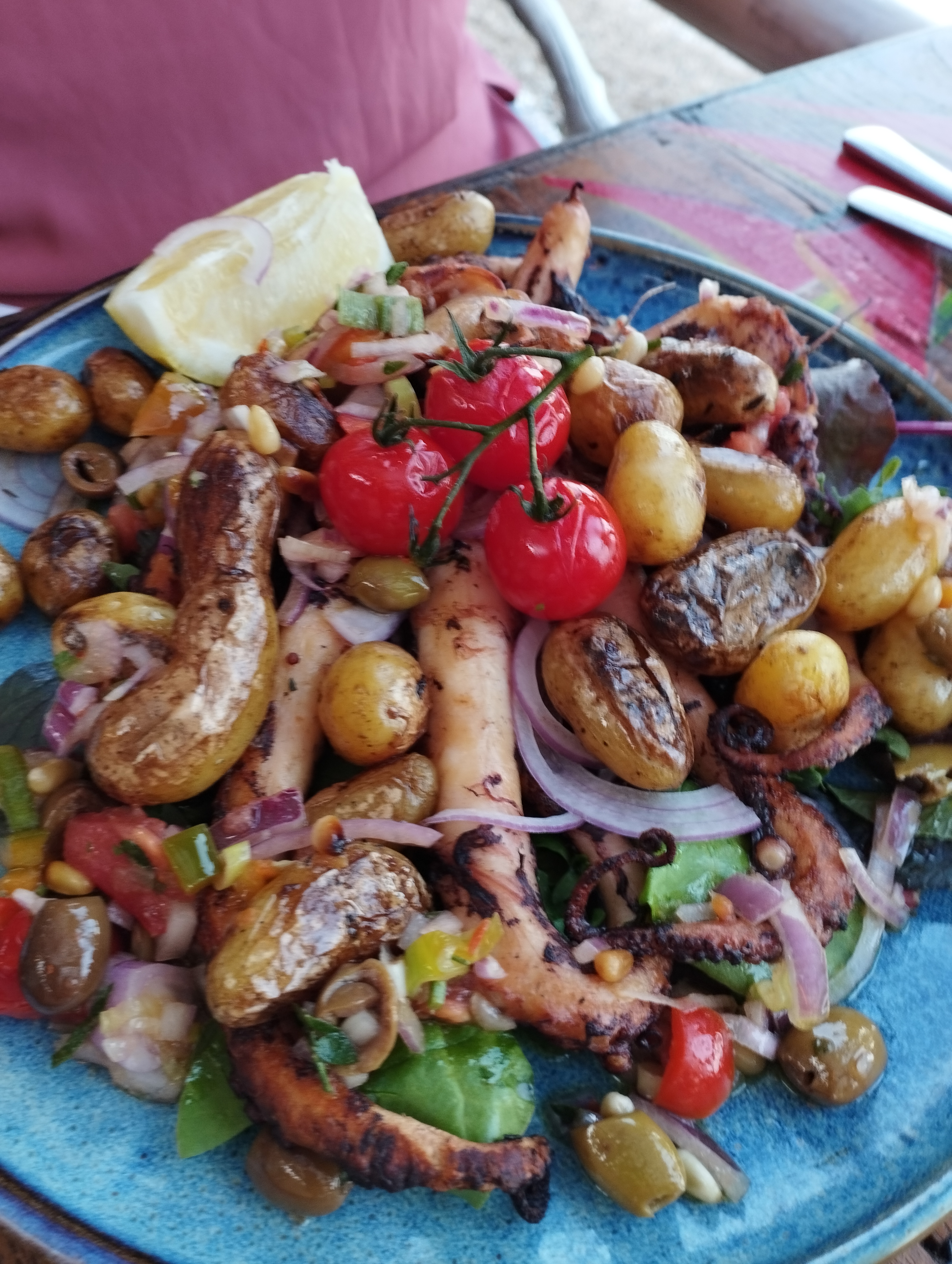 Nous avons eu la chance d’etre placé face a la mer, super agréable ! Cocktails très bon avec de bons fruits frais dessus! Viande très tendre et poulpe entier excellent également ! Les desserts sont maisons et très bons également Nous nous sommes régalés, mais prix un peu cher