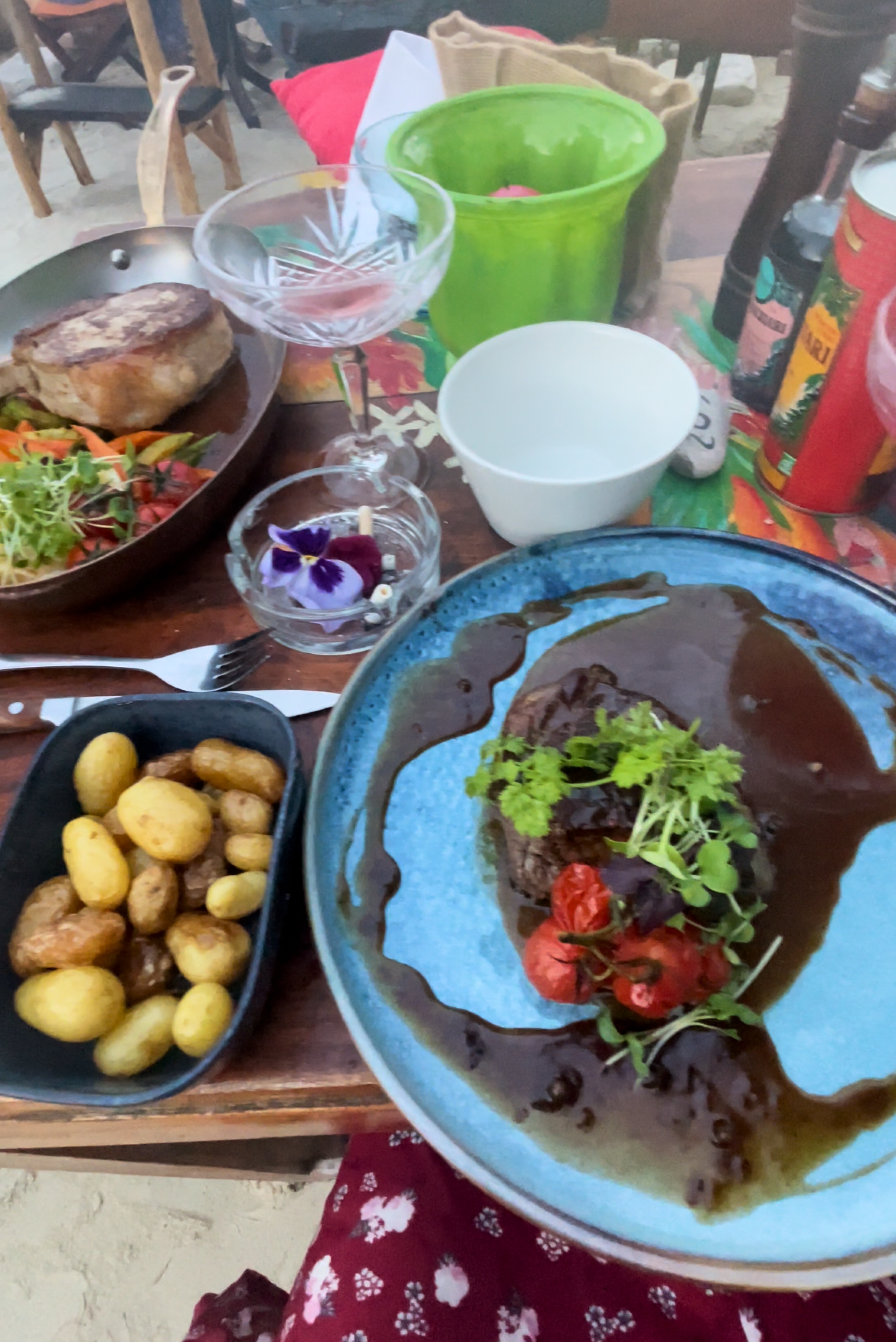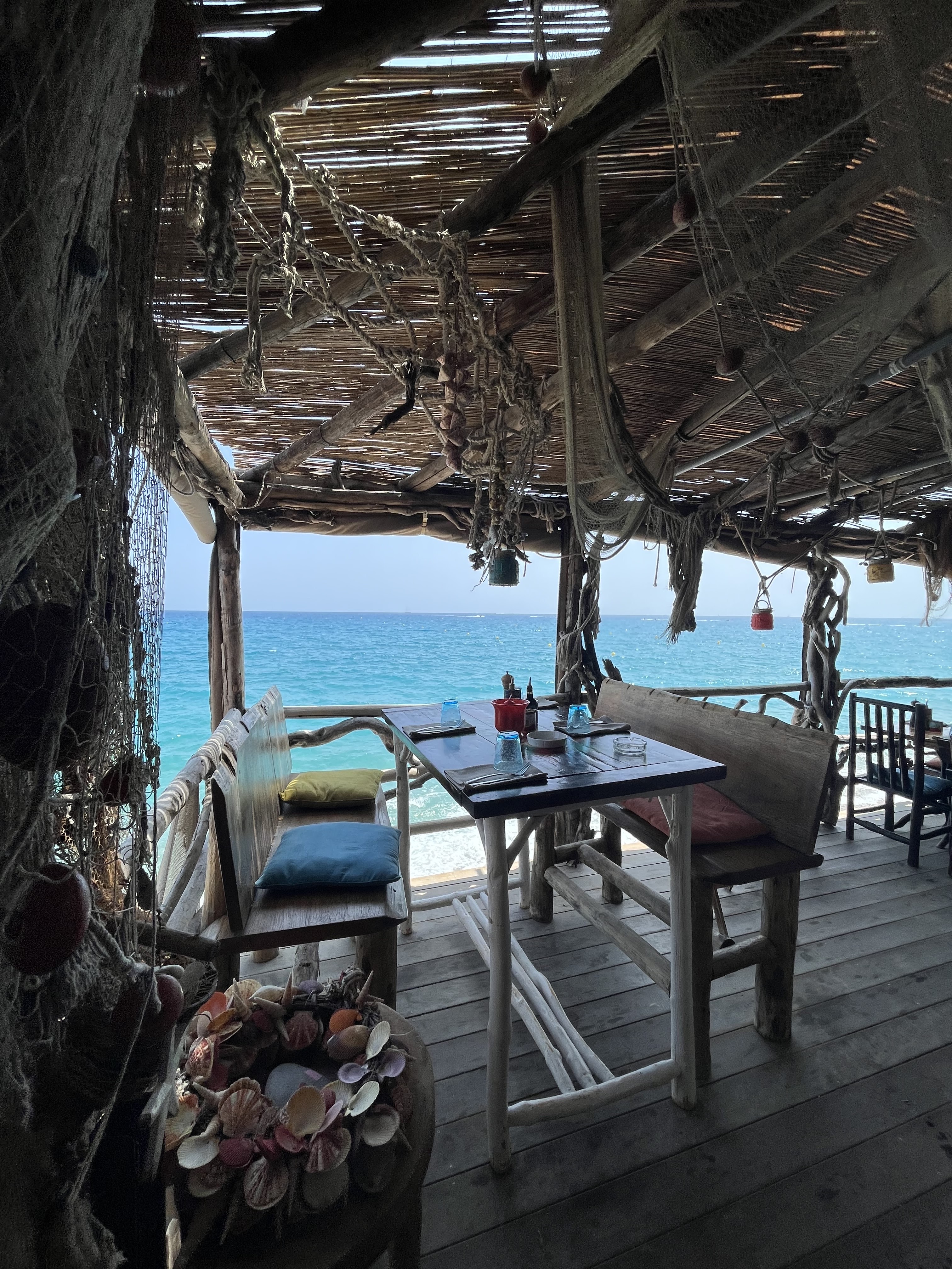 Un très bel endroit en bord de mer. Table en bois magnifique les pieds dans le sable avec un petit cocktail et quelques olives pour l’apéro : le paradis ! Concernant les plats c’est très bien cuisiné, des produits de grandes qualités et des assiettes copieuses et généreuses. Les desserts sont amenés sur un plateau de présentation et ils font tellement envie que même quand si on a plus faim on se laisse quand même tenté. Au niveau des prix il faut compter environ 60€ /personne pour un apéritif un plat et un dessert ! Service super agréable même si parfois les serveurs ont l’air débordés. Je recommande pour passer un bon moment dans un super cadre c’est vraiment le top