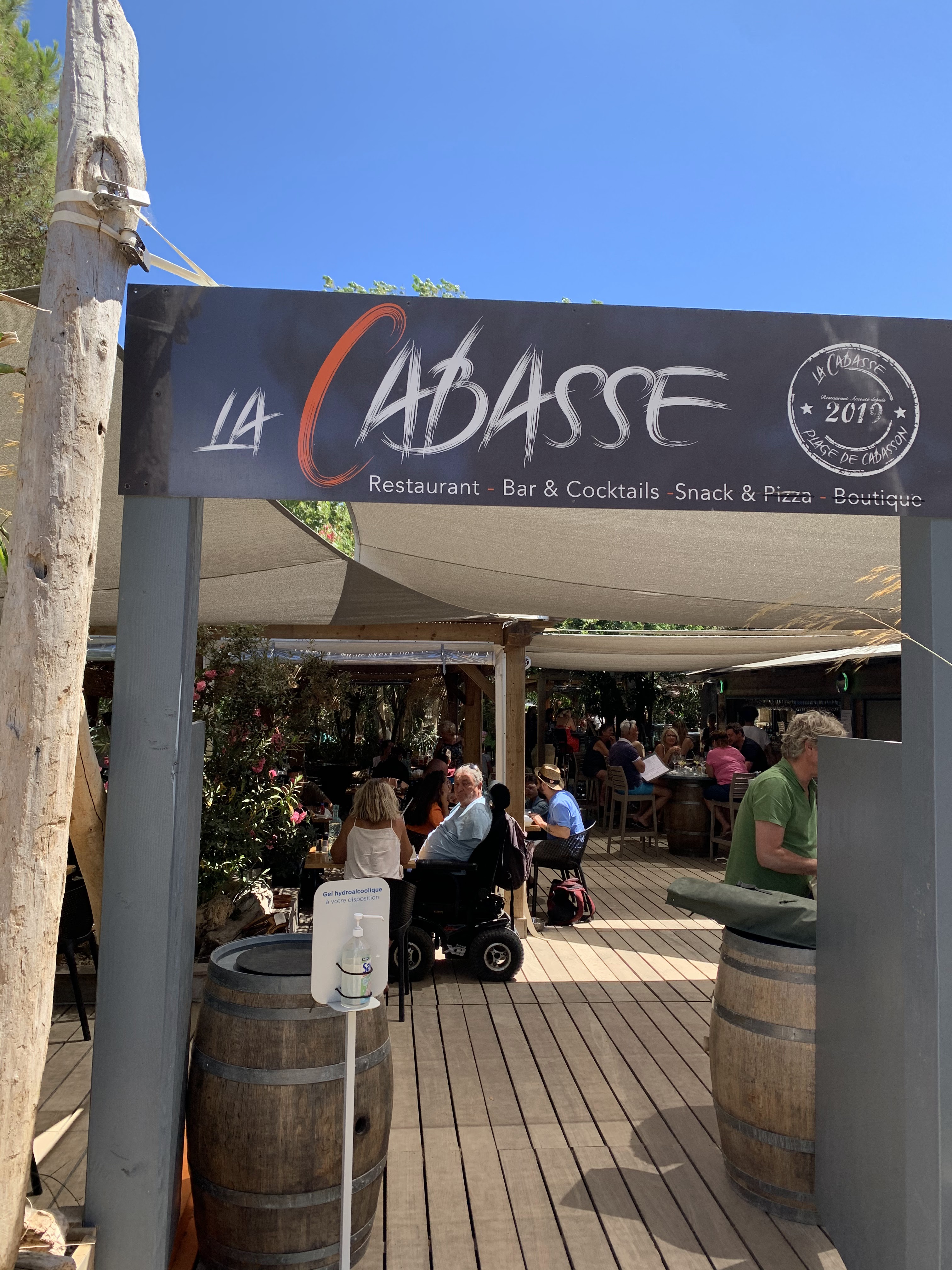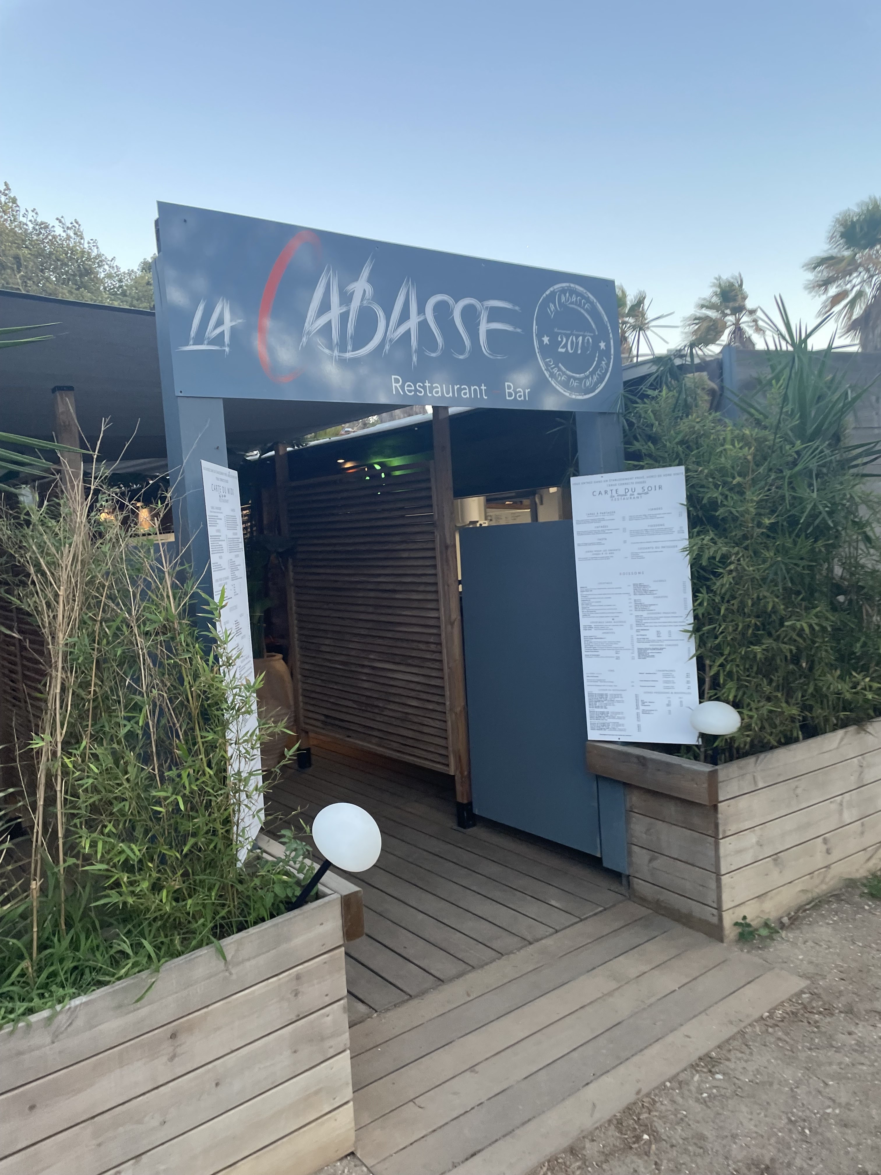 Okay, peut-être que dopé par les paysages fabuleux du sentier du littoral, je n’ai vu que du positif et n’ai donc que du positif à vous restituer au sujet de La Cabasse : 1) une deco tres agreable avec son usage immodéré des chutes de bois enfilées 2) un service aimable et tres efficace. Etant attendu qu’on est dans un restau de plage, pas dans un etoilé Michelin 3) du côté de l’assiette la fraicheur des legumes accompagnant une gouteuse anchoïade est parfaite. Le Loup de la pêche du jour fut parfaitement cuit, le prix au kilo est dans la norme 4) la carte des vins ouvre grand la porte aux crus locaux. Pri et variétés acceptables Après en plein été, mieux vaut être chanceux si vous n’avez pas réservé... mais c’est valable sur toute la côte en PACA... enfin je crois !