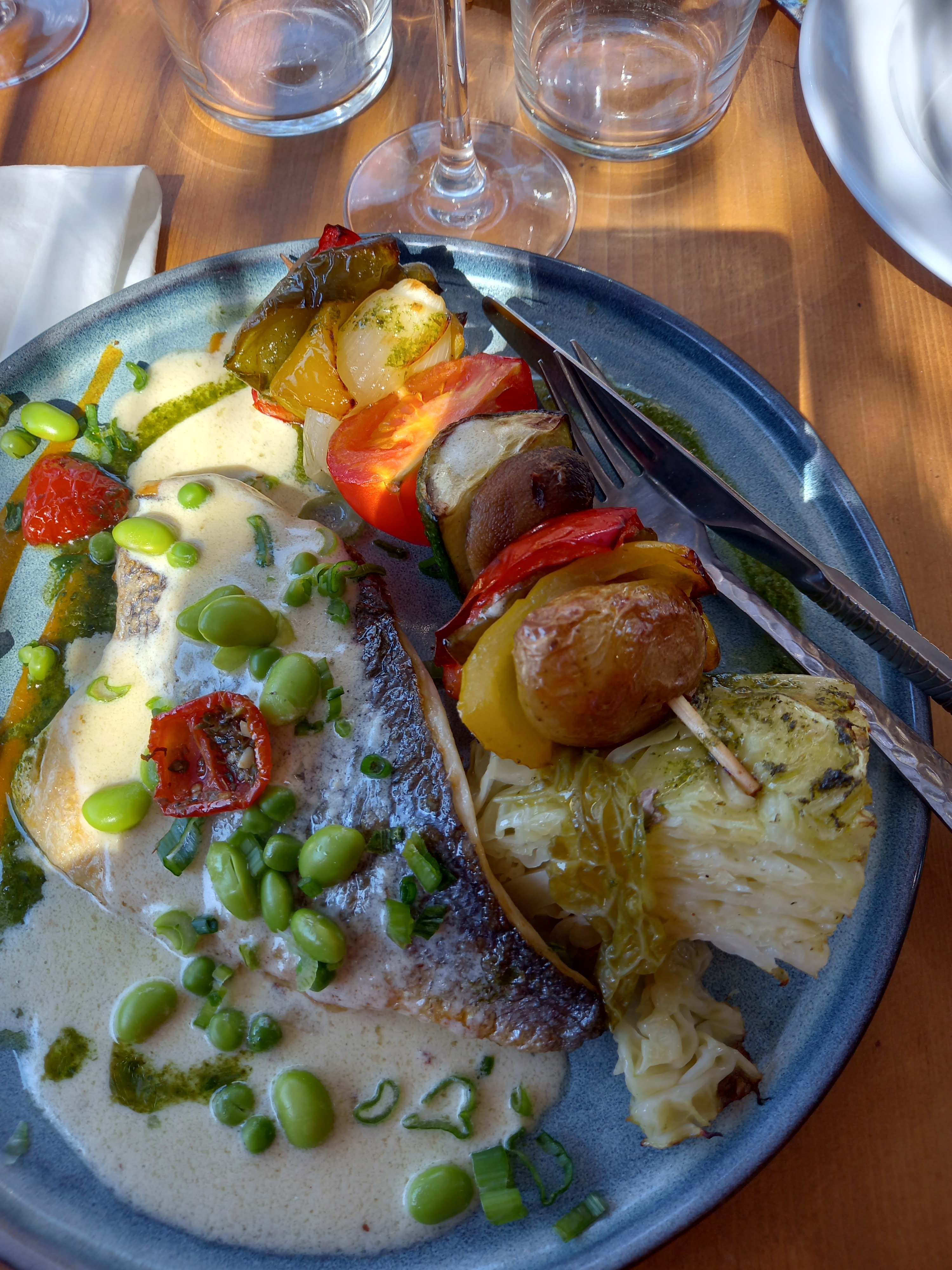 Jolie soirée au restaurant La Cabasse. Si le vent soufflait fort nous étions bien protégés à l’abris du Fort de Bregançon. Cuisine méridionale de rigueur. Avec une carte resserrée, on ne peut pas se plaindre de la fraîcheur des produits que l’on retrouve dans un filet de loup à partager, ou la générosité de la truffe noire. Les vins (et champagne) restent à prix très attractifs. Le soir le parking est gratuit. Merci ! ☺️