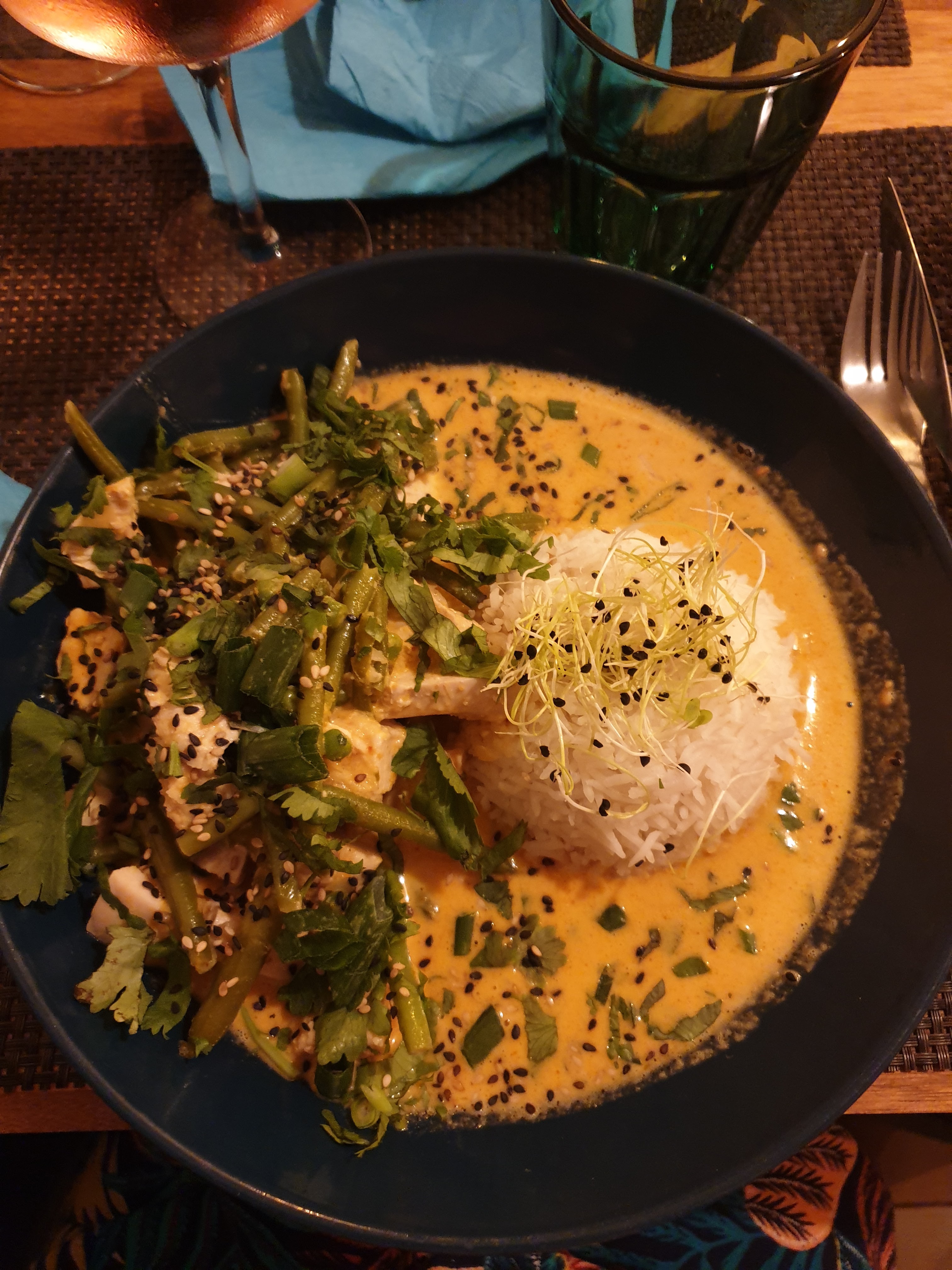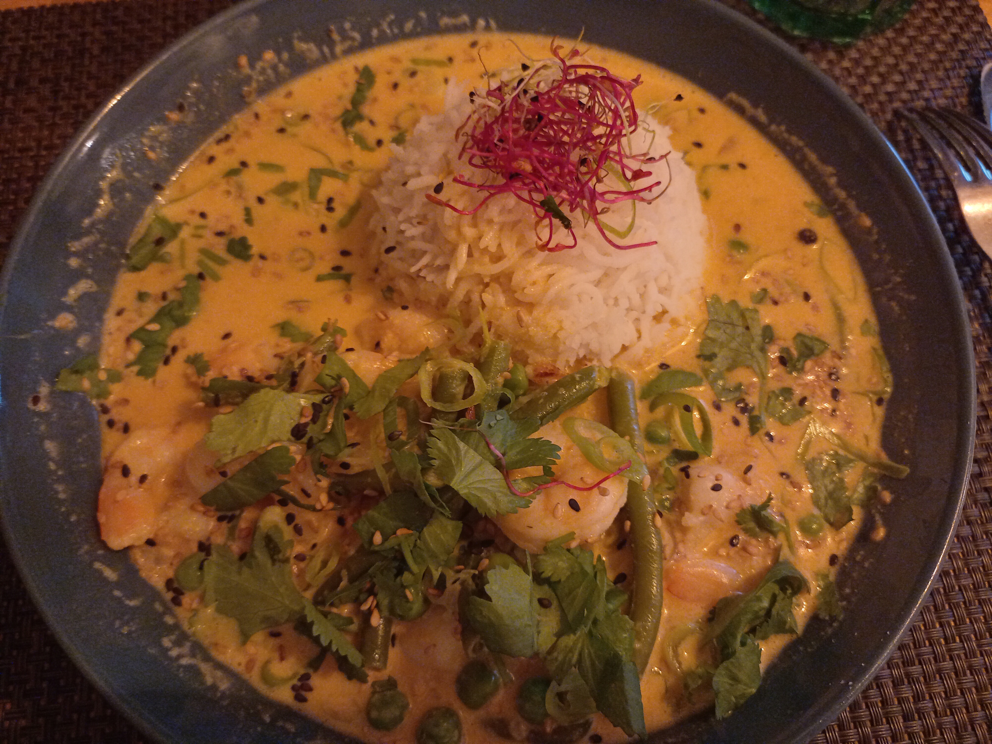 On a été manger dimanche soir et on a prit et Red Thai Curry et le canard en plat ainsi que des bouteilles de vin, tout etait excellent ! Restau très chaleureux avec un service au top Je conseil !