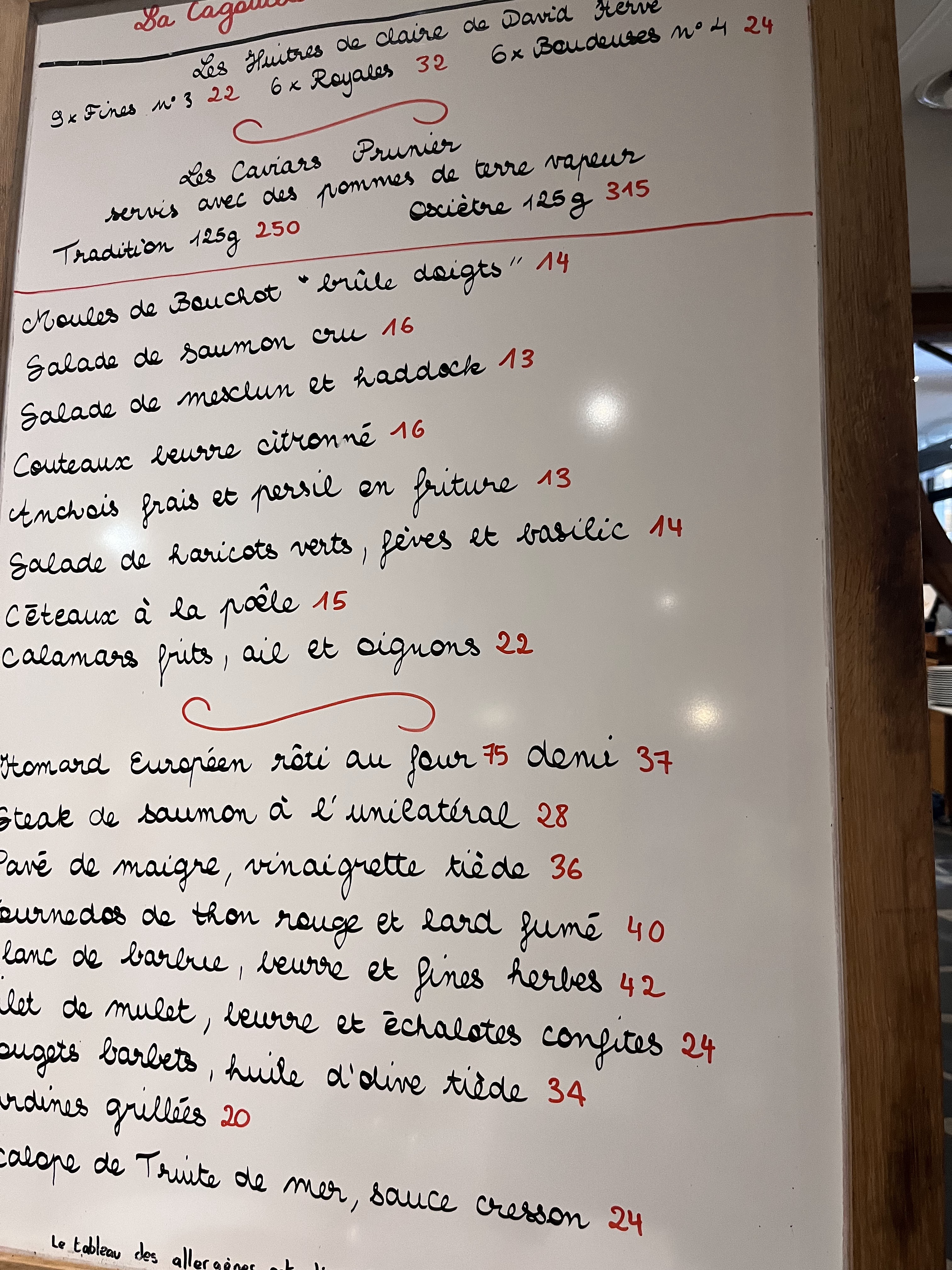 Tres restaurant de poissons. Il faut réserver car très apprécié . Les huîtres étaient parfaites et les ceteaux pas si courants sont très bons. Service attentionné et précis. De bons desserts notamment le clafoutis selon mes amis.
