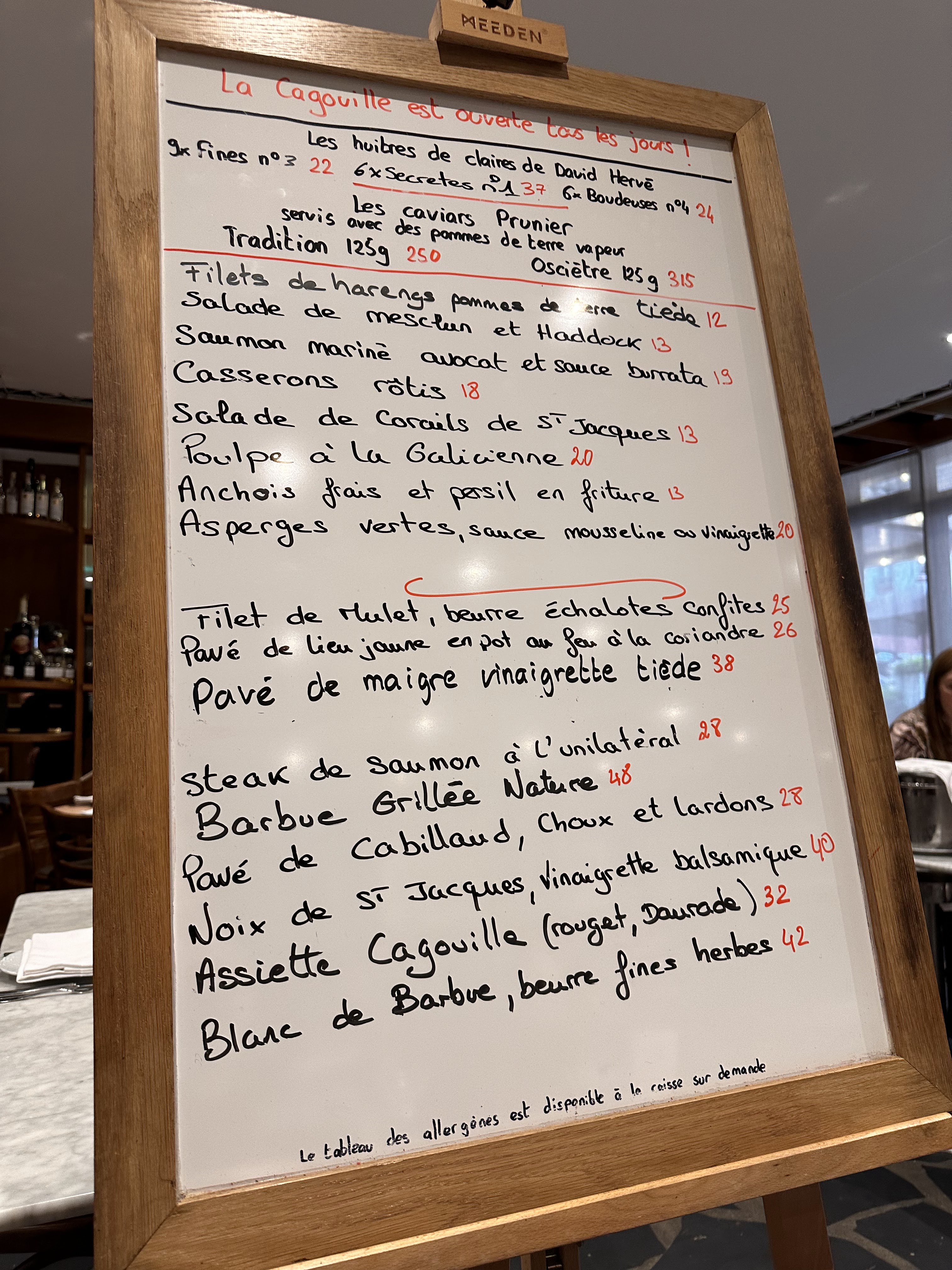 Des huîtres incroyablement délicieuses, du poisson blanc, un champagne merveilleux, les desserts sont généralement excellents ; serveurs sympas. J'ai beaucoup aimé tout.