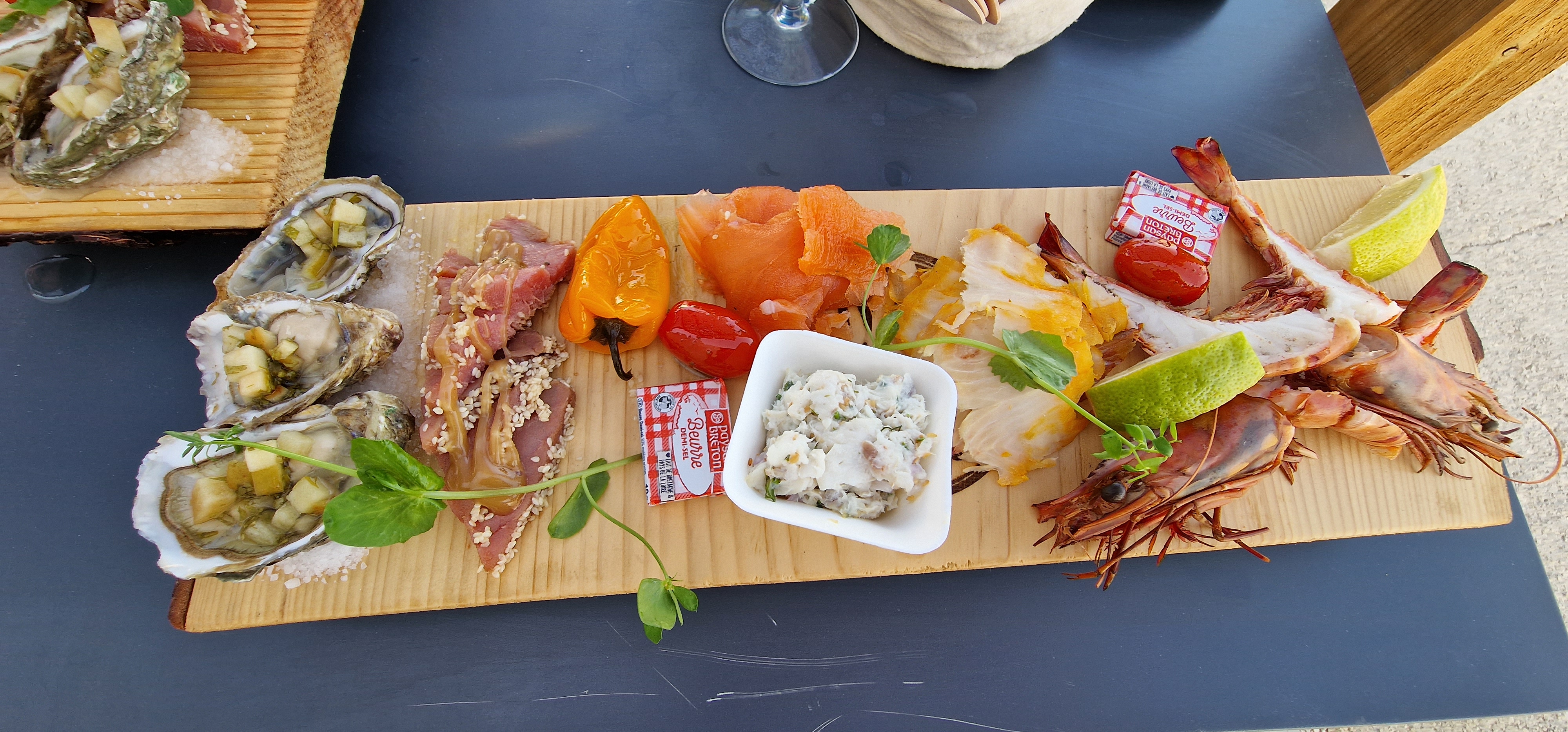 Planches d’exceptions, que ce soit poissons ou fromages ! Vu imprenable à l’ombre de la tonnelle ,au top !