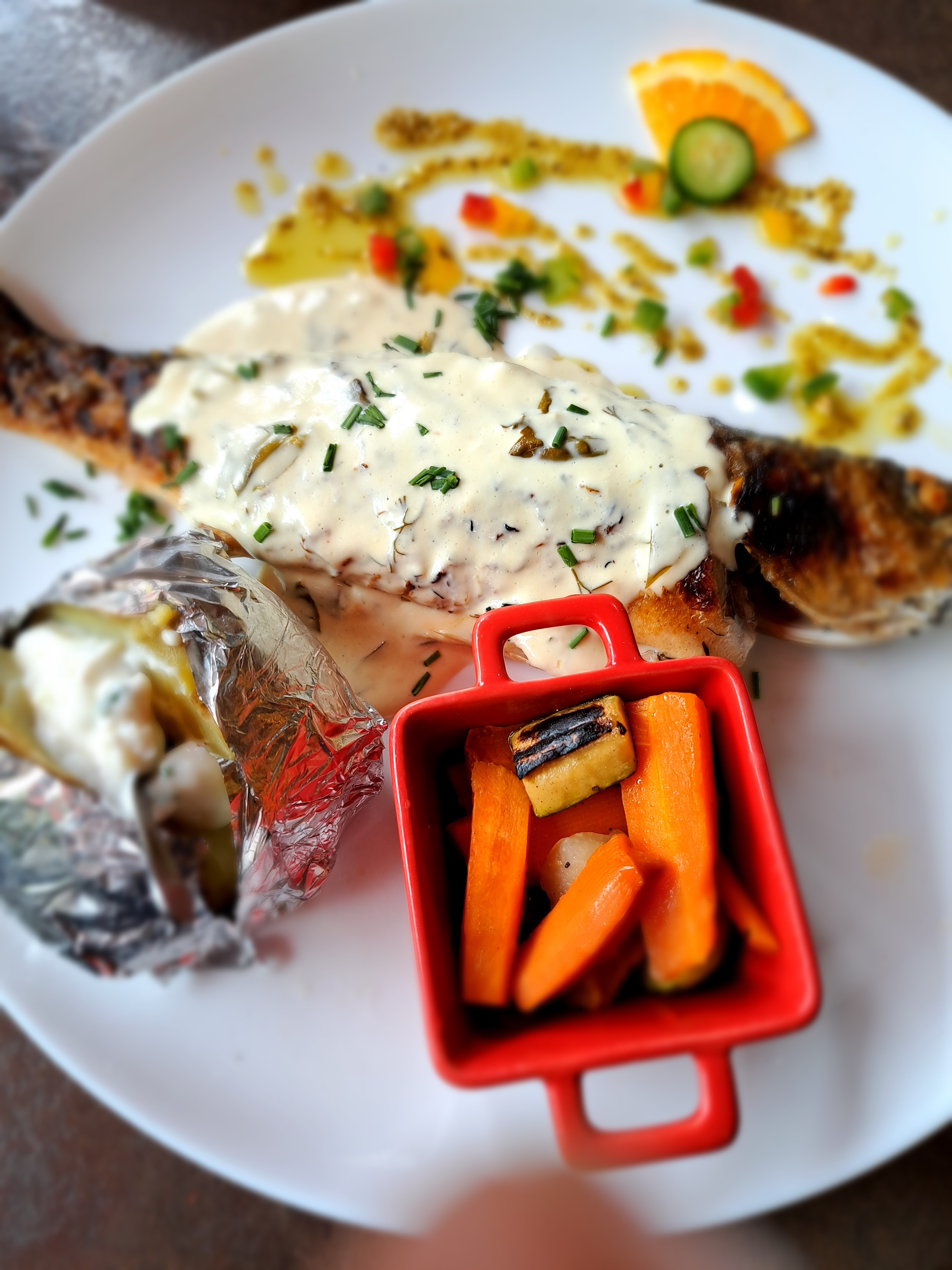 Poisson très bon, frais et accompagné de légumes frais, très bonne assiette. Bon accueil, rien à redire. Musique agréable et un feu de cheminée apprécié.