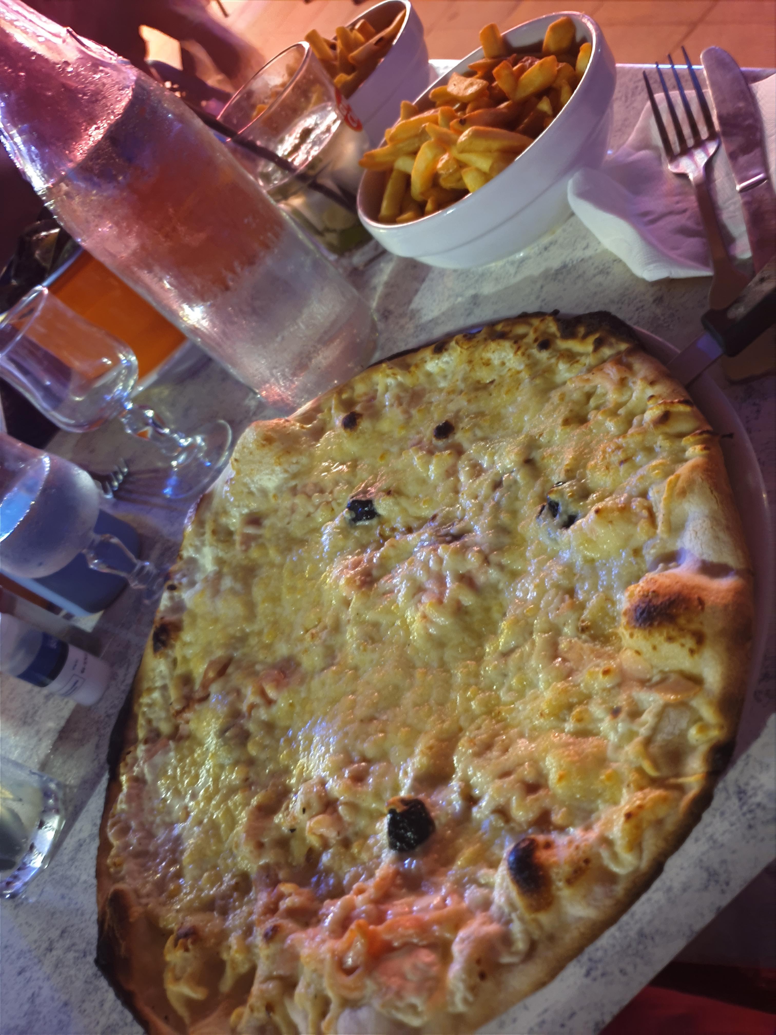 Ne demandez pas une pizza aux anchois : pas de garniture, une pauvre sauce tomate bof bof!!!!! Ne demandez pas un dessert qui n'y est pas ( par contre à vous de savoir s'il est disponible ou pas ! ) Par contre mon mari a apprécié l'entrecôte : bonne cuisson et bonne quantité...Le personnel sympa....