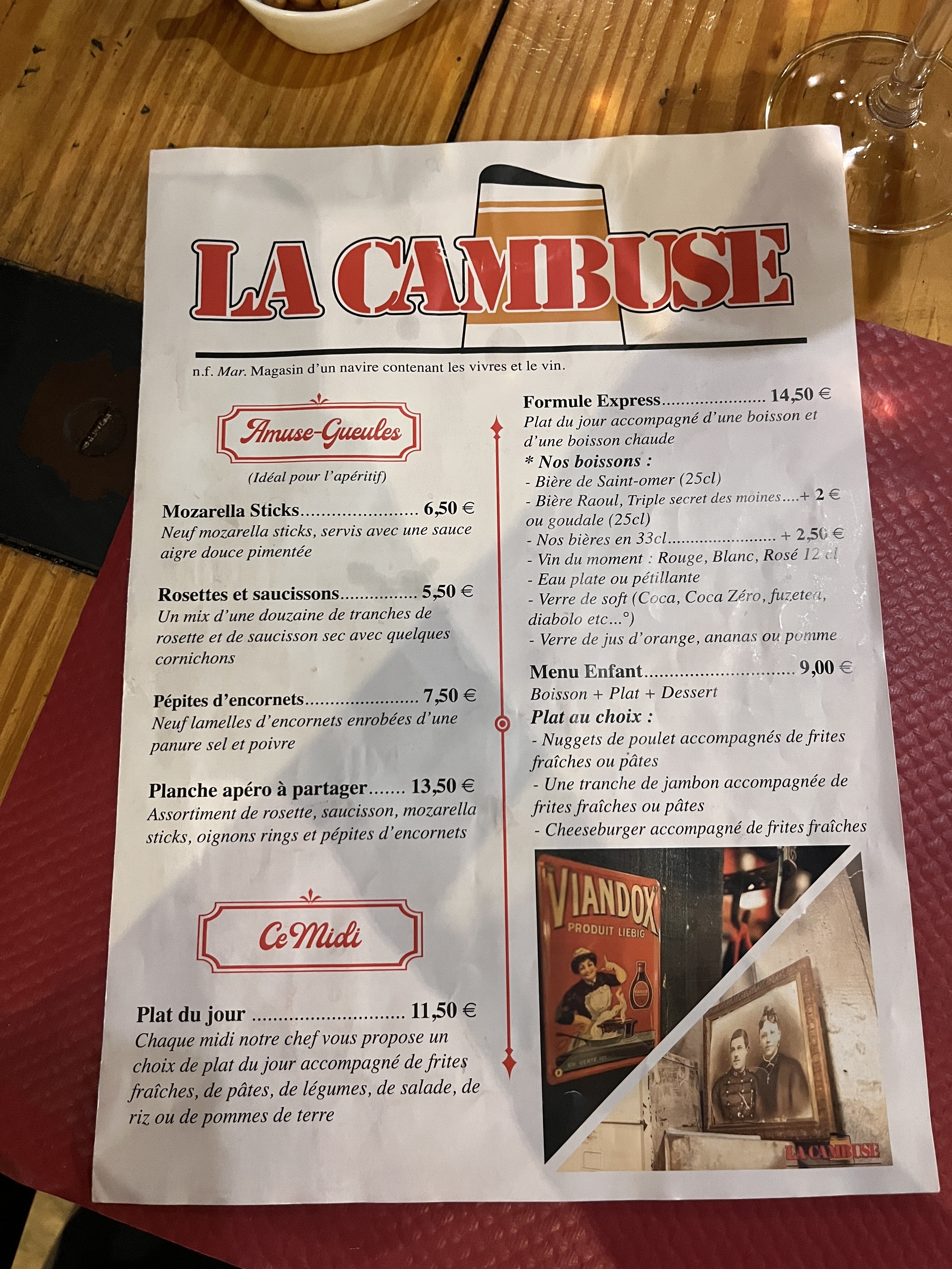 Entrée surprenante dans une ruelle qui ne paie pas de mine. Excellente surprise à l'intérieur. Un petit endroit sympathique à la décoration thématique très soignée. Carte typique de nos repas du Nord. Nous avons savouré la carbonnade flamande maison de la Cambuse, à tomber ! Nous viendrons tester les autres recettes ! Bonne continuation à ce petit restaurant 🤤