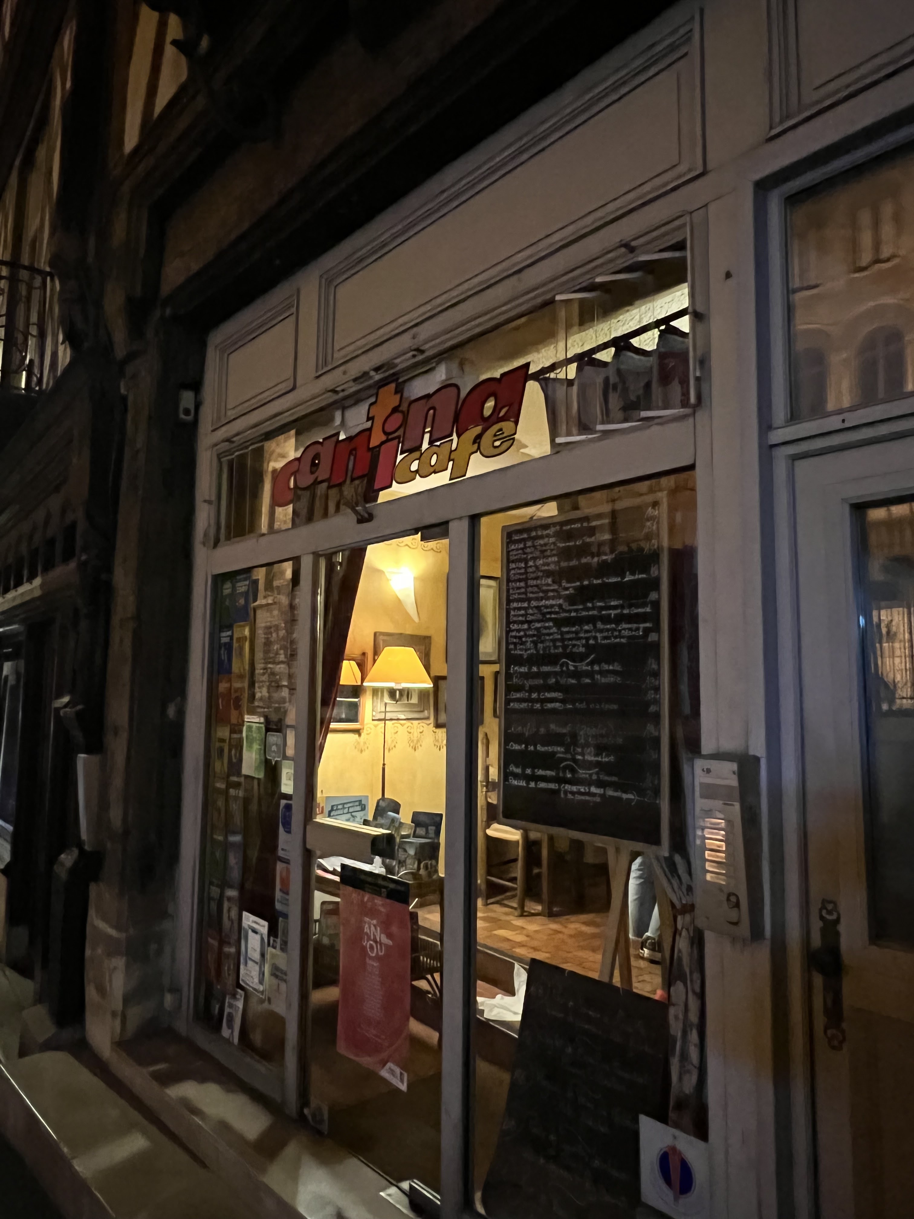 Une devanture typique et une carte alléchante ainsi que de multiples pancartes du Routard nous on fait choisir la cantina café un midi de juillet ensoleillé. Bien nous en a pris, car ce fut une superbe découverte : les plats étaient délicieux, l'ambiance chaleureuse et authentique. Dommage que nous n'habitions pas à Angers, car ce petit lieu plein de charme deviendrait vite notre nouvelle Cantine.a !