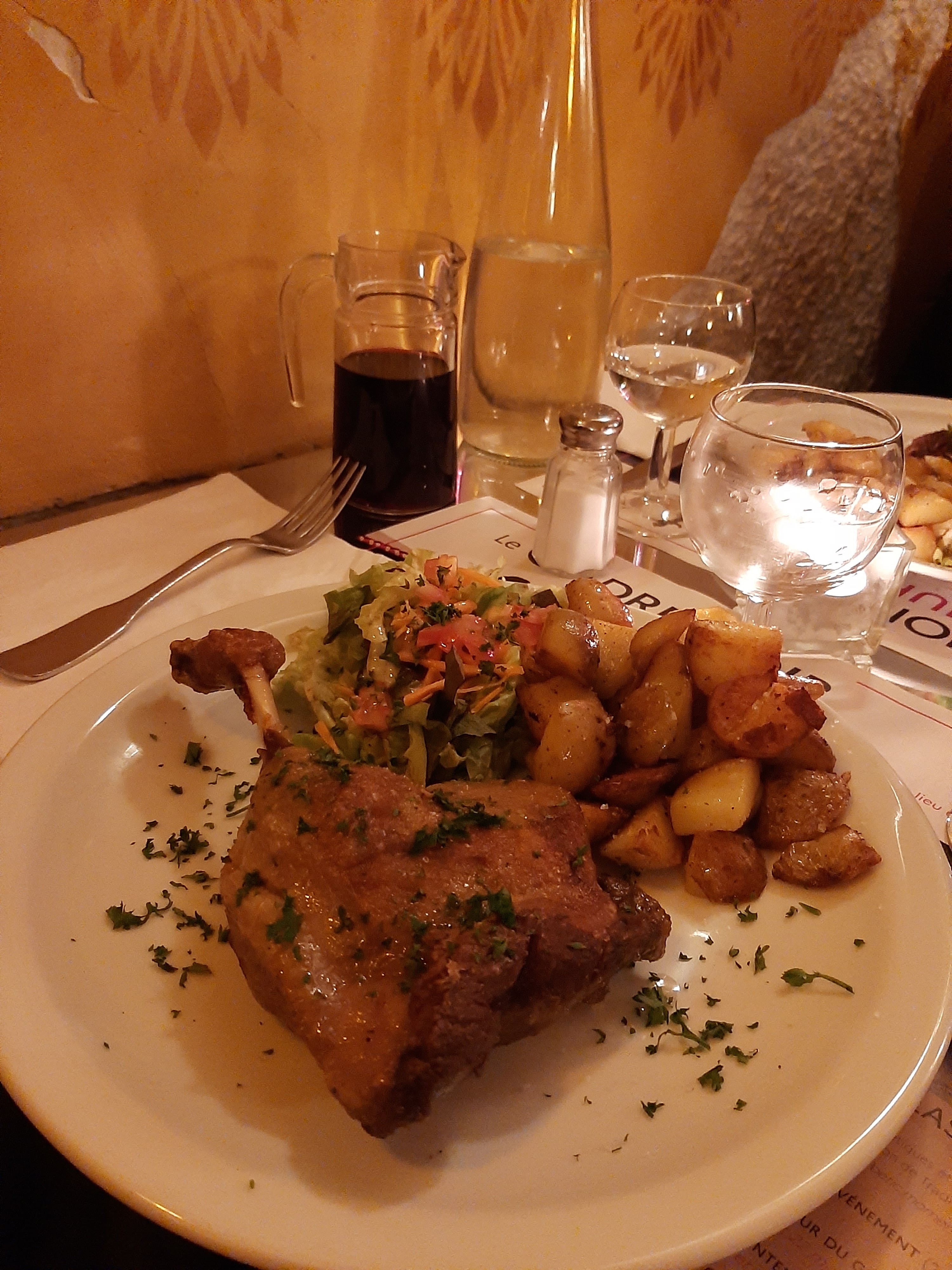 Très bon,et copieux. Le vin un peu cher mais bon. Déco authentiquement vintage.