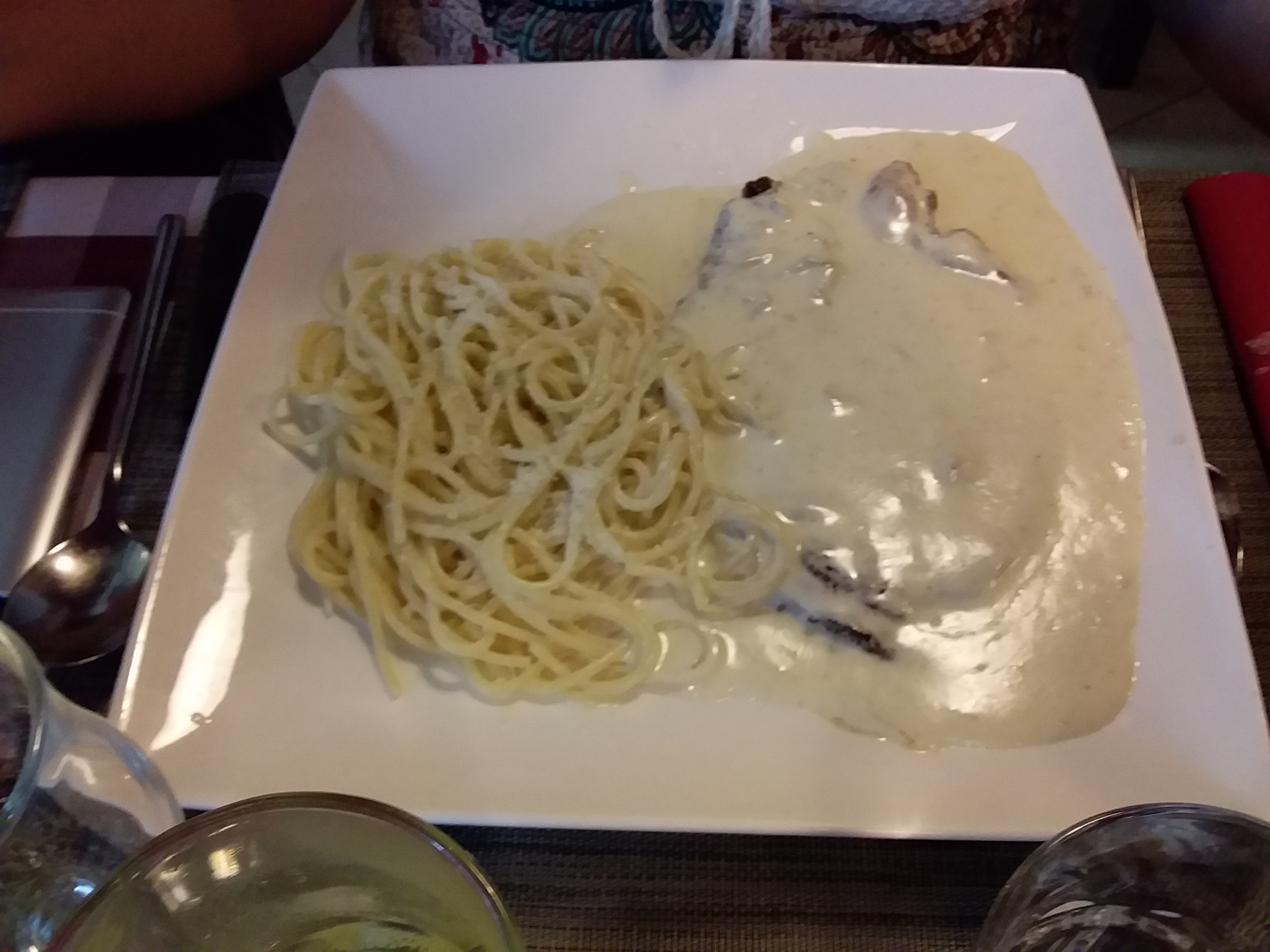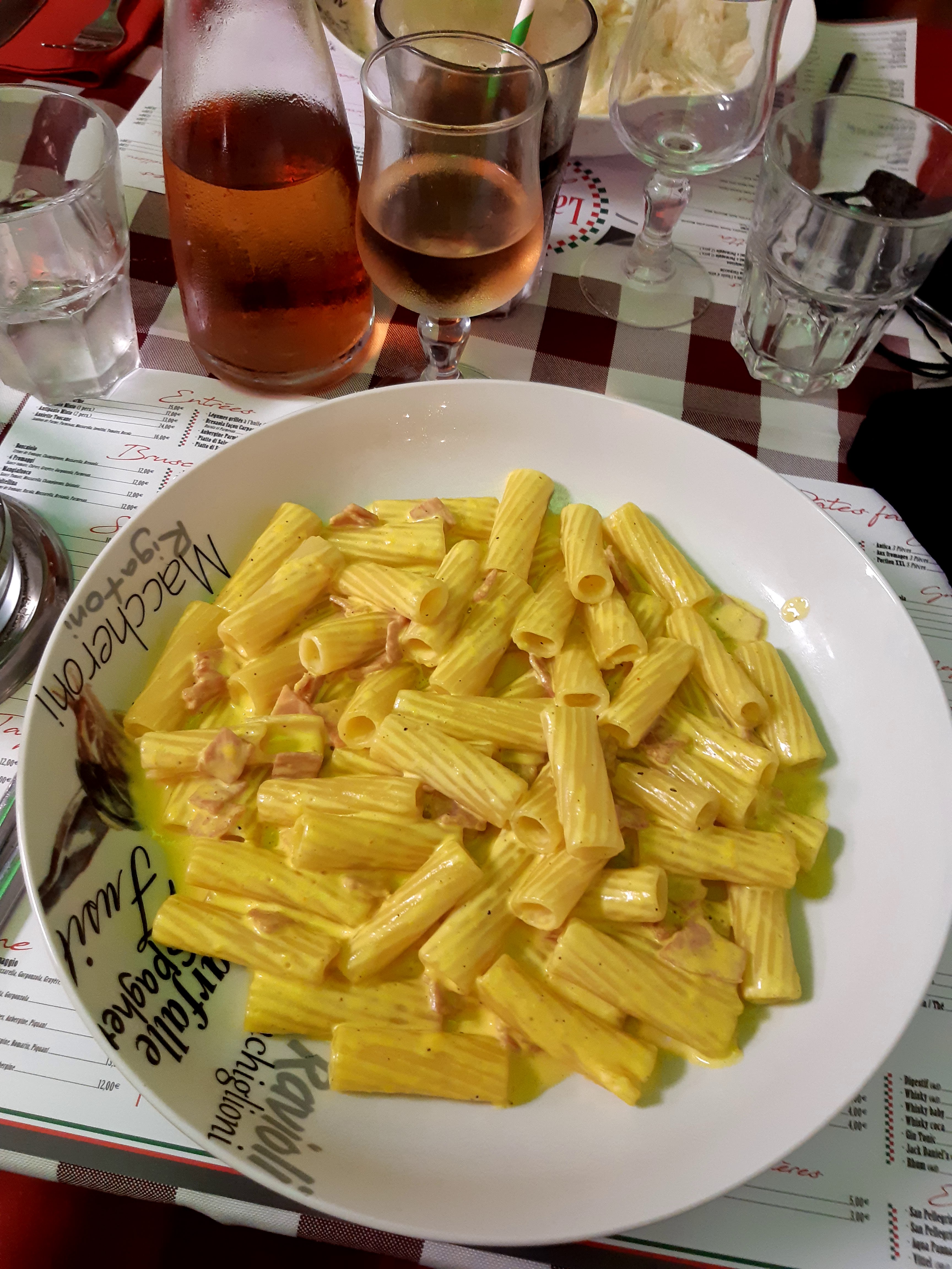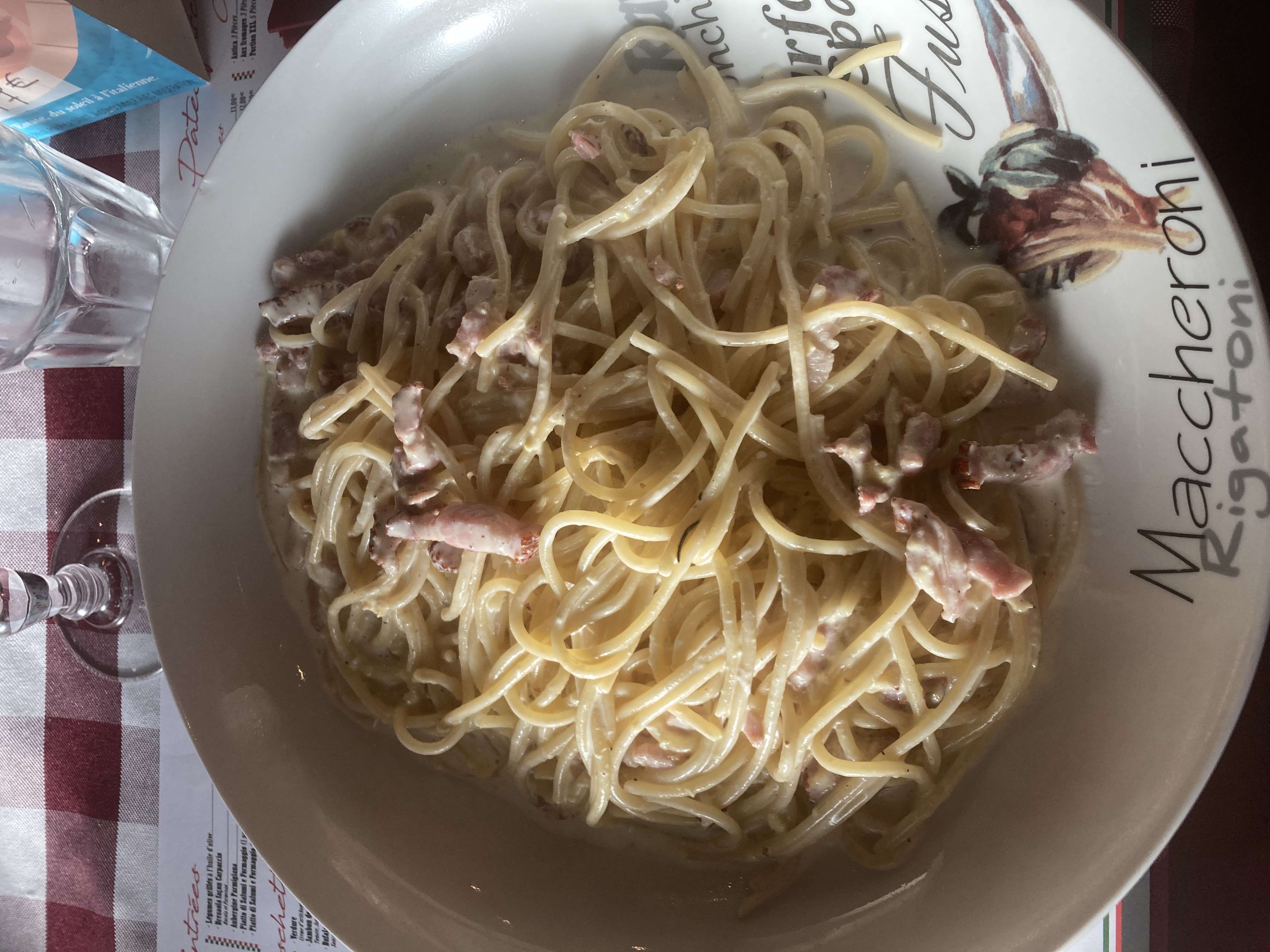 Bonne cuisine globale A part les linguine à la carbonara qui en sont pas vraiment la vraie carbonara c est avec la guancale du pecorino romano et des jaunes d œufs mais surtout pas de crème et de lardons( à bannir)