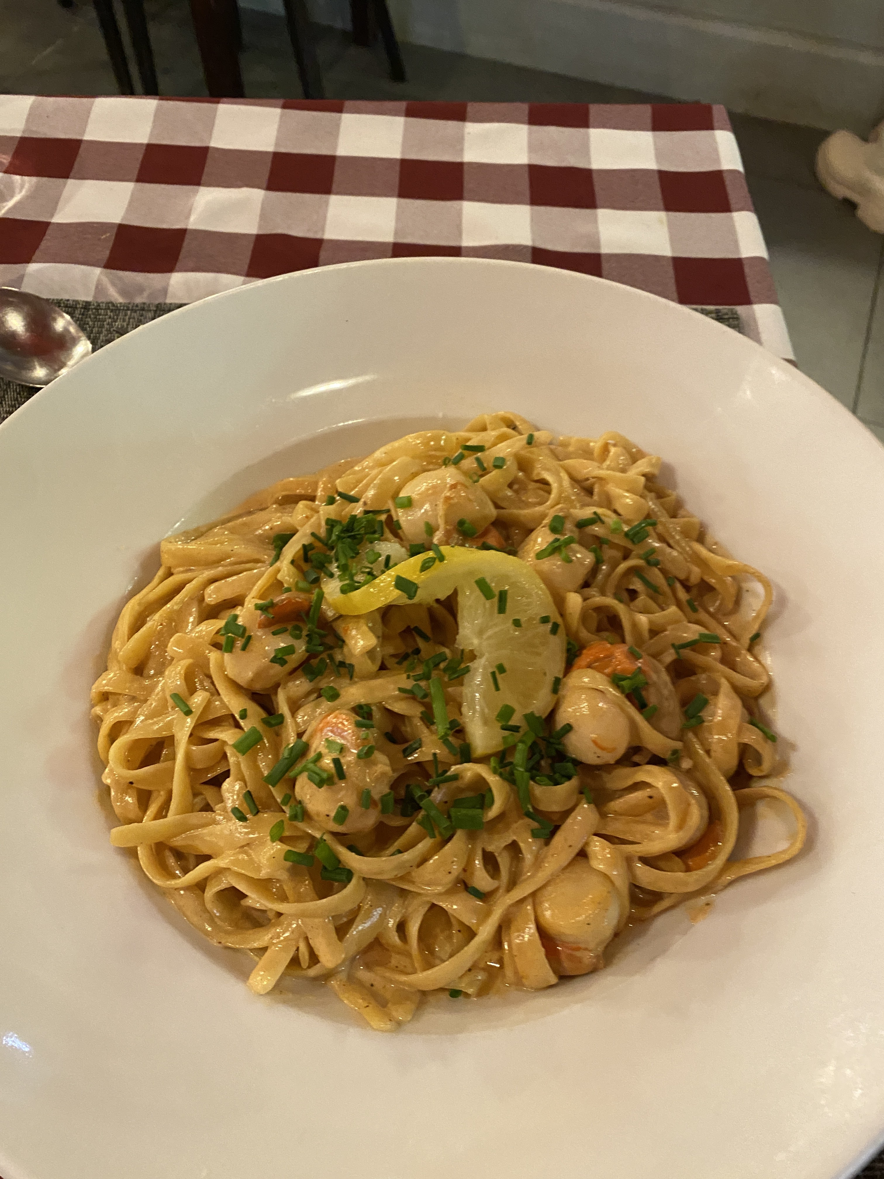 Je vais à la cantina depuis son ouverture et cette fois ci j'ai été déçue, rien à voir avec les pâtes du début d'Aldo. Deux noix de Saint Jacques uniquement dans mes spaghettis maresca, et très peu de gorgonzola... Dommage. Cependant l'accueil est très agréable