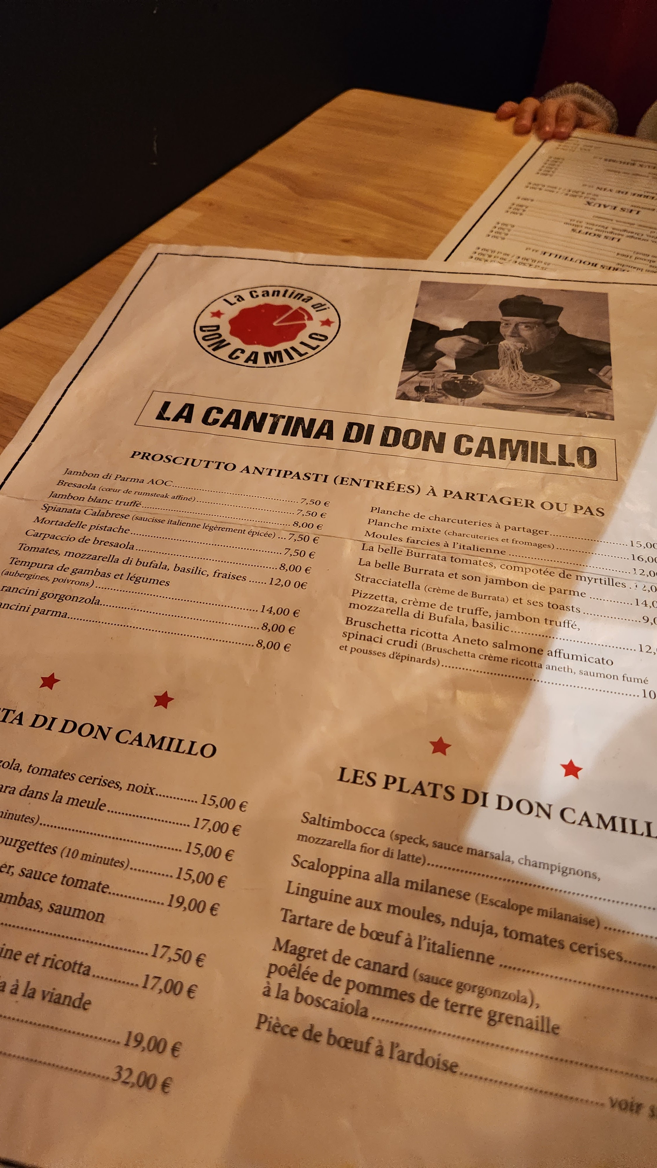 Belle petite découverte. Nous nous sommes arrêté au hasard car nous voulions un restaurant asiatique mais qui s'avérait fermé, et juste à côté on voit que la cantina di don camillo est ouverte. On se laisse alors tenté. Le serveur, tres gentil, nous accueille et nous place directement sur la dernière table libre avec un rehausseur pour enfant et on commande. Le plat pour enfant est juste d'une simplicité mais tellement efficace et tellement bon, et en plus servi très vite pour pas qu'il s'impatiente trop. Ensuite mon escalope milanaise, très bon, un peu huileux mais le goût y est. Les pâtes carbo et les lasagnes sont bien fait et aussi bon ( j'ai piqué dans les plats des autres pour gouter). Bref je n'avais pas grand chose à faire alors j'ai rédigé cet avis qui j'espère sera utile à quelqu'un qui veut tester ce restaurant. En tout cas moi j'y retournerai volontiers. Merci l'équipe