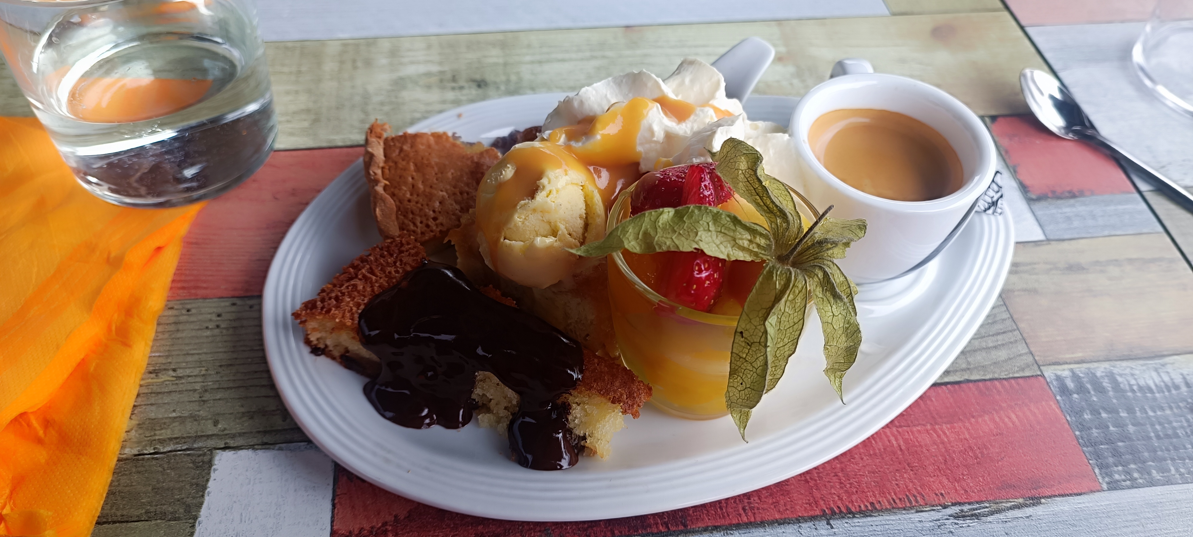 Service agréable et patient en ce début de saison. La salade césar est bonne, la bavette et le rougail aussi. Petit bémol sur la cuisson des coulants au chocolat mais rien de bien grave. Petite vue agréable sur les montagnes depuis la terrasse.