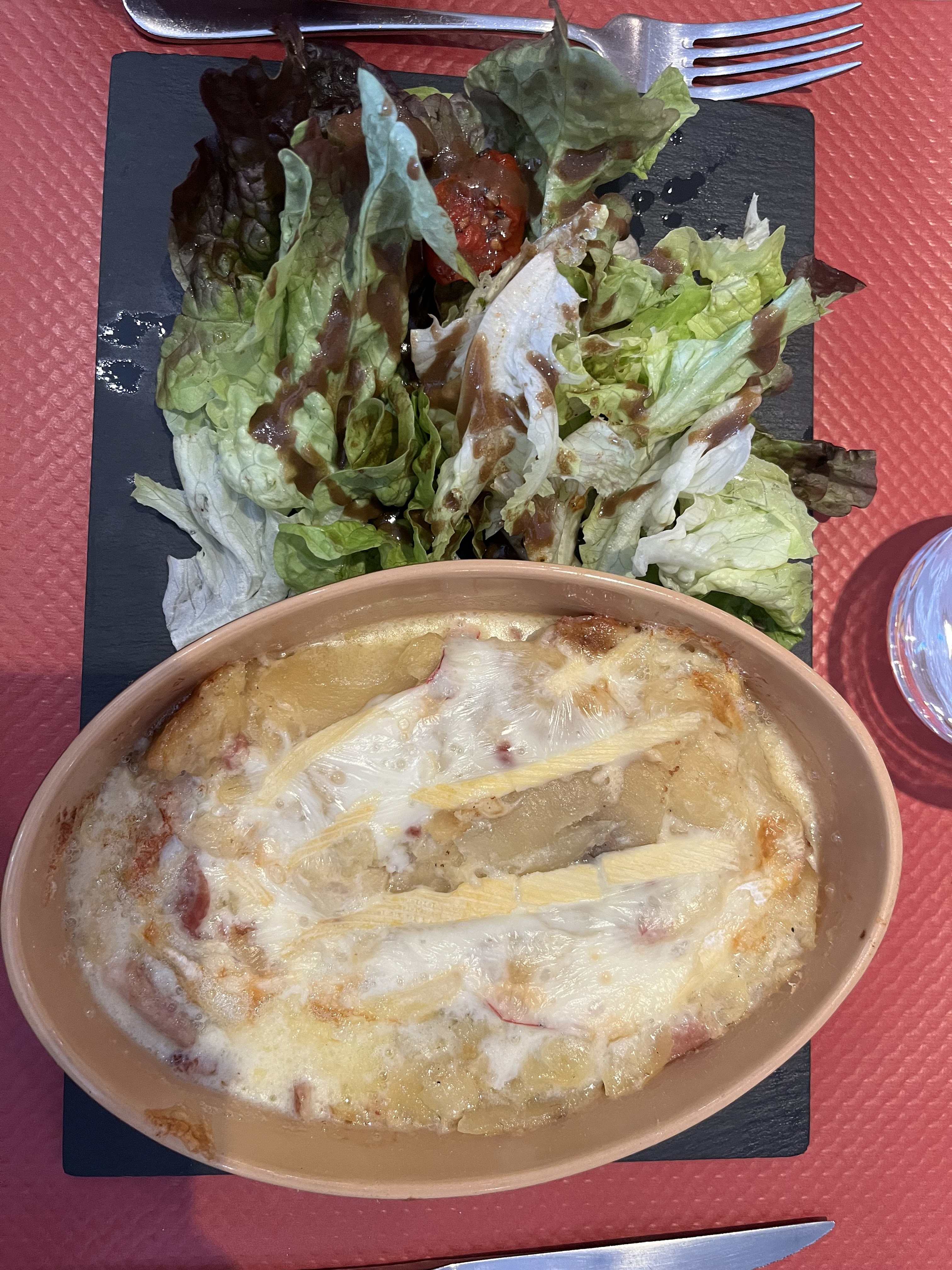 Arrivé seul, petite place pas trop loin du comptoir pour ne pas me laisser seul 😅. Tartiflette sympa (désolé sur la photo j'avais déjà tapé un peu dedans...), Peut être pas la meilleure mais toutefois très bonne, ni trop, ni trop peu, et la brioche perdue au caramel suggéré par une des serveuses, à se taper les fesses par terre (version polie), j'ai été tenté pour en reprendre.. Et surtout j'ai passé un très bon moment, le personnel a été -super- sympathique avec moi et pour moi, c'est aussi important qu'un bon plat (encore merci mesdames !)