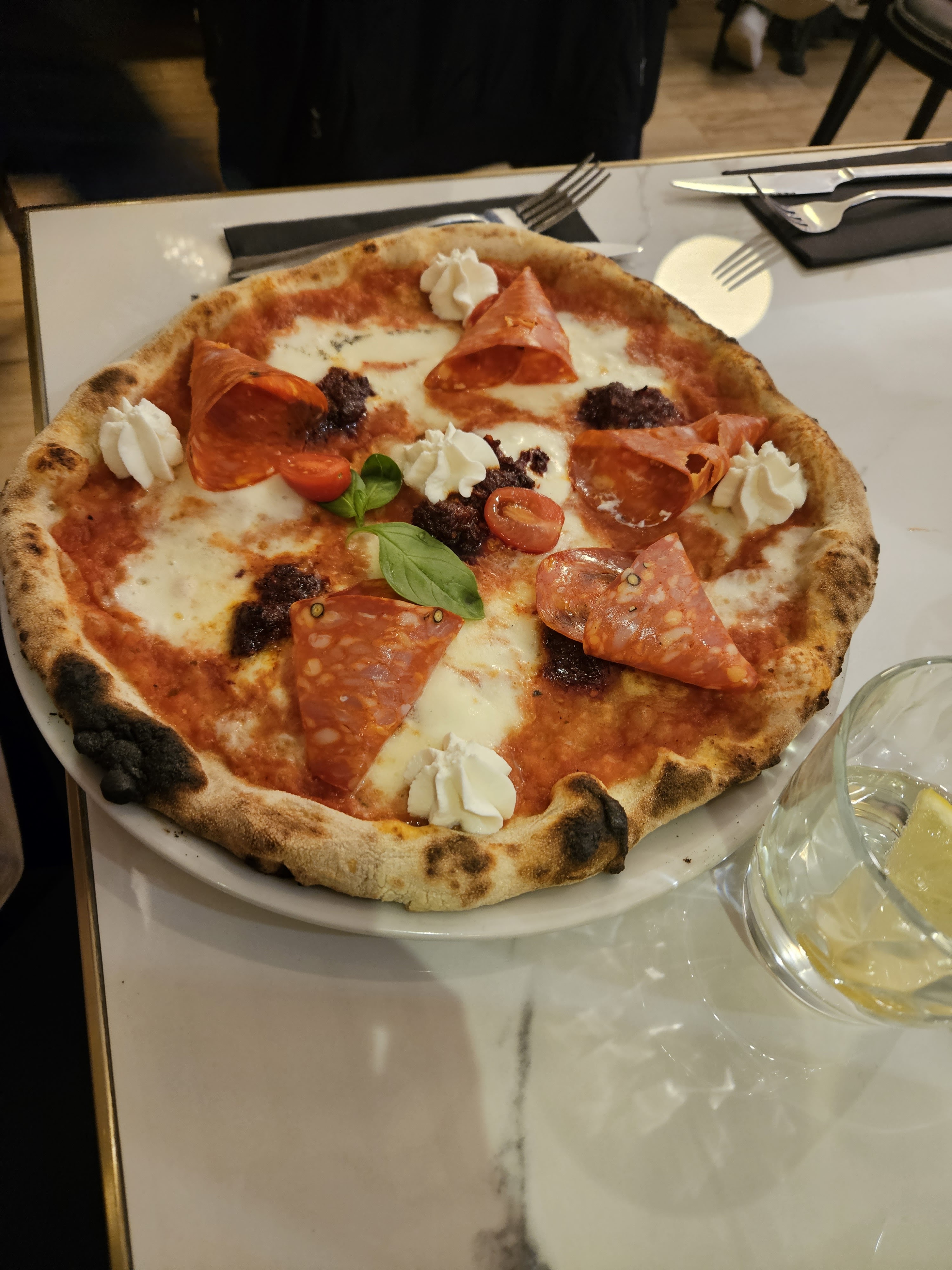J'y suis allé un vendredi midi. Nous avons mangé sous la verrière. Très jolie et très lumineuse. Superbe accueil, une belle déco et surtout : de très bonnes pizzas !! Mention spéciale pour la pizza aux truffes. Elles sont cuites dans le véritable four Napolitain qu'on peut voir derrière le comptoir Le dessert 'signature' est également super bon. Les serveurs sont calmes et pros. La prochaine fois, je testerai les cocktails qui ont l'air top ! Je recommande à 200%