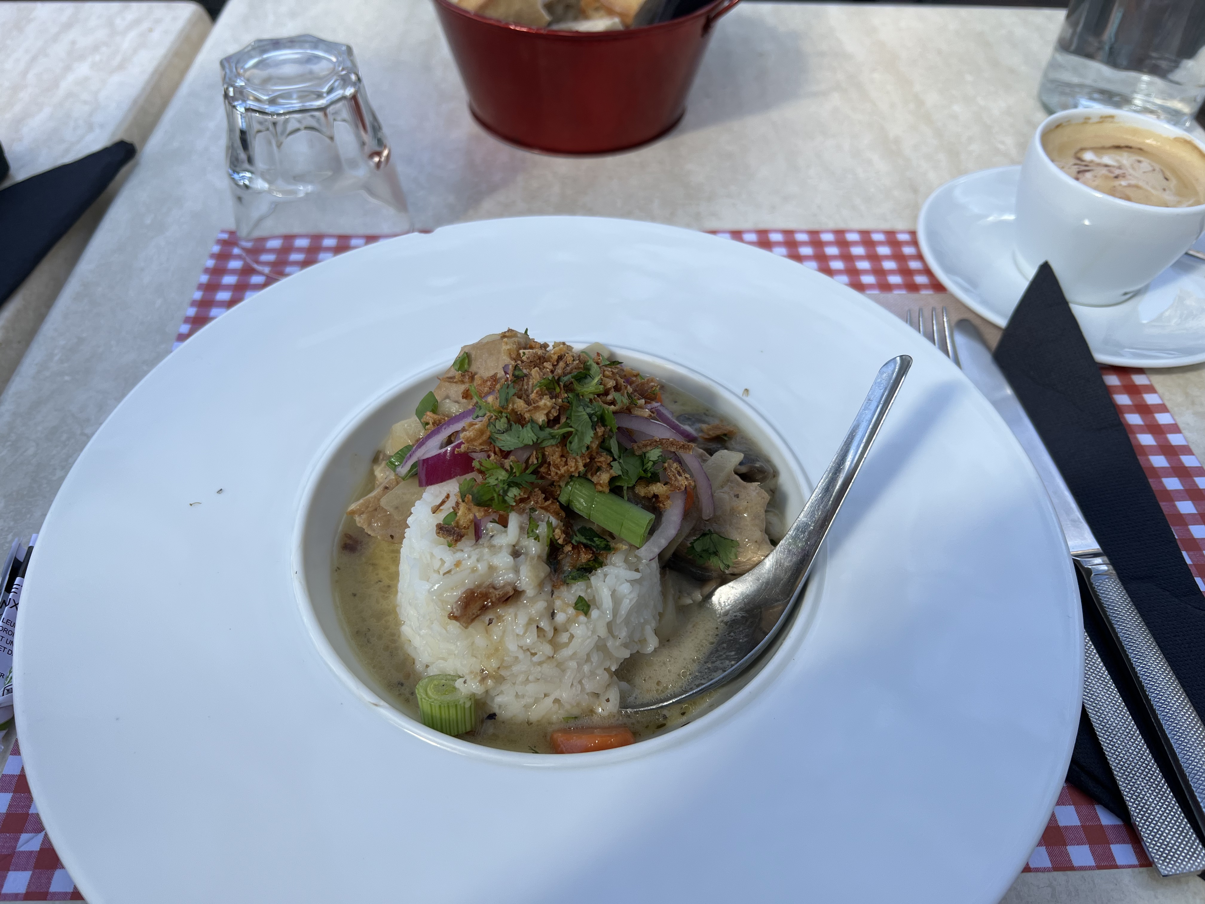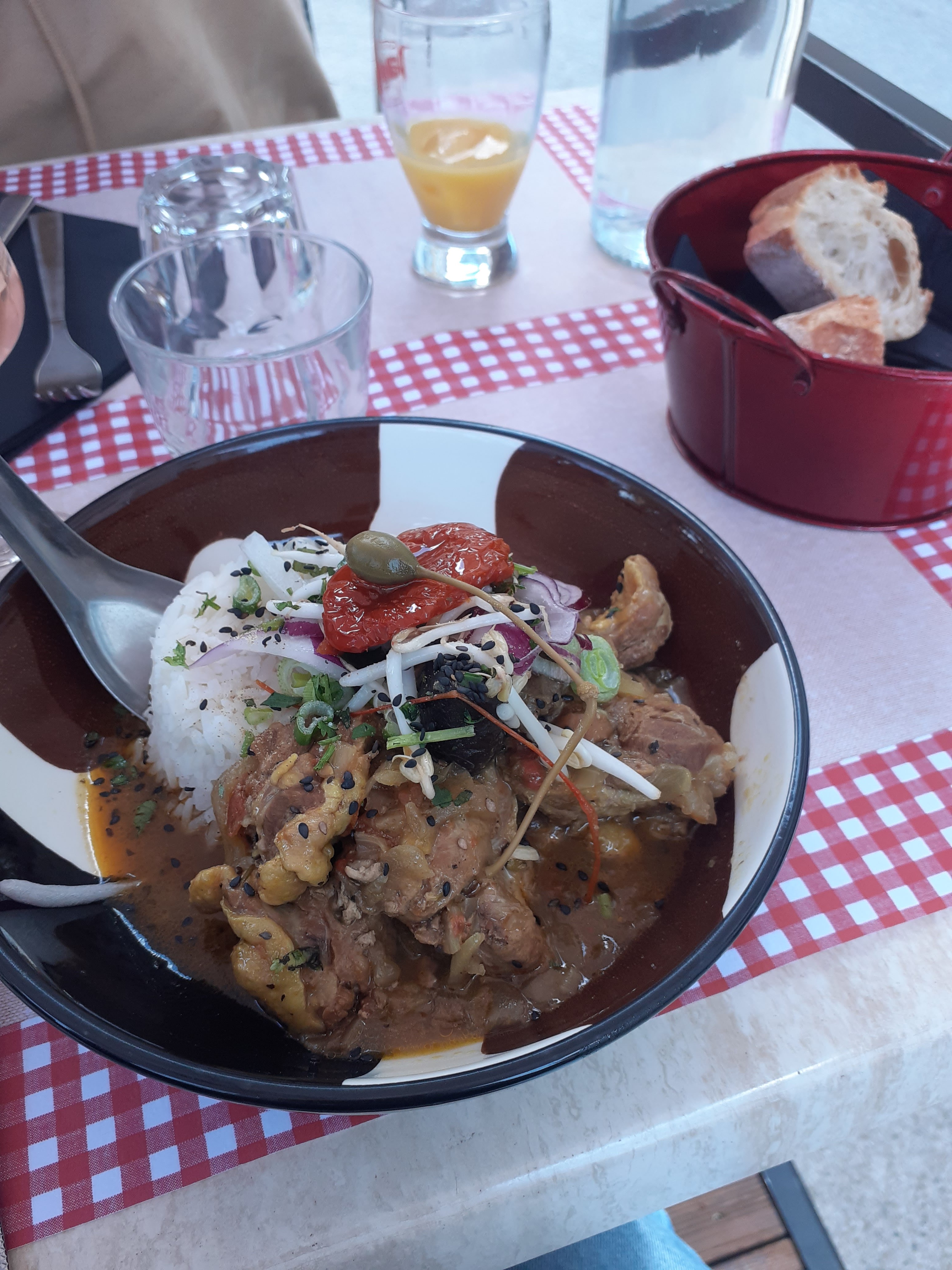 Très bien. Nous avons pris le plat du jour: Encornets au safran,lait de coco et riz thaï. Vraiment très fin. Nous nous sommes régalés. Et le prix très correct. Je vous conseille de réserver dès 18h pour avoir une table dehors . Une très bon moment.