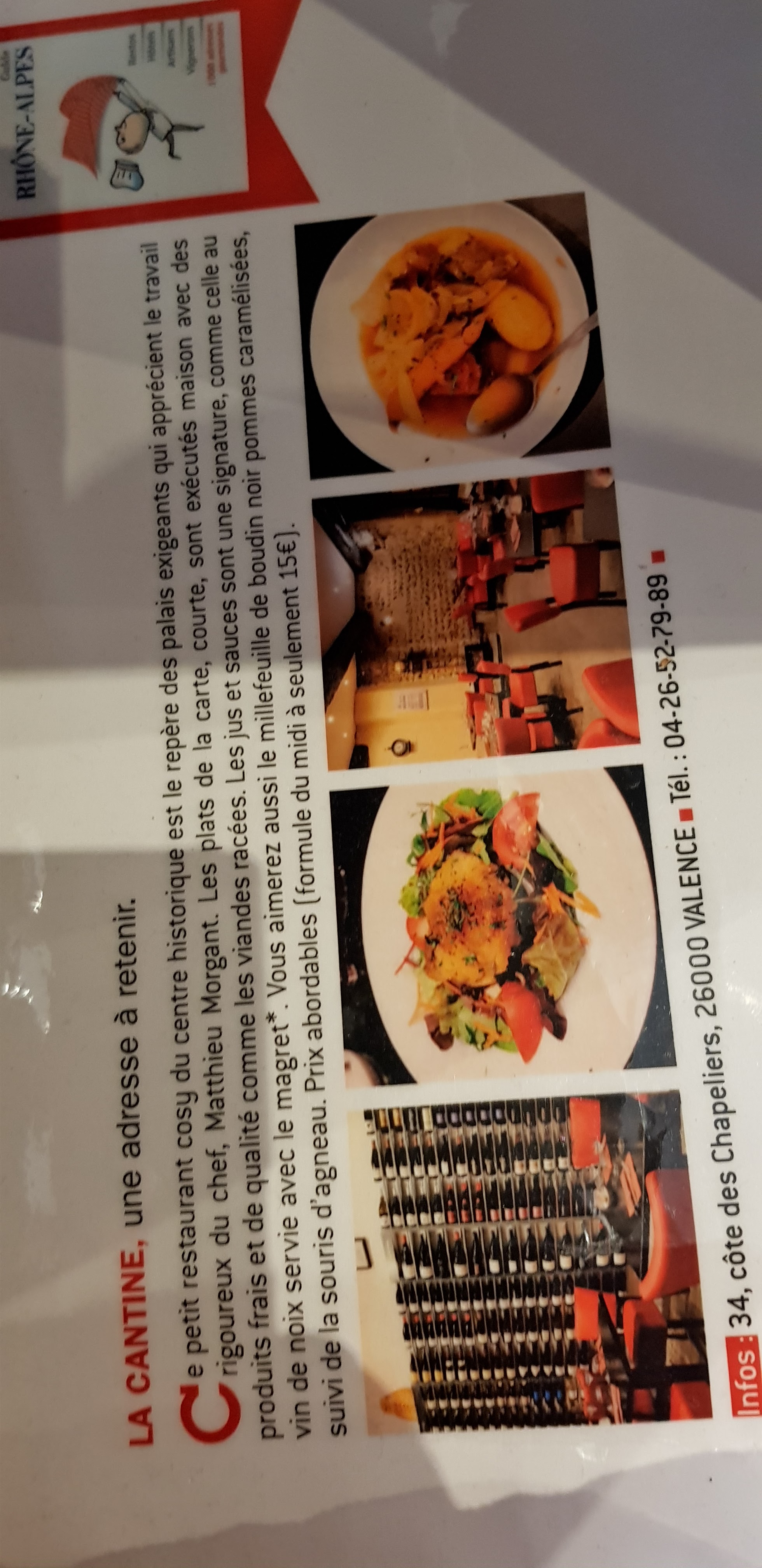 Voici toutes les informations sur le Restaurant français La Cantine qui ce trouve au 34 Côte des Chapeliers, 26000 Valence (26). Sur cette fiche vous trouverez les photos, l'adresse, les horaires d'ouverture, le numero de téléphone et les avis clients.Vous pouvez églement rédiger un avis si vous le souhaitez en bas de page.