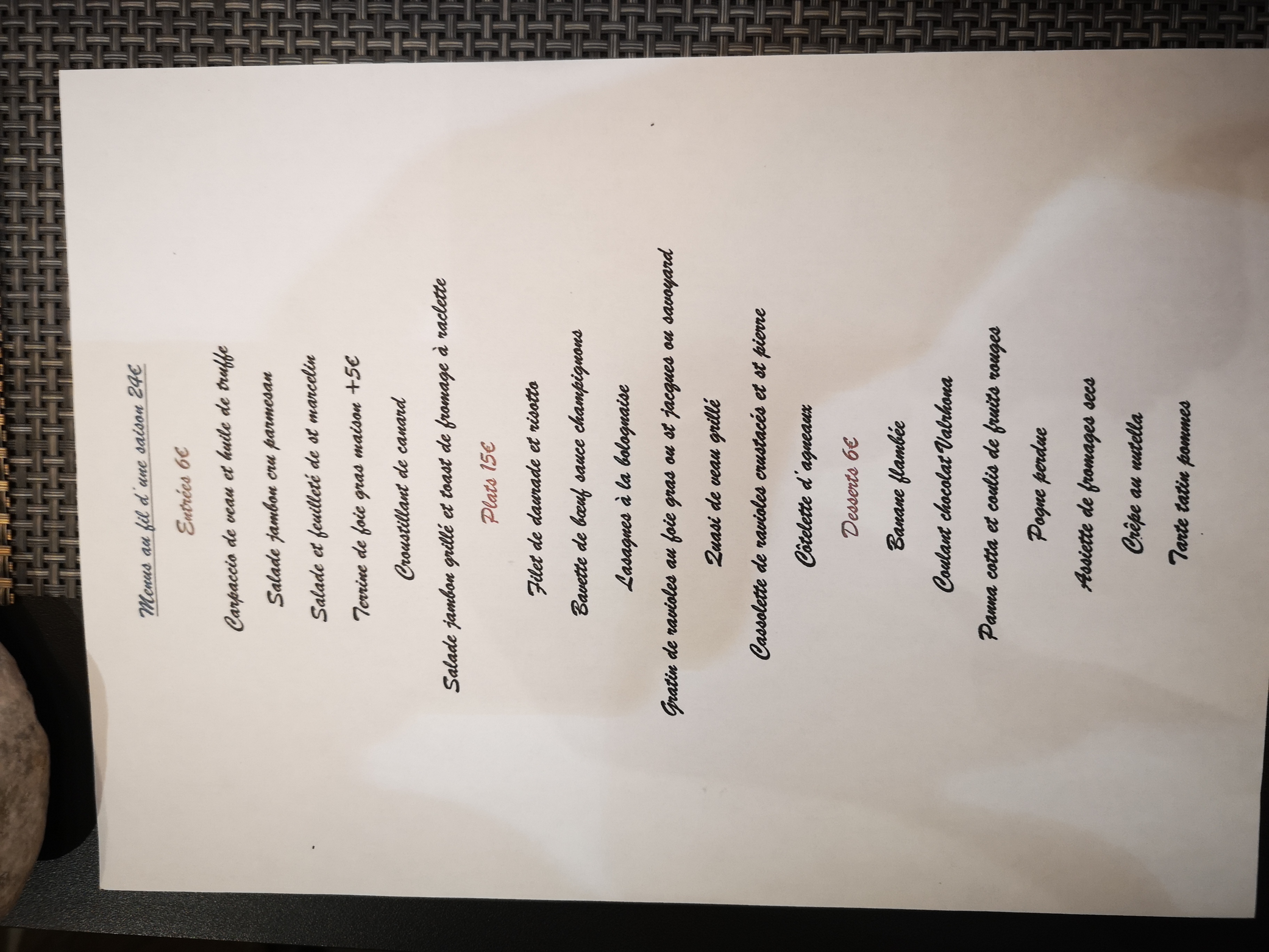 Carte hyper complète, originale tout en gardant les classiques français. J'adore le fait de pouvoir prendre 2 entrées ou 2 plats principaux comme menu. Ingénieux et qui permet à chacun de se faire plaisir. Plats de qualité gustativement et bien présentée. Merci
